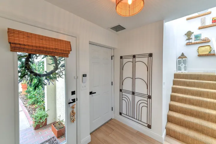 The front courtyard is gated, providing an extra layer of security and privacy. The kitchen features soft-close cabinets with pull-outs, adding functionality and sophistication. The durable quartz countertops and stainless steel appliances, with a transferable warranty, make meal preparation a breeze.