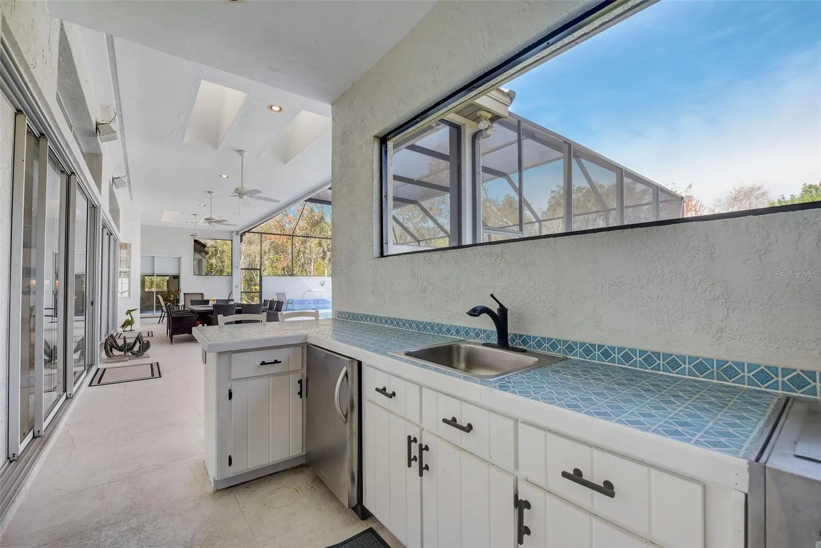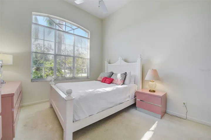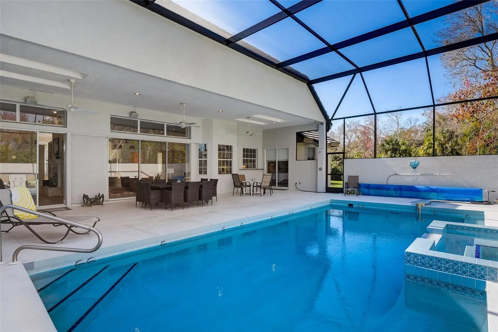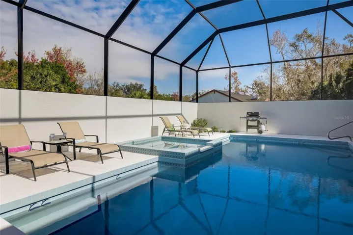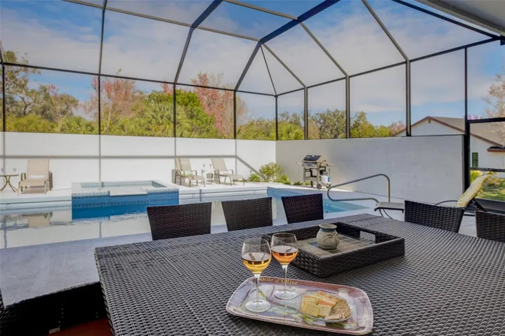 This beautiful 4 bedroom 4.5 bath pool home is spacious and expansive. Inside living hosts a split plan with 3 bedroom wing that can be closed off. Each bedroom has an en suite bathroom plus powder room off main living area. Enormous kitchen with large breakfast bar and table seating. Open and bright with sliders overlooking the sizable pool and deck area with total privacy for the bar/kitchen area with outdoor grill. Three poolside dining tables with seating for 16+ with chaise lounge chairs.