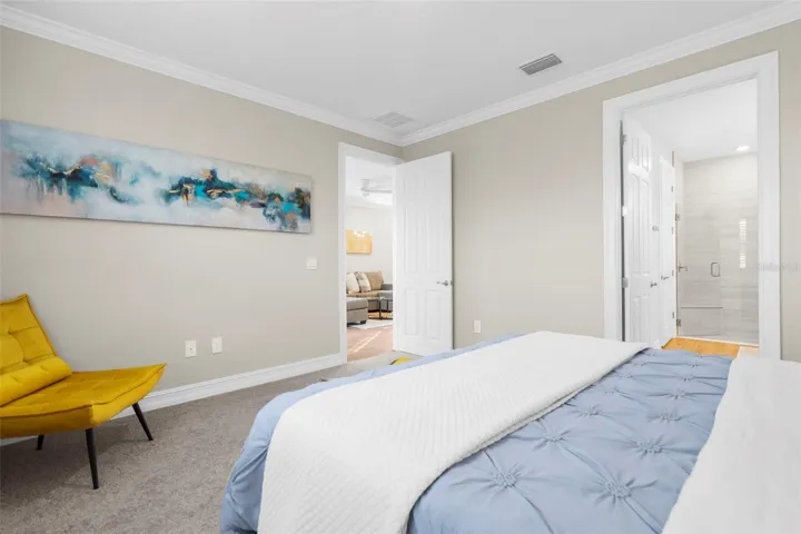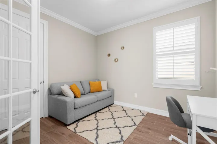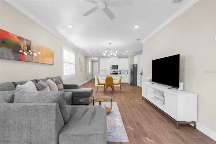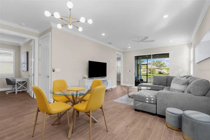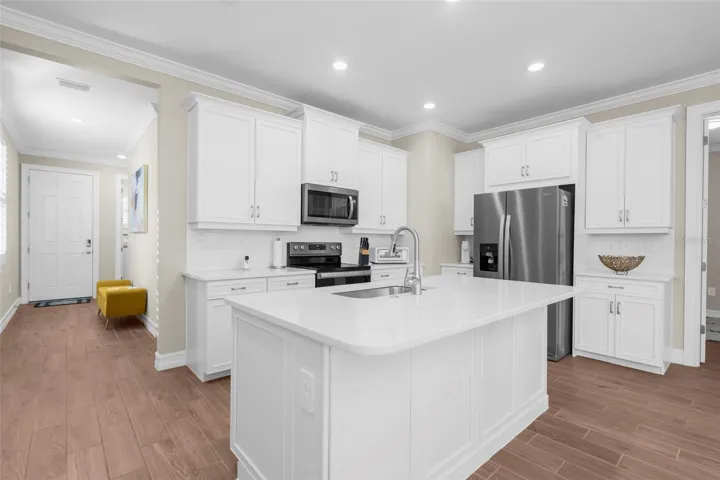The open floor plan boasts wood-look tile flooring, crown moldings, plantation shutters, and a chef’s kitchen with quartz counters, stainless steel appliances, and a large walk-in pantry. Relax in the great room or on the screened lanai overlooking SERENE LAKE VIEWS. The primary suite offers a private retreat with water vistas, a walk-in closet, and a luxurious en-suite bath.