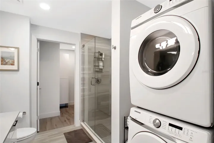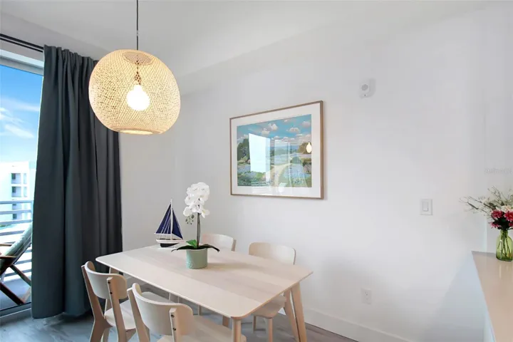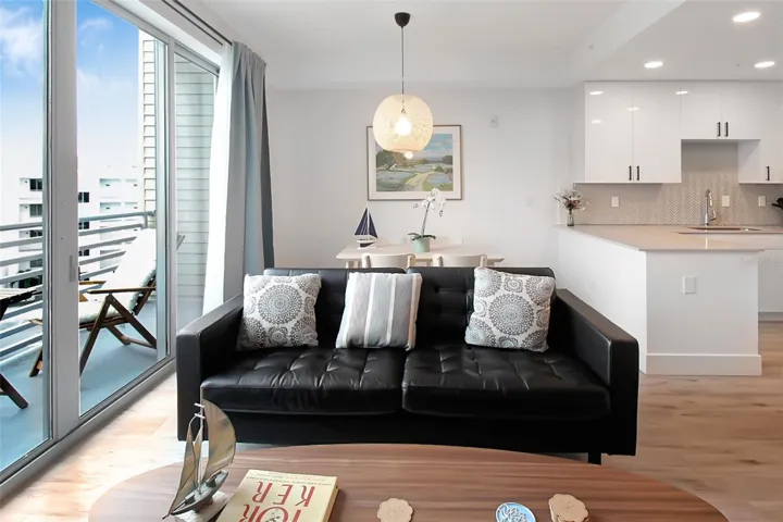 At the end of the hall, the main living space beams with natural light from the sliding glass doors. The living room, featuring a plush sofa and a Smart TV, opens to a balcony with outdoor seating for two, perfect for enjoying your morning coffee while overlooking the pool and distant views of Sarasota Bay. In the evening, unwind and take in the stunning sunsets over the Gulf after a long day at the beach. The sleek kitchen boasts stainless steel appliances, and the dining table seats four comfortably.
