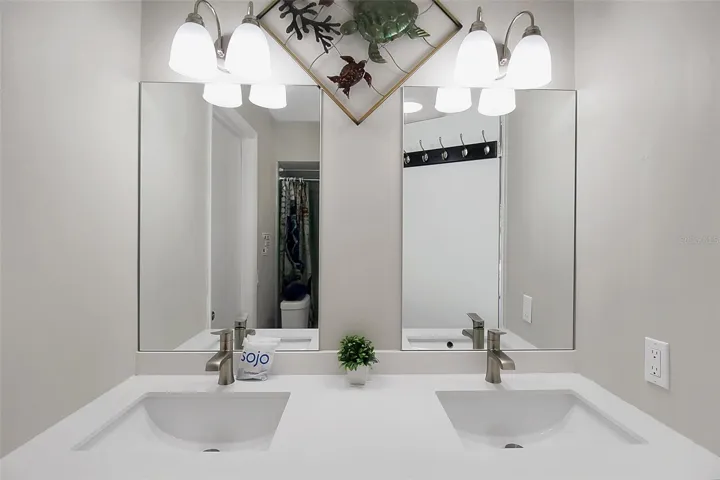 The second bathroom is well-appointed with a dual vanity and a walk-in shower, catering to the needs of your family and friends. The home features two separate living room spaces, both designed for unwinding and enjoying quality time. Whether you’re watching your favorite shows, reading a book, or simply enjoying the ambiance, these living areas offer the perfect setting.