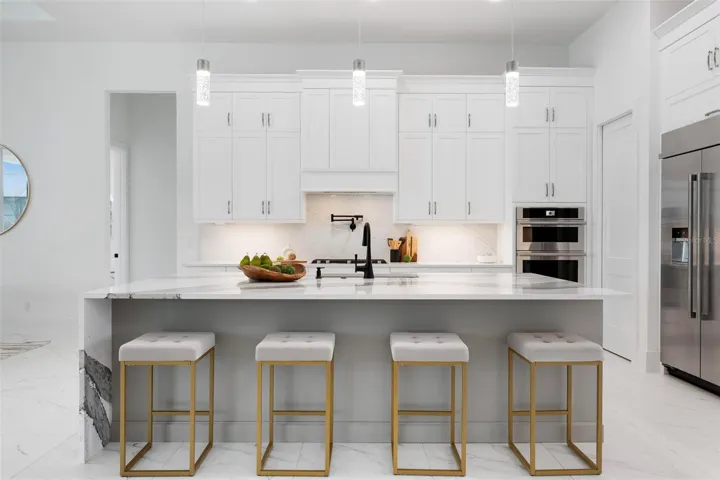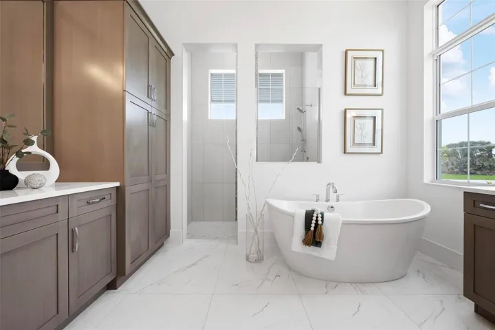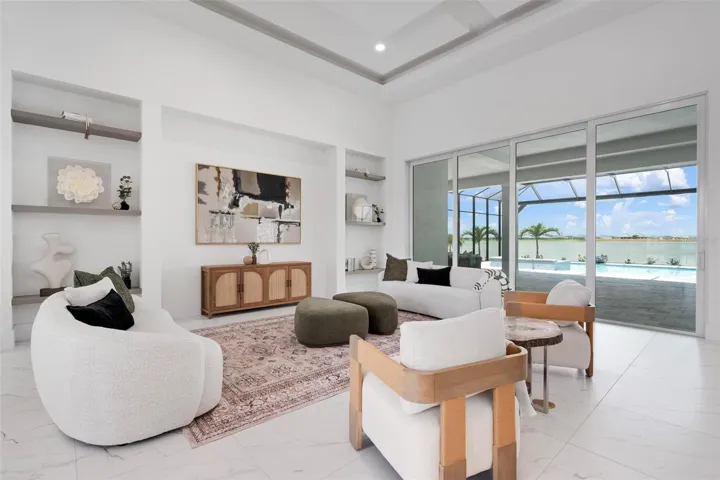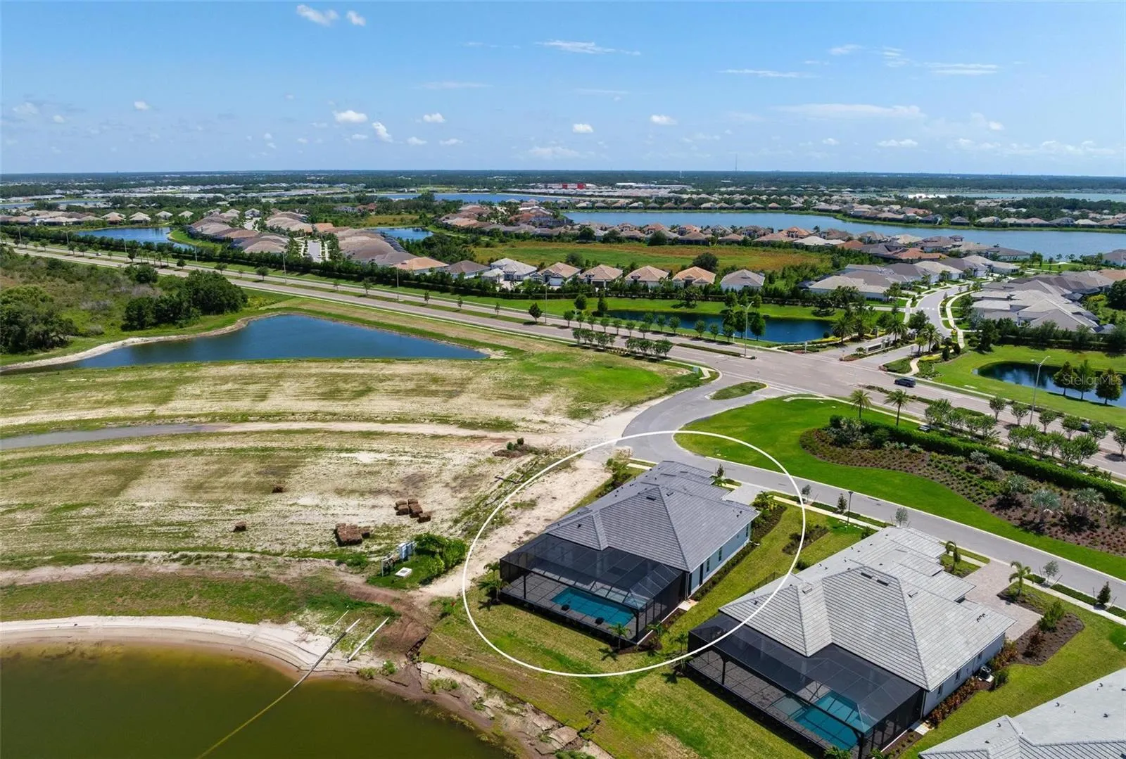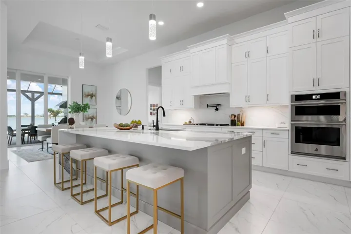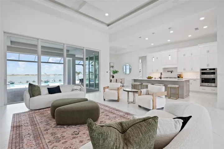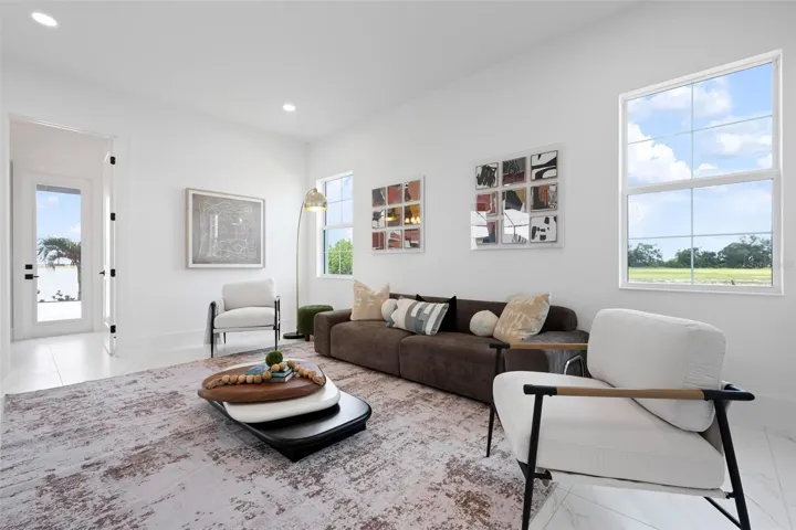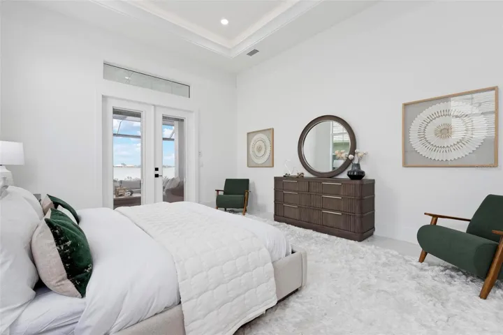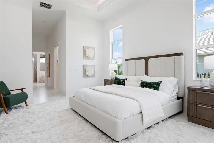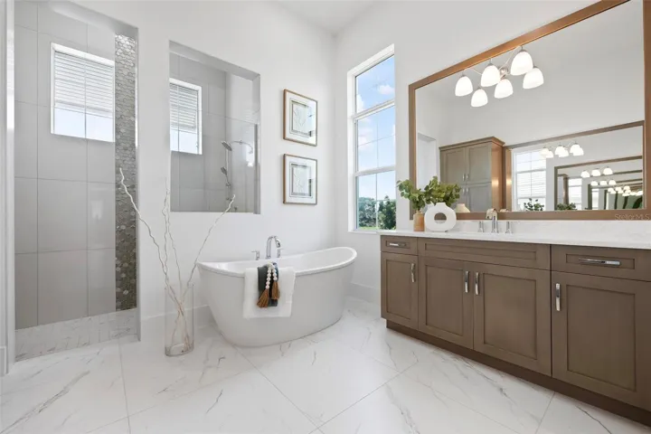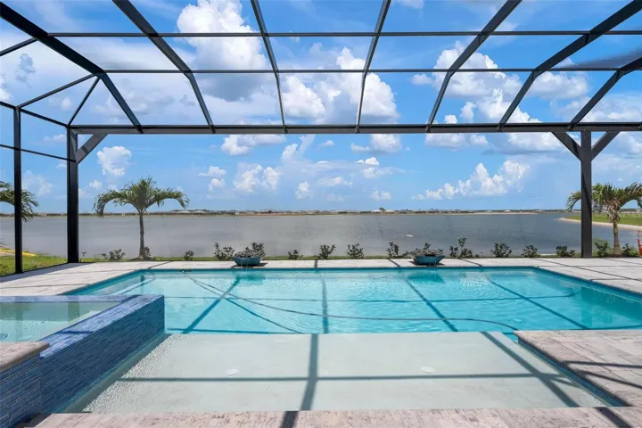 Recently staged and completed Madison 2 by Stock Luxury Homes with expansive lake views, why wait for the builder, when you can move in now? Experience the pinnacle of elegance in this modern luxury home, where breathtaking lake views and superior craftsmanship converge. Designed for those who value sophistication, this property offers a harmonious blend of timeless style with state-of-the-art functionality. Spectacular lake views frame the serene beauty of the lake, drawing natural light and picturesque views into almost every room. Equipped with premium Jenn Air appliances, sleek countertops, and custom cabinetry, this kitchen is a culinary dream. Master suite includes two ample walk-in closets with wood shelving, expansive views of the pool and lake beyond, and the master bath will wash you in luxury with its large roam-in shower, free standing tub, and clean crisp finishes. Contemporary finishes, high ceilings, and an open floor plan create a light and airy ambiance which is perfect or both relaxation and entertaining. Seamless access to the expansive pool area will enhance your connection to nature while providing the ideal setting for hosting gatherings or enjoying quiet moments. Located in the emerging Wild Blue community, recreation facilities include tennis courts, a fitness center, and fishing access along with miles of sidewalks. Schedule your private tour today and discover this perfect blend of tranquility and modern living.
