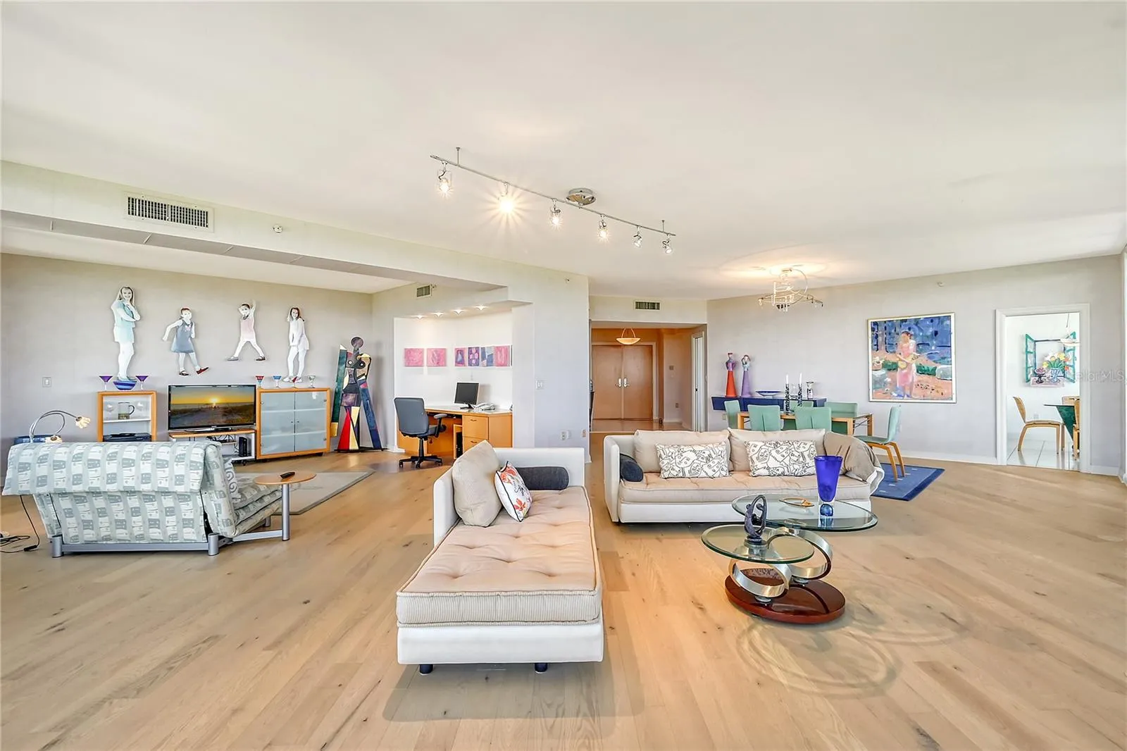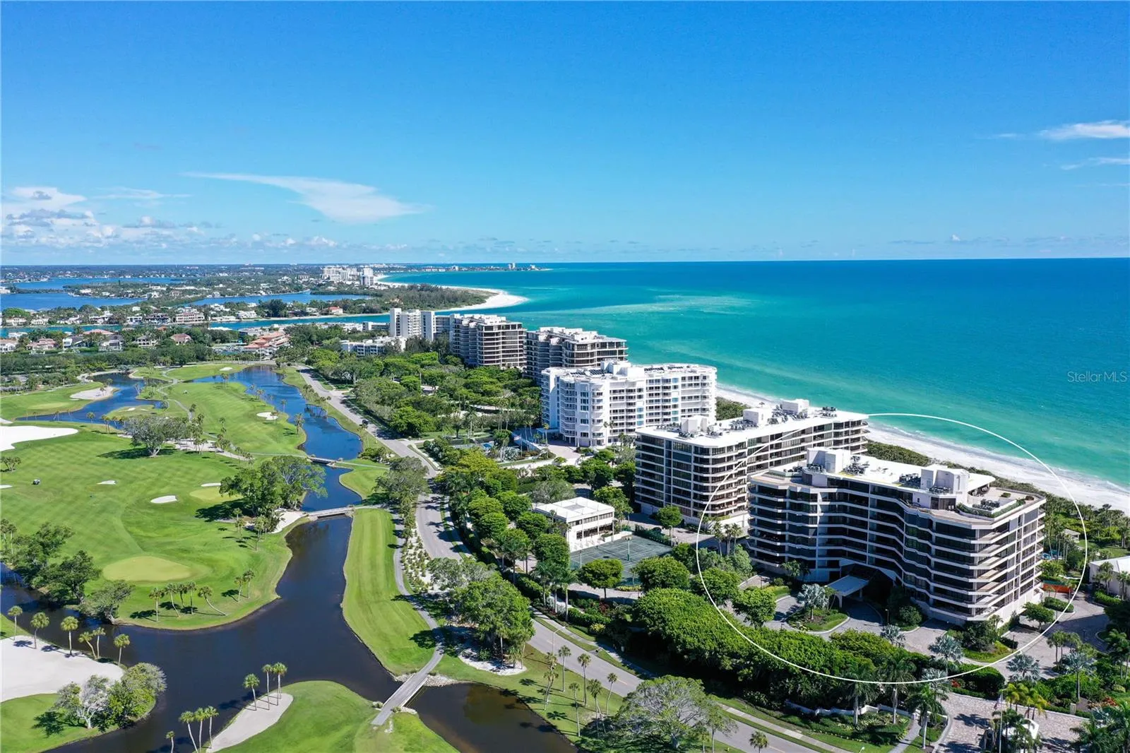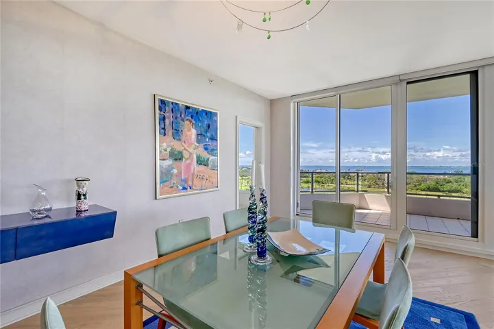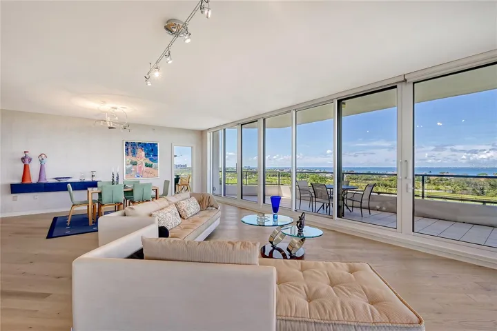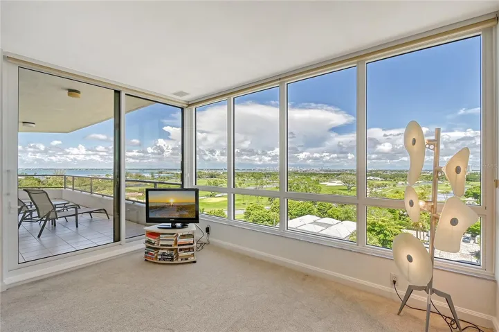 Perched on the eighth floor of Building III in a tranquil south corner location, this sun-drenched Sanctuary residence offers breathtaking panoramic views of Sarasota Bay and downtown’s skyline through newly installed (2023) impact glass sliders and windows with Hunter Douglas window treatments. Spanning nearly 2,400 square feet, the open concept interior awaits your personal touch to transform it into your ideal island retreat. Enjoy morning sunrises from the wraparound east terrace accessed through walls of impact glass sliders. Enter through double doors into a spacious foyer leading to a 30’ living/dining room with expansive floor-to-ceiling glass walls, beautiful wood flooring, and panoramic views that add to its sunny ambiance. The light-filled eat-in kitchen boasts an island, built-in ovens, pantry, and a charming dining nook surrounded by bay windows with terrace access. The secluded master retreat features its own bay terrace access, his/her walk-in closet with plenty of built-ins, and an en-suite marble bathroom with a water closet. A guest suite and den, easily convertible into a third bedroom, complete the split plan layout for optimal privacy. Included with this special residence is one under-building parking space and additional owner’s storage. Life at The Sanctuary, within the gated Longboat Key Club community, offers a resort-style lifestyle. Residents enjoy amenities such as a Gulfside swimming pool with cabanas, extensive sundeck, outdoor bar, heated pool and spa, tennis courts, fitness center, clubhouse activities, and a boardwalk to deeded beach access. The community also features a 24-hour manned guard gate and on-site management, ensuring security and convenience. For an even greater level of indulgence and relaxation, consider becoming a member of the renowned Longboat Key Club, available for purchase separately. This prestigious club offers access to world-class amenities, including immaculate golf courses, top-notch tennis facilities, a resort-style pool deck, a fully equipped fitness center, rejuvenating spa services, an array of exquisite dining options, and first-rate marina facilities. Live surrounded by luxury and natural beauty at The Sanctuary.
