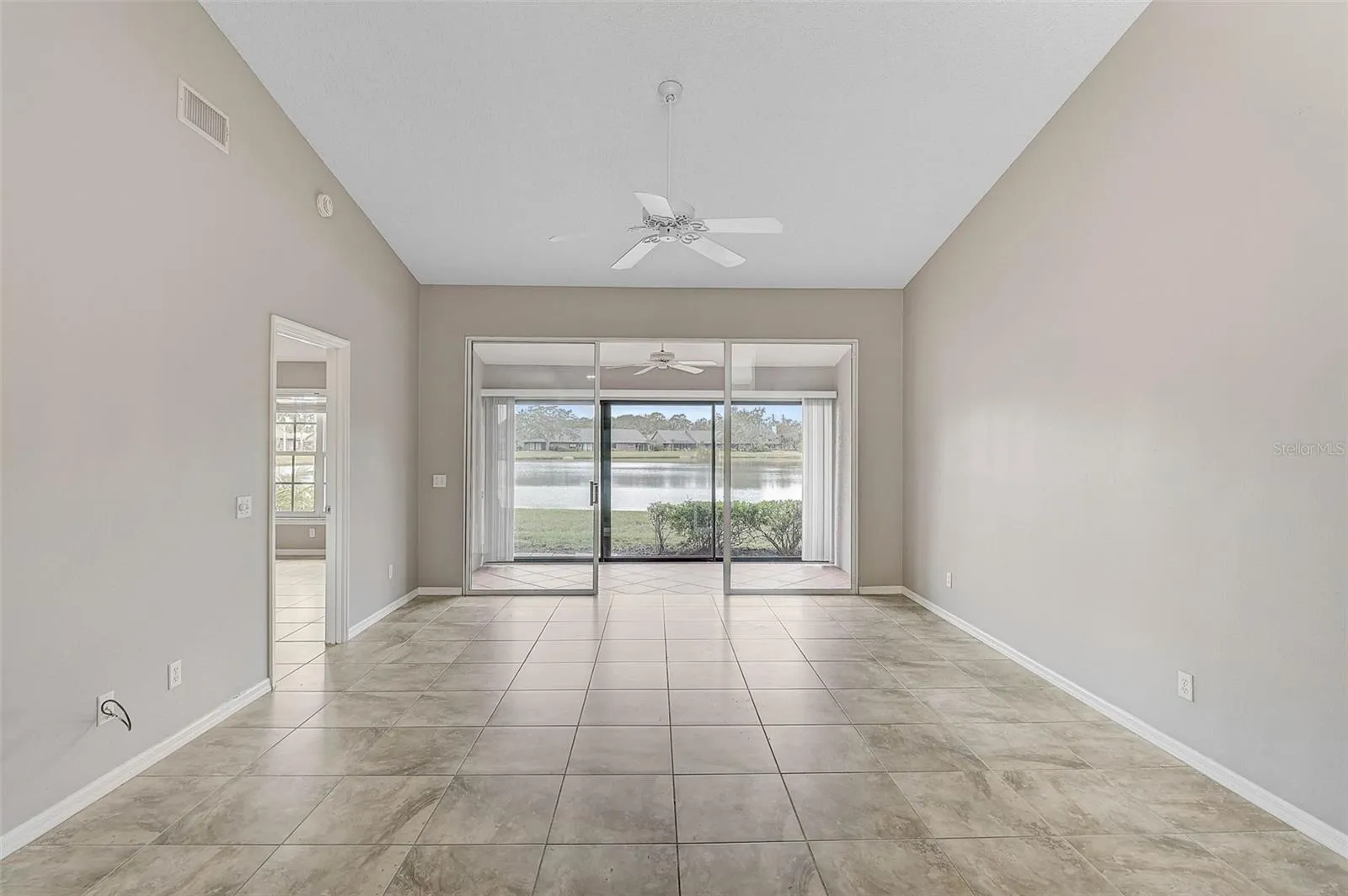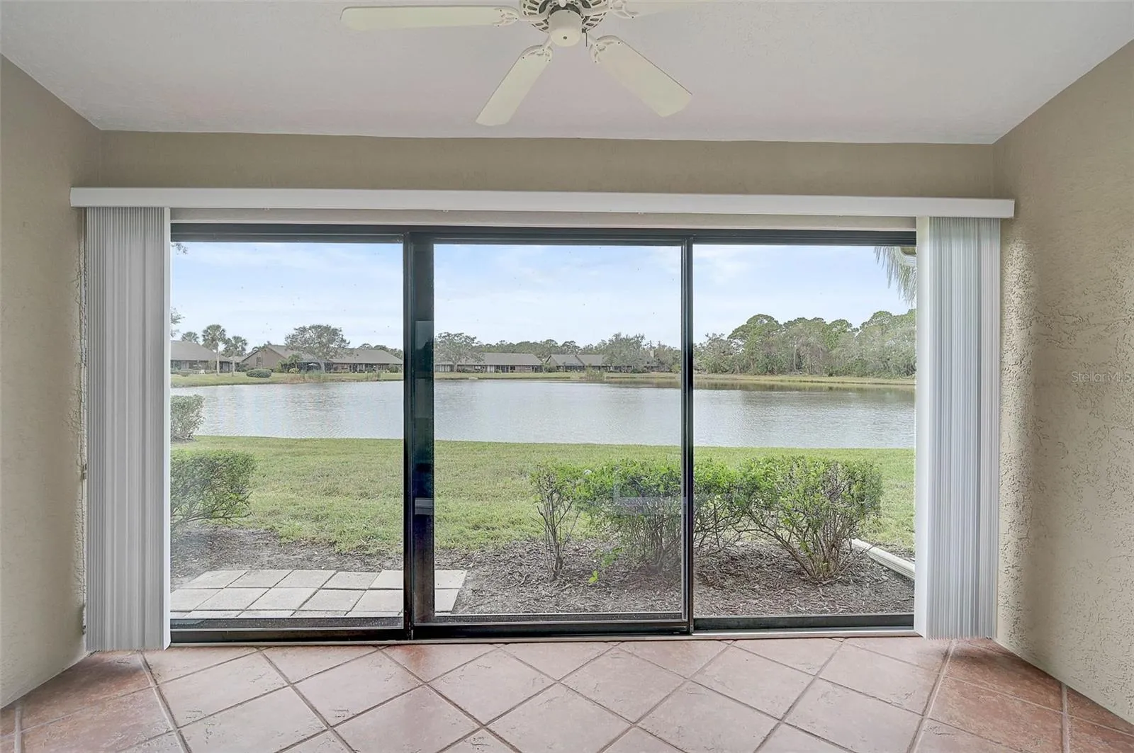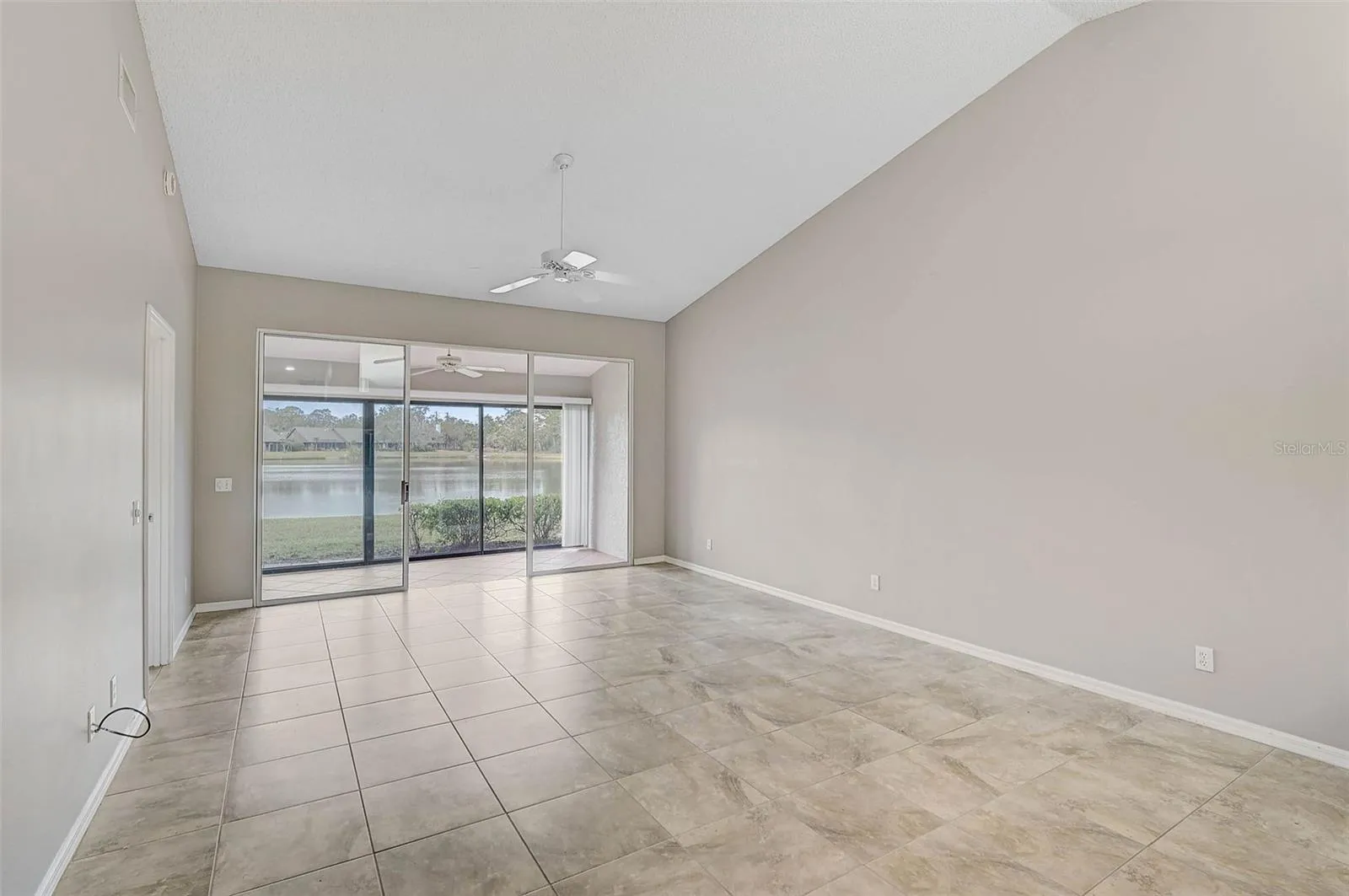 The kitchen boasts newer stainless-steel appliances and opens seamlessly to the spacious living and dining area—ideal for entertaining or everyday living—with room to add an island or dining table. Stylish tile flooring flows throughout, and ceiling fans in every room ensure year-round comfort. Unwind on the enclosed lanai and enjoy serene sunsets over the lake, or take a short stroll to the heated community pool and gazebo for a peaceful retreat by the water.
