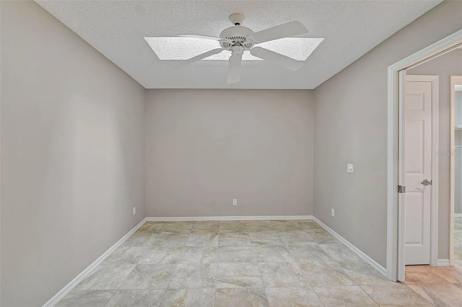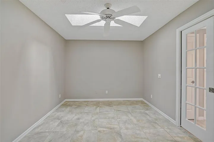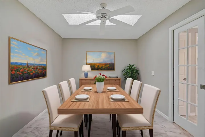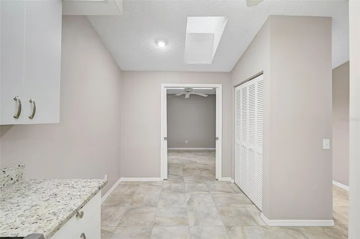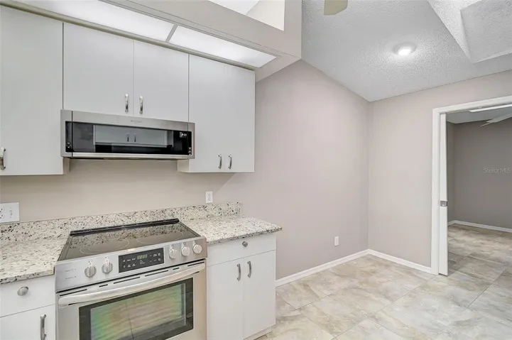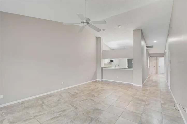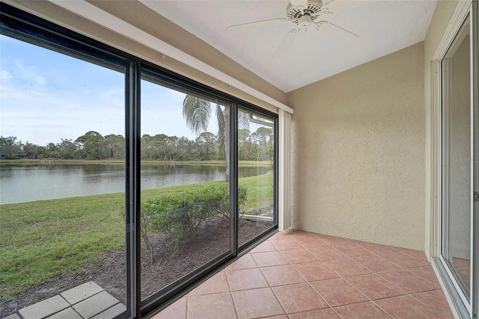 The kitchen boasts newer stainless-steel appliances and opens seamlessly to the spacious living and dining area—ideal for entertaining or everyday living—with room to add an island or dining table. Stylish tile flooring flows throughout, and ceiling fans in every room ensure year-round comfort. Unwind on the enclosed lanai and enjoy serene sunsets over the lake, or take a short stroll to the heated community pool and gazebo for a peaceful retreat by the water.