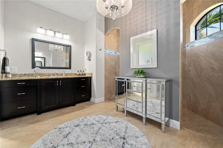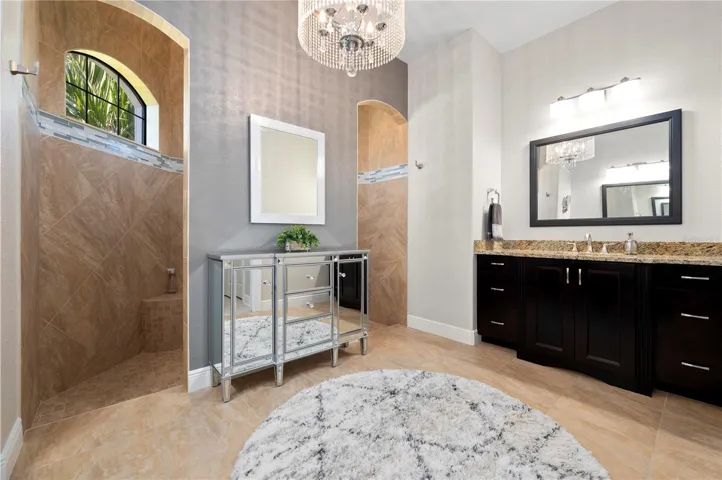 The owner’s suite is a spa-like retreat, offering a large bedroom with dual walk-in closets and a luxurious bath featuring furniture-quality dual vanities, granite counters, a Roman shower with rain head, multiple shower heads, arched entries, designer tile, and an elegant chandelier. A private water closet and refined finishes elevate the experience.