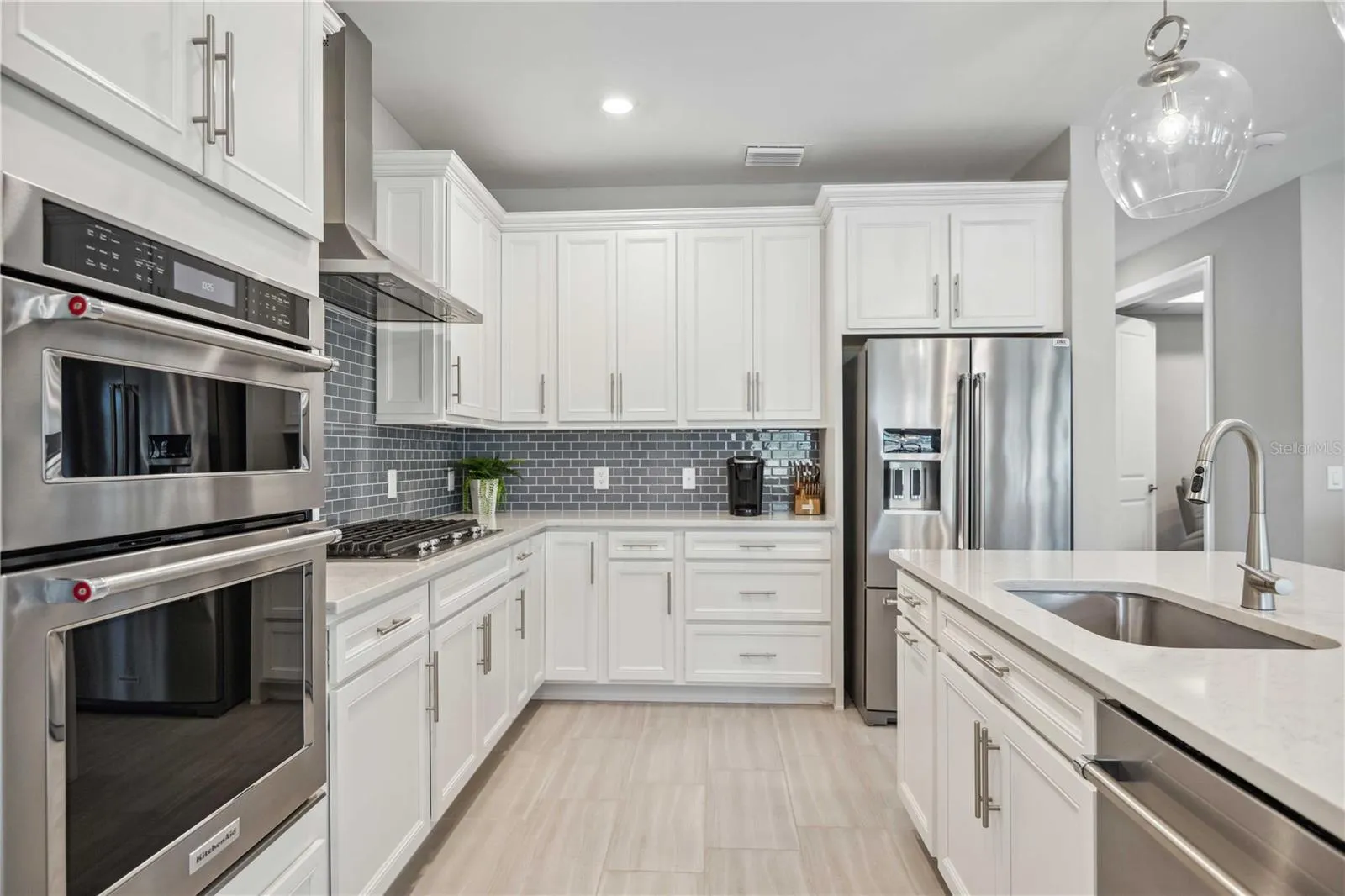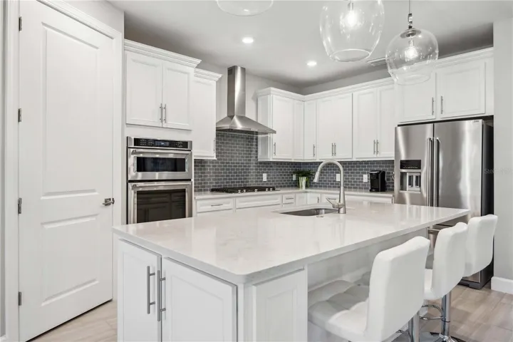 The chef’s kitchen impresses with quartz countertops, stainless steel appliances, an oversized island, and abundant storage—perfect for both entertaining and everyday living. The main floor private primary suite features a spa-inspired bath and expansive walk-in closet.
