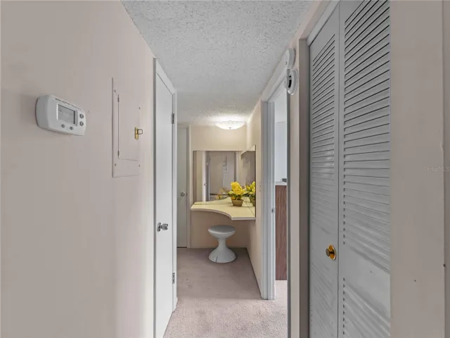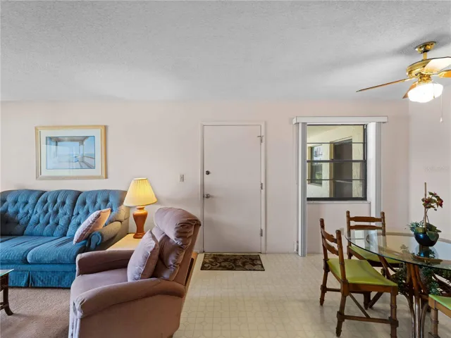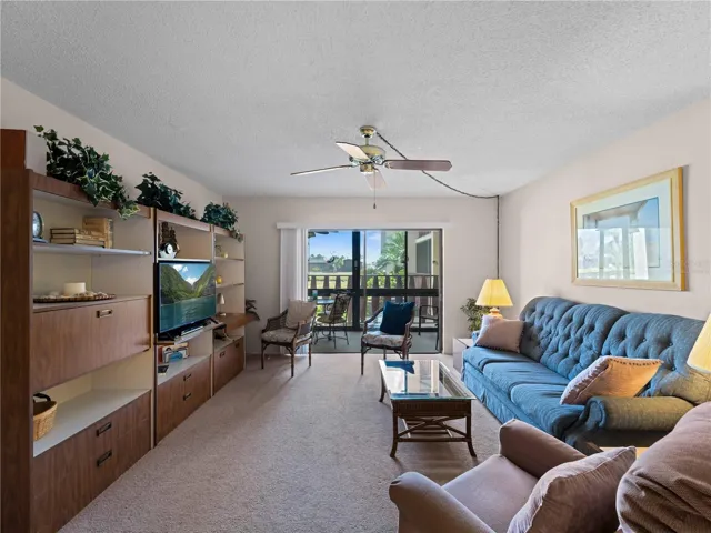 Inside, the light and airy living room is framed by a welcoming neutral palette, with cozy carpet underfoot and sliding glass doors that flood the space with natural light. Step outside to your private lanai, where you can relax and take in the verdant surroundings.
