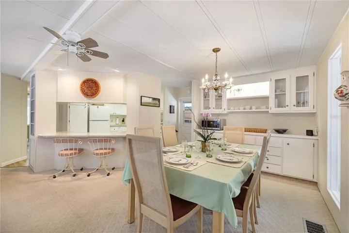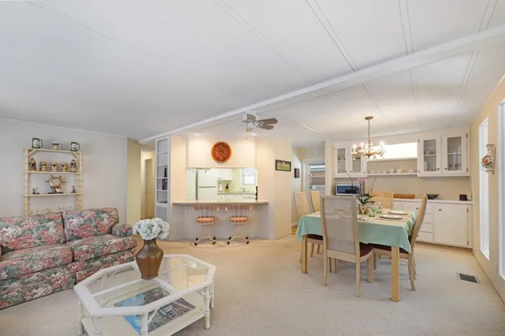 This spacious 2-Bedroom, 2-Bathroom home with upgraded bonus Room is turnkey ready, fully furnished and ready for occupancy. Golf cart is negotiable separately. This floor plan offers a spacious layout perfect for comfortable living and entertaining seasonally of all year long. Featuring two generously sized bedrooms each with a walk-in closet, two full bathrooms and a large bonus room that fills with afternoon light. The primary suite includes an en-suite bathroom with a large vanity and walk-in shower. The second bedroom offers ample space for overnight guests. The living room flows seamlessly into the dining area with built-in cabinets offering additional storage space. The kitchen features a convenient pass-through window with breakfast bar into the living room, making it perfect for hosting and entertaining guests.