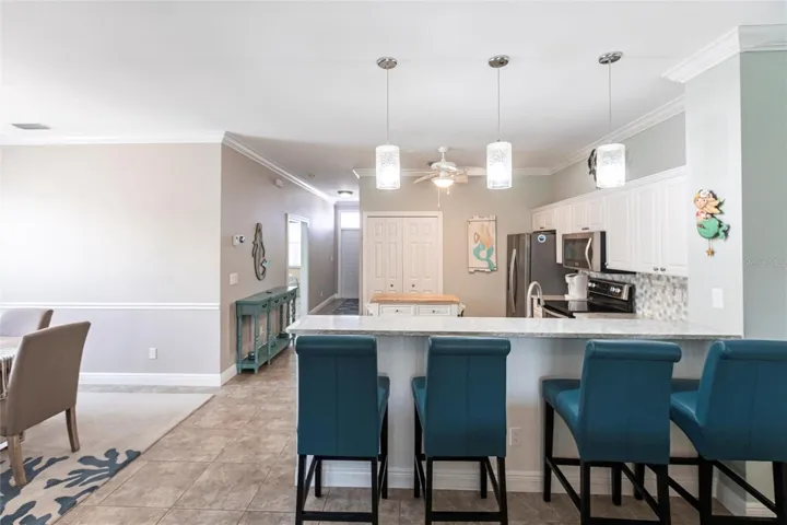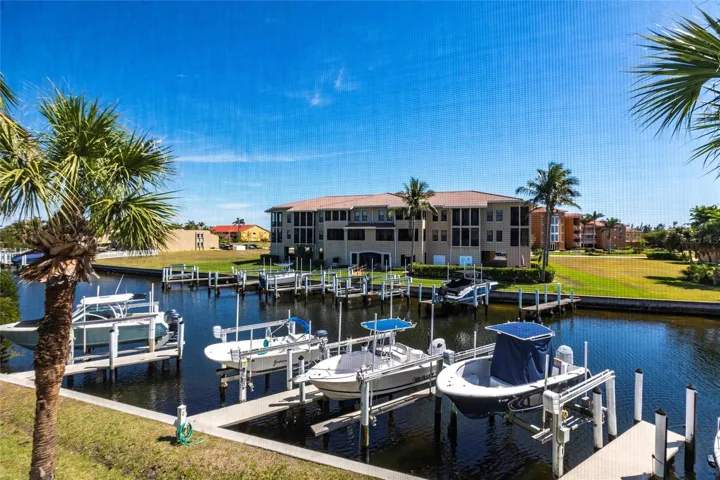 Come see this tastefully appointed 3 bedroom, 2 bath, 2nd floor condo with one car garage, and DEEDED BOAT SLIP in the desirable waterfront gated community of Clipper Cove Village. This condo offers bright and open concept with new color accent walls, ceramic tile in main living areas, wood plank laminate flooring in bedrooms, decorator light and fan fixtures, soaring volume ceilings, and blinds throughout. Split plan features primary bedroom and guest bedrooms separated providing privacy for you and your guests. Living area opens up to the balcony with views of the waterfront and your boat slip. Fully equipped and updated kitchen boasts sleek white wood cabinetry, stainless appliances, new granite counters with tile backsplash, rolling butcher block island, large pantry closet and breakfast bar that opens to the living area for easy entertaining. The formal dining room serves as a sophisticated and elegant space where you can host guests, celebrate special occasions, or enjoy meals in an atmosphere of refinement. The primary suite has 2 walk in closets, sliders leading to the balcony, and updated en suite bath with dual sink granite vanity, and walk in shower with new tile and frameless glass door. Two guest bedrooms are sure to please and share a full bathroom. Other features include dedicated laundry area with washer & dryer, detached one car garage, hurricane impact glass including electric roll down shutters, and water and sewer included in your condo fee! As an added bonus, deeded boat slip has concrete dock and 10,000 boat lift – a rare find! Enjoy fishing and boating on the sailboat waterway with quick access to Charlotte Harbor and then on to the Gulf of Mexico. Clipper Cove amenities include heated pool and spa for year-round enjoyment, clubhouse, and tennis courts. Community is beautifully maintained with lush tropical foliage and mature palms. Proximity to local beaches, dining, shopping, and golf courses makes this property ideal for the Florida lifestyle. Also, easy access to public boat ramps providing access to many waterways including beautiful Charlotte Harbor, the Peace and Myakka Rivers, and the Gulf of Mexico. And historic downtown Punta Gorda and popular Fishermen’s Village with quaint shops and cafes just a short drive away. Don’t wait to start enjoying your piece of Florida paradise! **PLEASE ENJOY THE 3D INTERACTIVE VIRTUAL TOUR ASSOCIATED WITH THIS LISTING