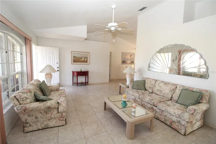 Start Living the Florida Lifestyle in this Affordable 3 Bedroom, 2 Bath, 2 Car Garage Furnished Home. As you walk through the screened/covered porch….notice how open this furnished home feels. Living room features vaulted ceiling, built-in plant shelves and ceramic tile flooring throughout except carpet in the bedrooms. Kitchen has plenty of countertop space including a nice center island with breakfast bar, plenty of cabinets for storage, built-in plant shelves, pass through window into the lanai to efficiently pass drinks and food while entertaining family and friends. The Dining room features sliding glass doors out to your spacious lanai. Primary bedroom is a nice size with a pocket door leading into the primary bathroom that has a walk-in shower with nice looking tiles and a door leading out to your private lanai. Split floor plan. The two guest bedrooms are nice size rooms with long built-in closets. The guest bathroom has tub/shower combo with same nice tiles as the primary shower. Other features include: 2023 A/C, 2022 Roof and washer & dryer & utility sink in oversized two car garage. There is plenty of room to entertain out back with your long screened/covered lanai with an additional 6′ x 8′ screened roof area to get some needed Florida Sun…..Huge fenced in backyard with plenty of room to add a pool. Breathtaking views of this huge tree just beyond your fence in your neighbors backyard behind your home. Start Living the Florida Lifestyle Now…. Nearby fishing, beaches, parks, boat ramps, golfing, restaurants, shopping and more….. Great Location!!! Great Price!!! Don’t miss the boat on this Furnished Move-In Ready Home. Call today for your private showing.