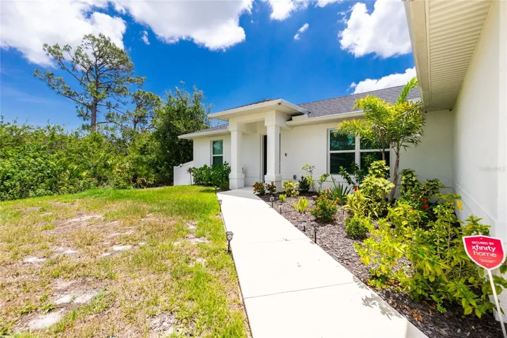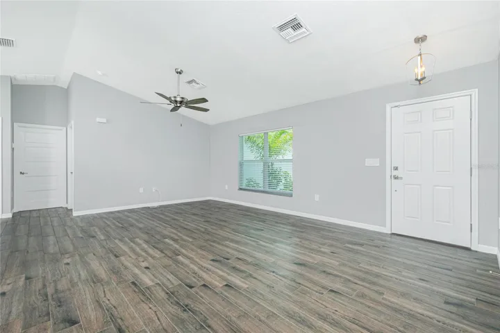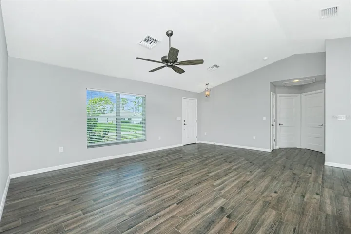 Designed with an open floor plan and vaulted ceilings, this home is full of natural light and spacious living areas. The interior boasts wood-look tile flooring throughout, elegant quartz countertops, a stylish tile backsplash, and stainless steel appliances.