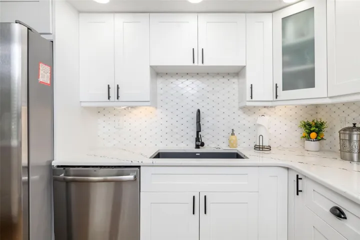 The heart of this home showcases a completely reimagined kitchen with sleek new cabinets, quartz countertops, stainless steel appliances, and sophisticated crown molding accented by recessed lighting. The primary bedroom retreat boasts an elegantly renovated bathroom complete with new vanities, granite surfaces, contemporary shower tile, convenient heat lamps, and a pristine glass door.
