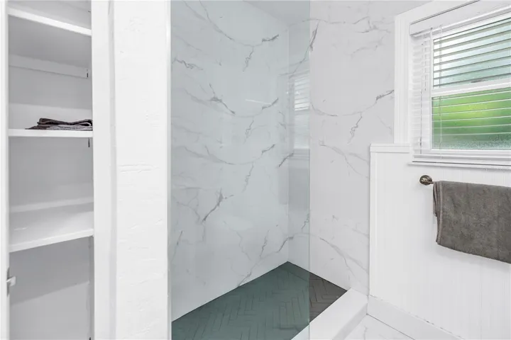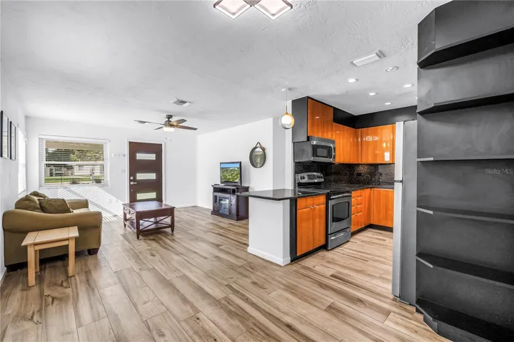 Step inside and you’ll find 1,297 sq. ft. of thoughtfully designed living space featuring porcelain tile flooring throughout. The modern European-inspired kitchen is equipped with custom cabinetry, granite countertops, and new stainless steel appliances, including a refrigerator and dishwasher. The bedrooms feature sleek sliding glass closet doors and provide ample storage, while the bathroom has been completely renovated with a tiled walk-in shower, a double vanity, and contemporary lighting.