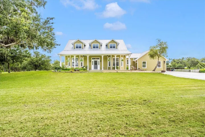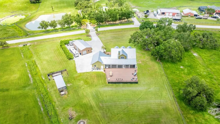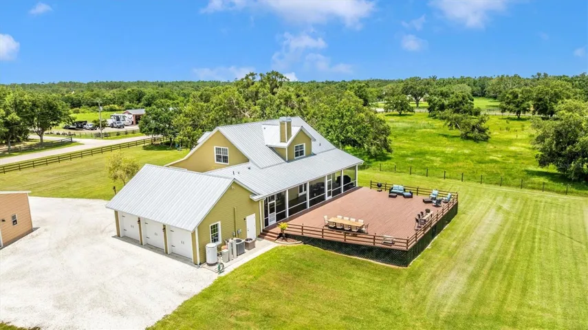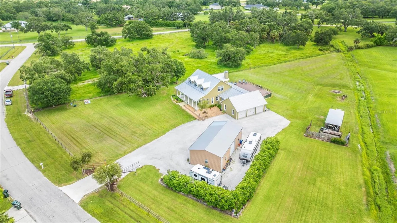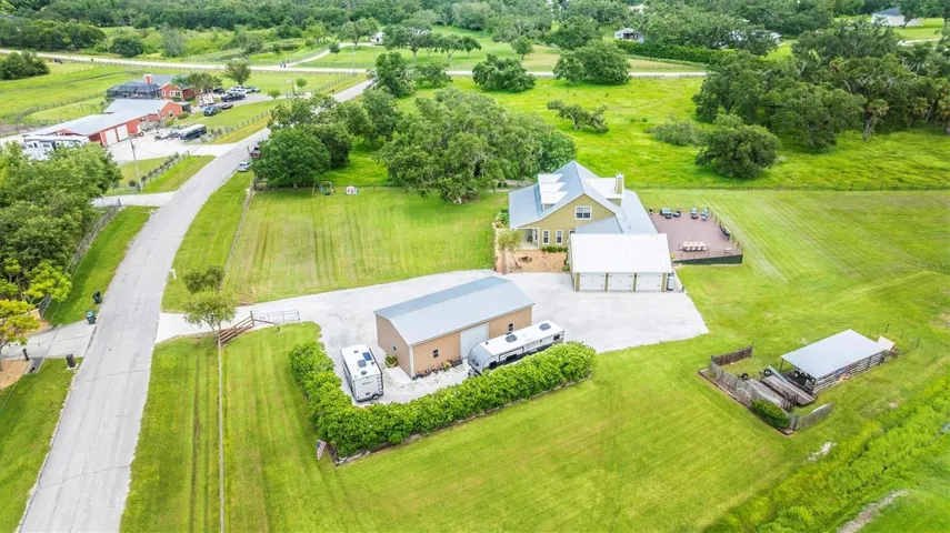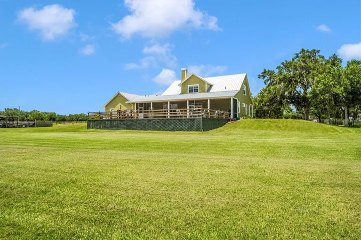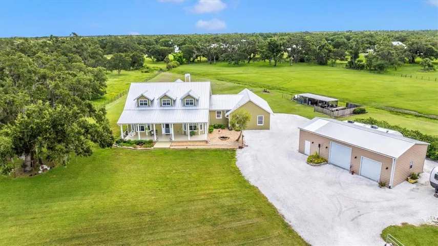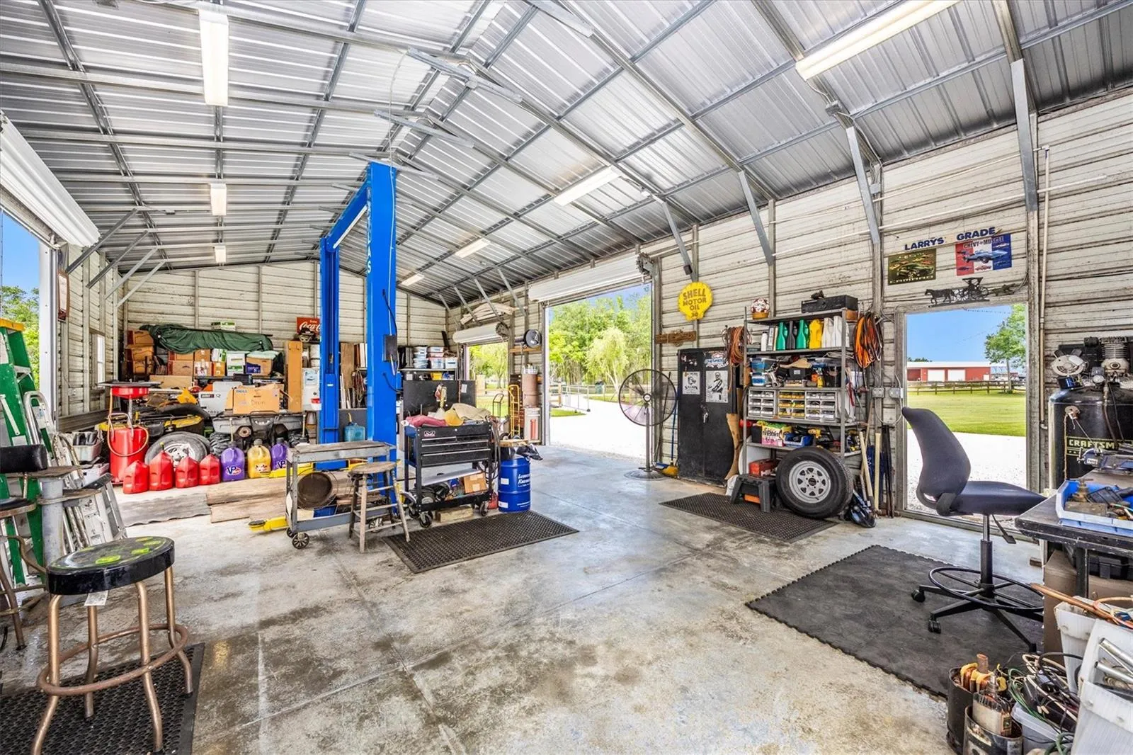 The outdoor space is just as impressive. A large, east-facing deck is perfectly positioned for tranquil mornings and enjoying stunning sunrise views over the acreage, which is framed by majestic oak trees. It’s common to see deer and Sand Hill Cranes and Whistling ducks on the property. Did you make us coffee yet? Swing on the front porch and listen to the song birds. Beyond the attached 3-car garage, a separate oversized detached garage and workshop provides a haven for hobbyists or car enthusiasts. This space is equipped with three roll-up doors and a vehicle lift. For equestrian or animal lovers, there’s a three-sided shed with two pens and two open stalls Landscaped shell parking provides plenty of room for RV, boat and guests.