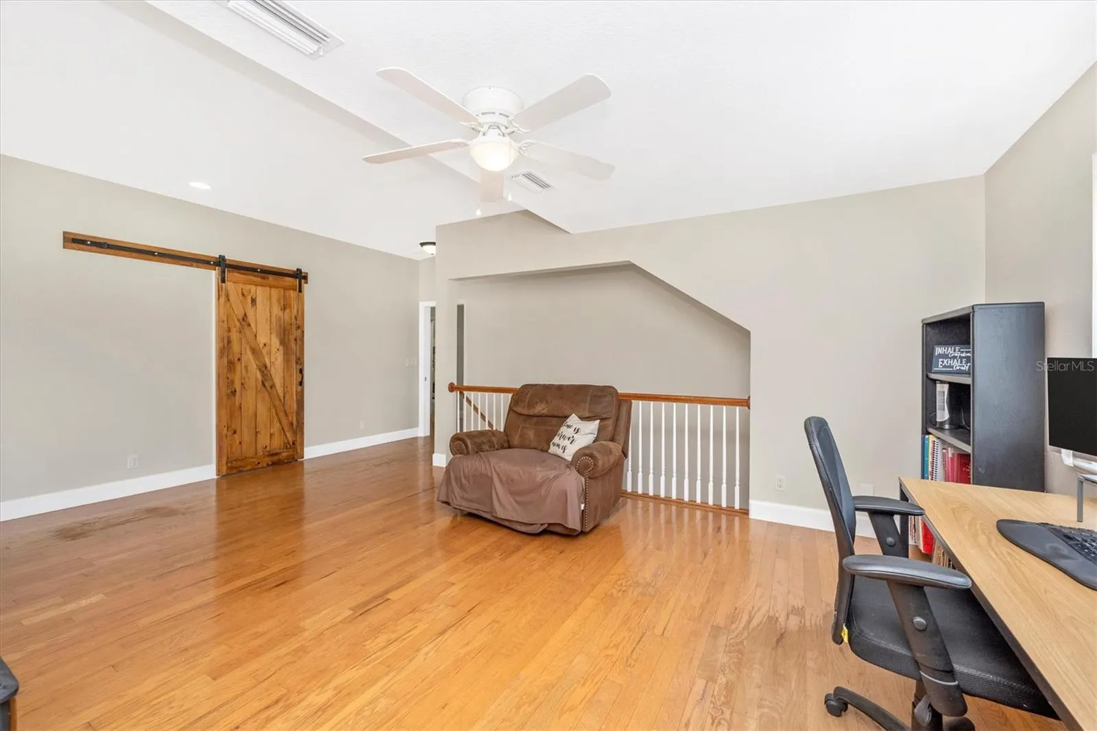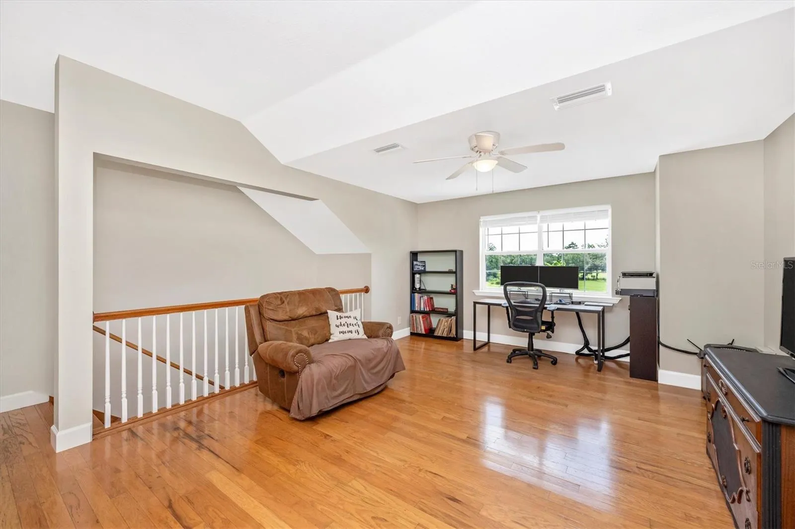 The main level features a primary bedroom with an en-suite bathroom and walk-in closet. The separate laundry room is on the main level. Upstairs, two additional bedrooms share a large landing area—a versatile bonus space perfect for a home office, with a large window overlooking the view of the land.