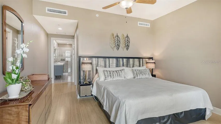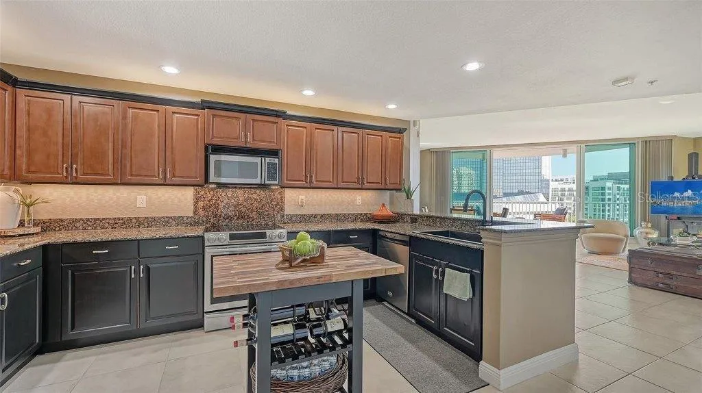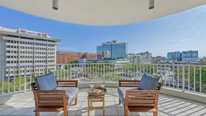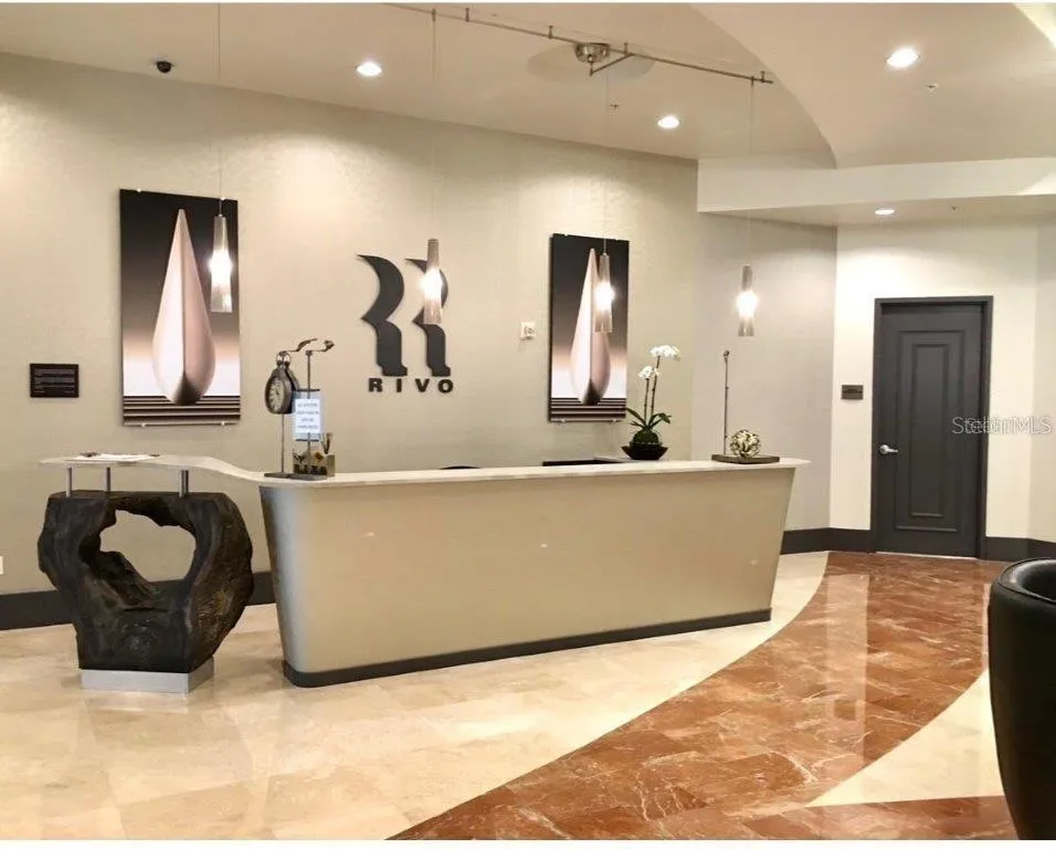 Now available for furnished seasonal rental and/or lease to own. Experience stunning sunrises from the spacious terrace of this corner unit located in Rivo at Ringling. This distinctive condominium, renowned for its unique style, interior atrium, and upscale amenities, offers a lifestyle of unparalleled sophistication. This 2-bedroom, 2-bathroom, 1,735 sq. ft. residence features a split floor plan with two primary suites, recently renovated bathrooms and brand-new washer/dryer set. The centerpiece of this unit is its central living area, ideal for entertainment. Flooding with natural light the living and dining spaces flow seamlessly onto a large terrace with non-slip tiles. A chef’s kitchen featuring raised panel wood cabinetry, black granite countertops, stainless-steel appliances and plenty of storage has been recently refreshed with contemporary finishes. Relax in your peaceful primary suite with a walk-in closet and renovated bathroom with dual vanities, walk-in shower, and soaking tub. The cozy second bedroom suite boasts a bright and airy atmosphere, complete with a den/study for added functionality and comfort. As a bonus, the large entryway closet has custom built-ins for added storage. This unit also includes two deeded parking spaces and a large storage unit measuring 13’ x 8’ x 10’. Rivo at Ringling offers many great amenities including concierge, heated pool and spa, sundeck with outdoor grill, spacious fitness center, social and conference room for resident’s use and a convenient area for bike and kayak storage. A fantastic location within the heart of downtown Sarasota with effortless access to shopping, entertainment, movies, Saturday Farmers Market, airport, and the wonderful beaches of Sarasota.