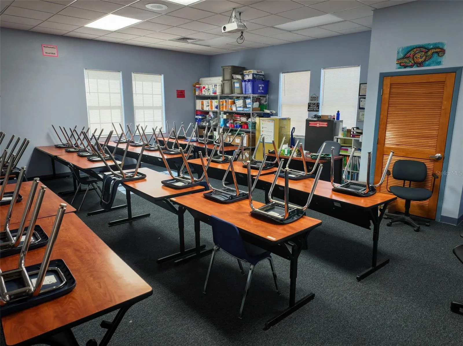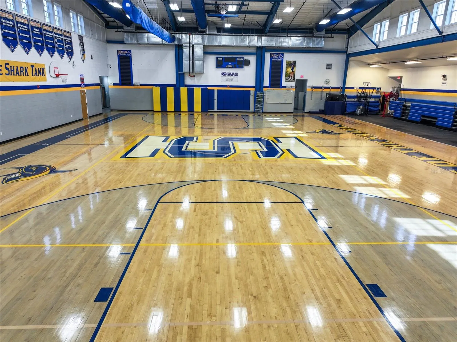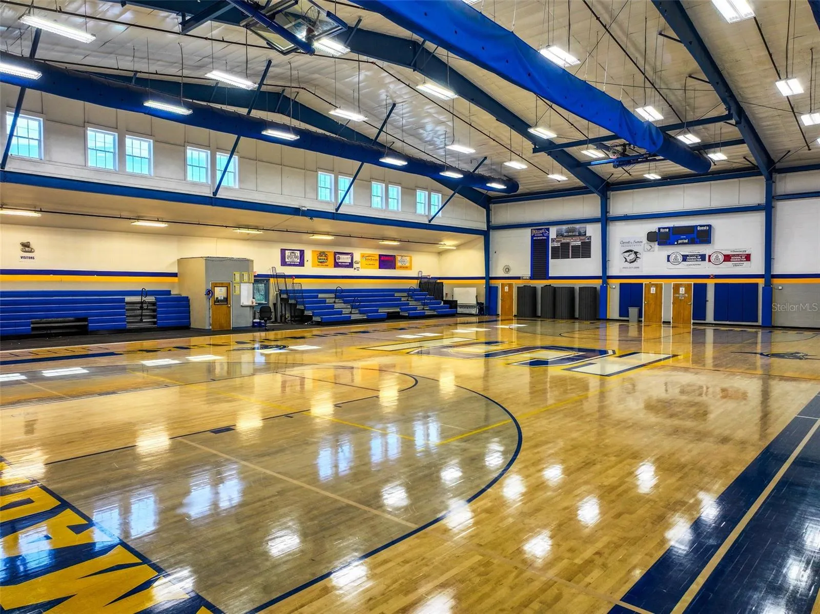 Adjacent to the court are multiple rooms currently used as a weight room, classrooms, and locker rooms, providing additional flexibility for a variety of activities.