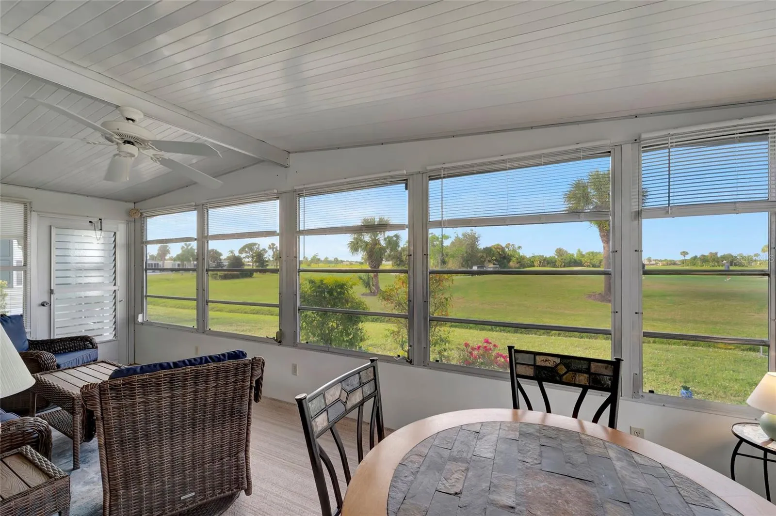 Indulge in breathtaking panoramic golf course views and captivating sunsets from this meticulously maintained and charming 2-bed, 2-bath seasonal or year-round home. Embrace the splendor of the award-winning Maple Leaf Golf and Country Club as you unwind on the Enclosed Oversized Back Porch, the expansive Screened Porch Area, or the Backyard Paver Patio – all offering enchanting glimpses of the golf course. This delightful and luminous home boasts a light, bright and airy open floor plan, laminate flooring throughout (with vinyl flooring in the baths), and a host of other appealing features. Home comes fully furnished as seen ( some exclusions). Unwarranted golf cart included .custom Custom-built in’s, ceiling fans, throughout, gleaming floors, ample storage throughout the home. The generously sized Master Bedroom offers a new king size bed, includes a Spacious Walk-In Closet, and an En-Suite Bath with ample cabinet space. The property also features an Extra Wide Carport and a Shed housing a Washer/Dryer & Utility Sink on a convenient platform. Recent updates by the sellers include Tie-Downs in 2021, Vapor Barrier in 2018, a Hot Water Tank in 2017, and both A/C and Roof Over in 2015. Don’t miss the chance to make this move-in ready home with its splendid golf course views your own! The community features an award-winning 18-hole, par 62 golf course, 5 tennis courts, bocce ball, lawn bowling, 2 shuffleboard court centers, 4 heated swimming pools, 2 hot tubs, a fitness facility, and a woodworking facility. There are also over 75+ clubs and activities available for residents to enjoy, including 4 pickleball courts. Other amenities include full on-site restaurants, dining on the water/deck, a tiki hut/bar, and much more. Schedule a showing today, a Rare find, pride of ownership shines through. Certificate conveys with home – don’t miss out on this one