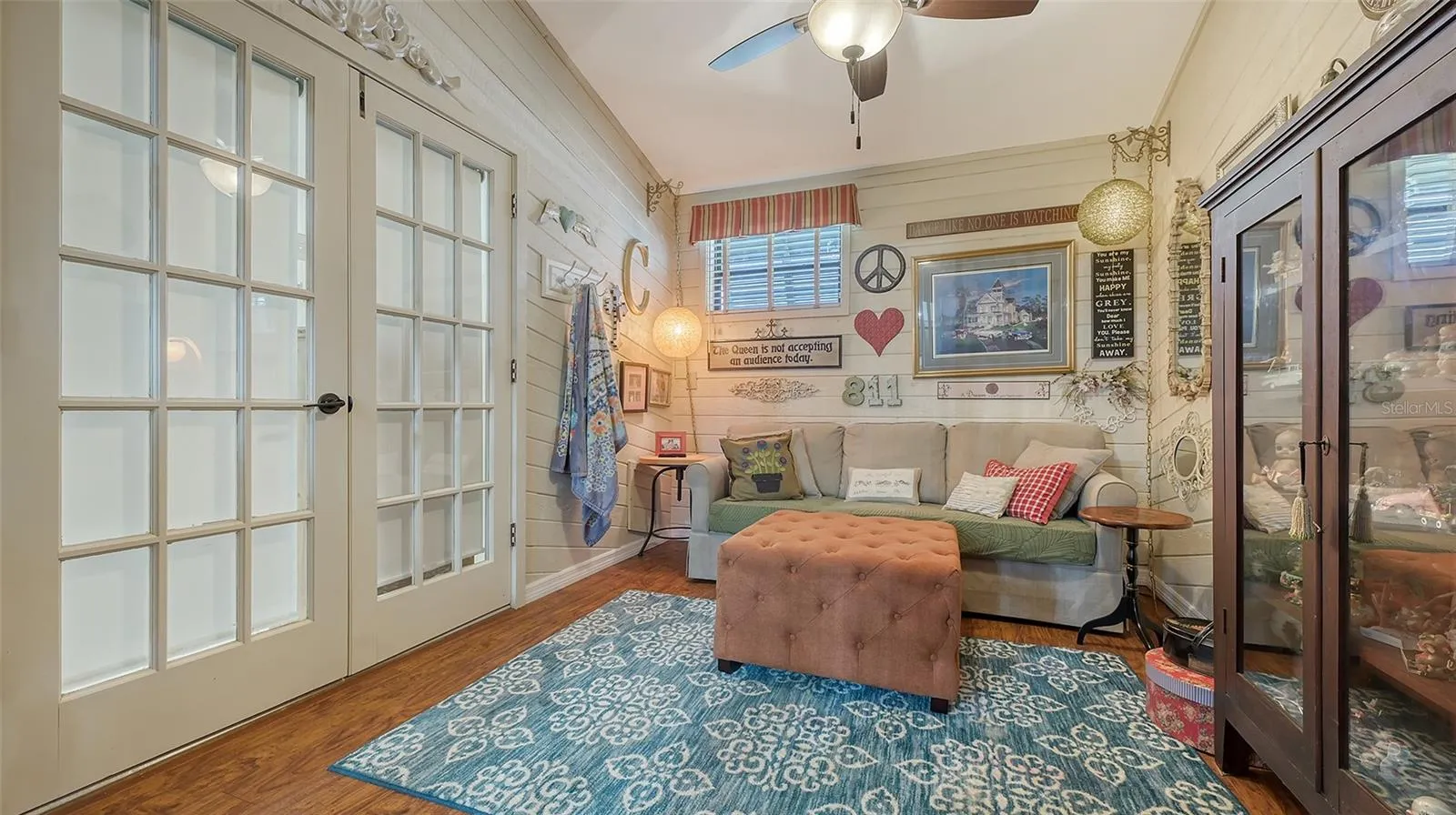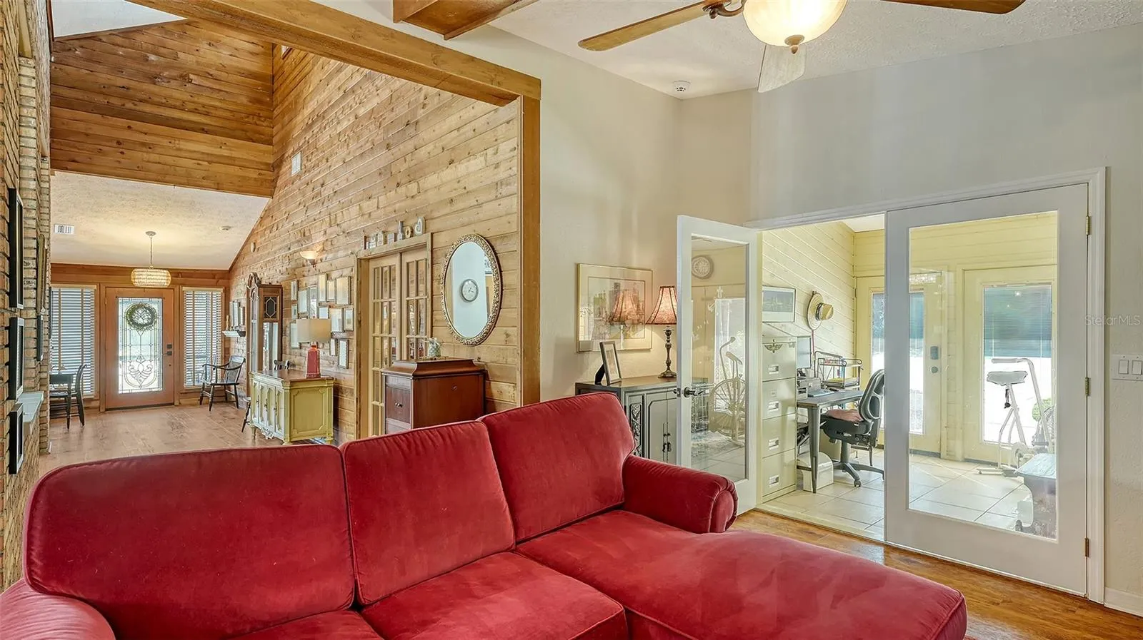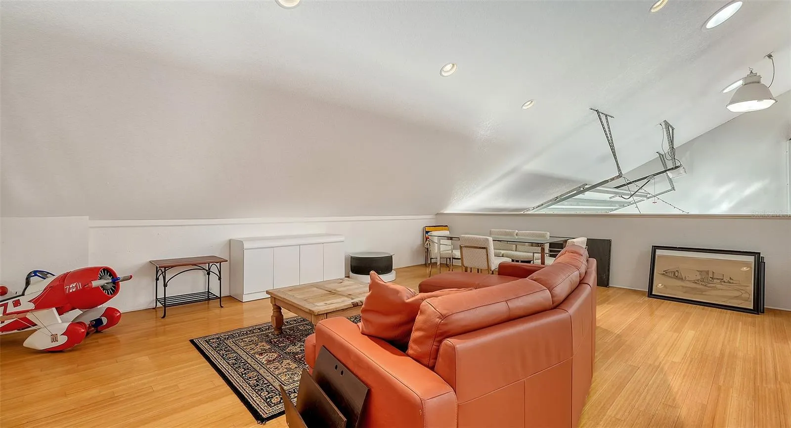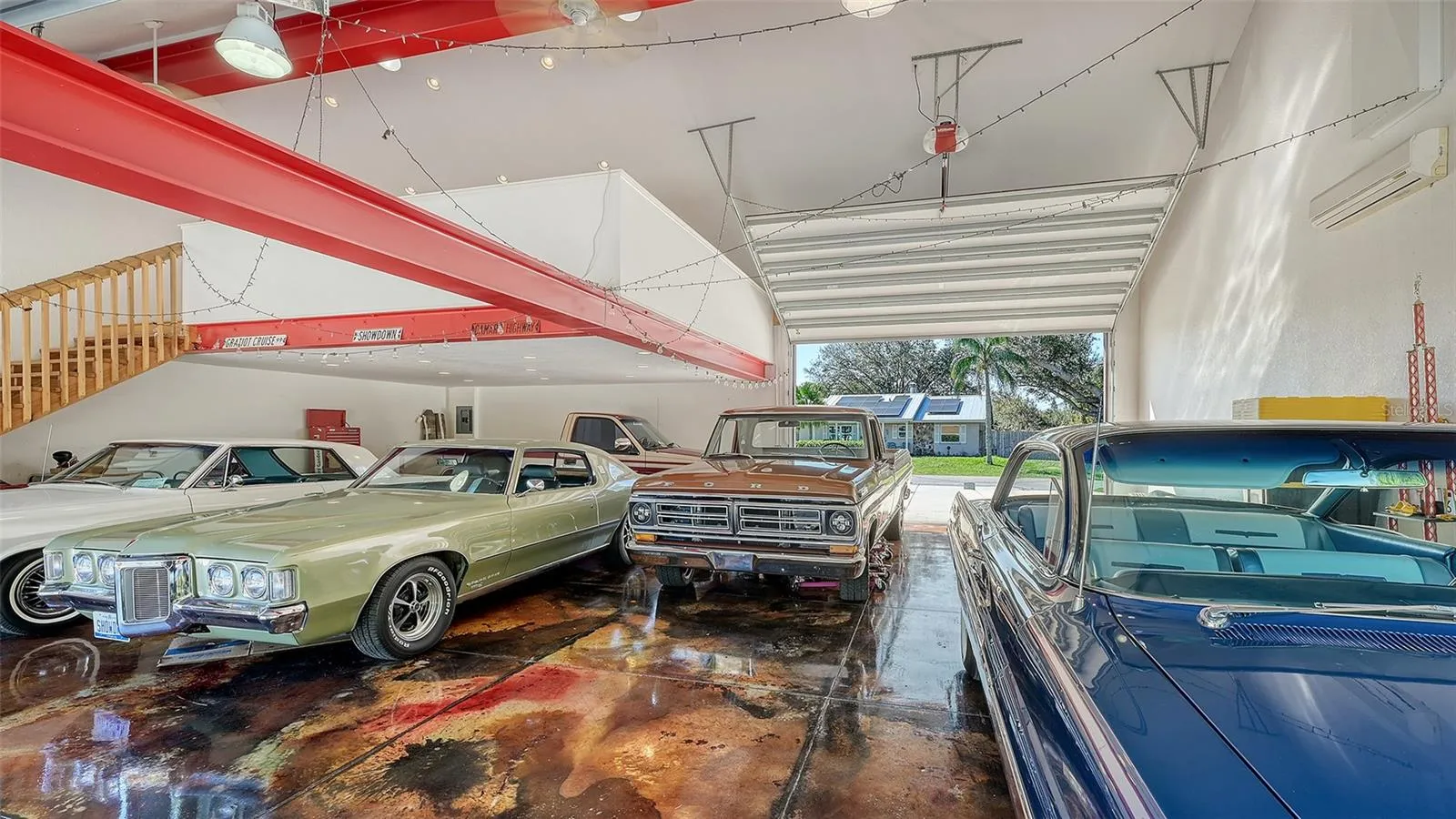 The detached garage is block construction with 12” steel “I” beams, vaulted ceilings, two A/C systems, finished plastered walls, three (3) hurricane rated garage doors with openers, hurricane impact round decorative front window, two sky lights, three solar tube lights, finished & furnished 19×22 upper loft, metal storage racks, mercury vapor lighting, can ceiling lights and stained concrete flooring. With almost 7000 square feet of concrete driveway this one-of-a-kind garage has door tracking that follows the lines of the vaulted ceiling for hoist clearance.