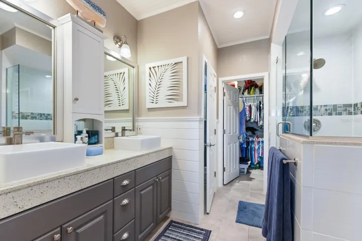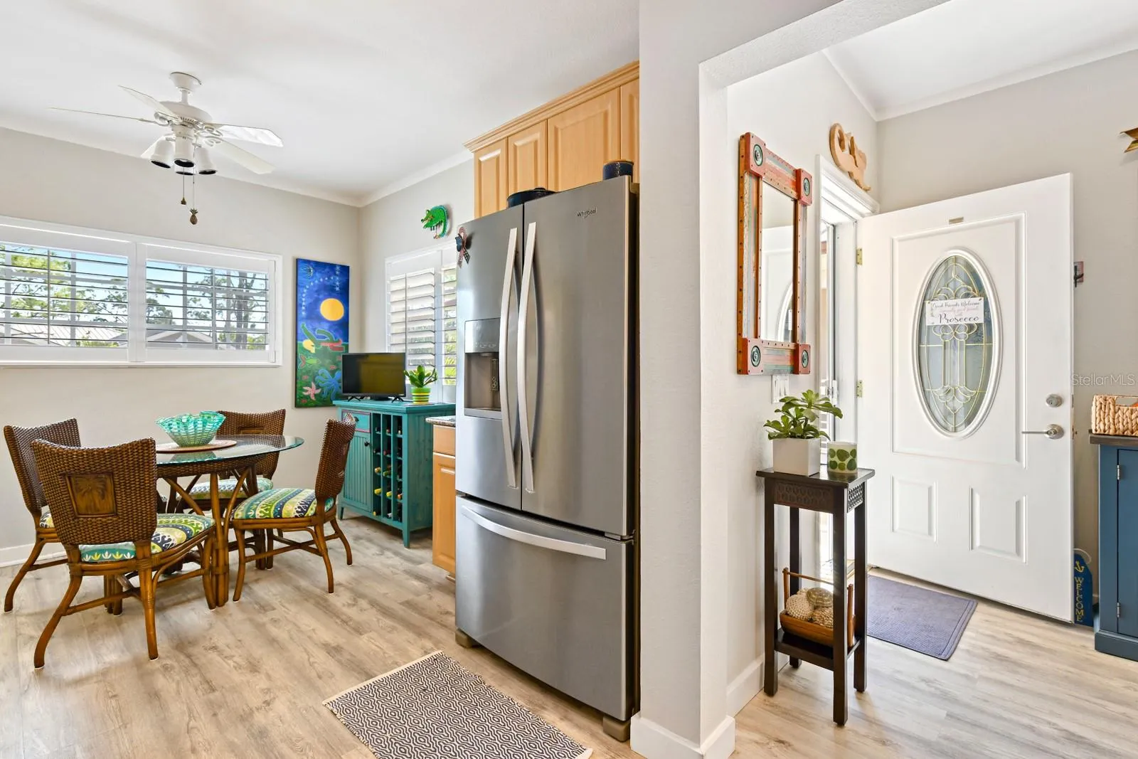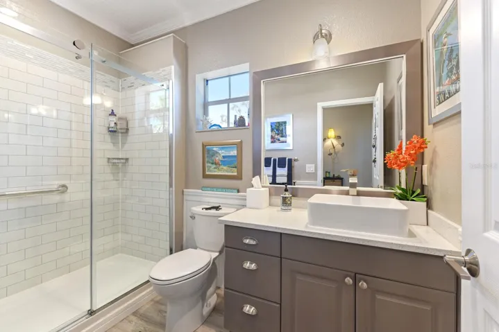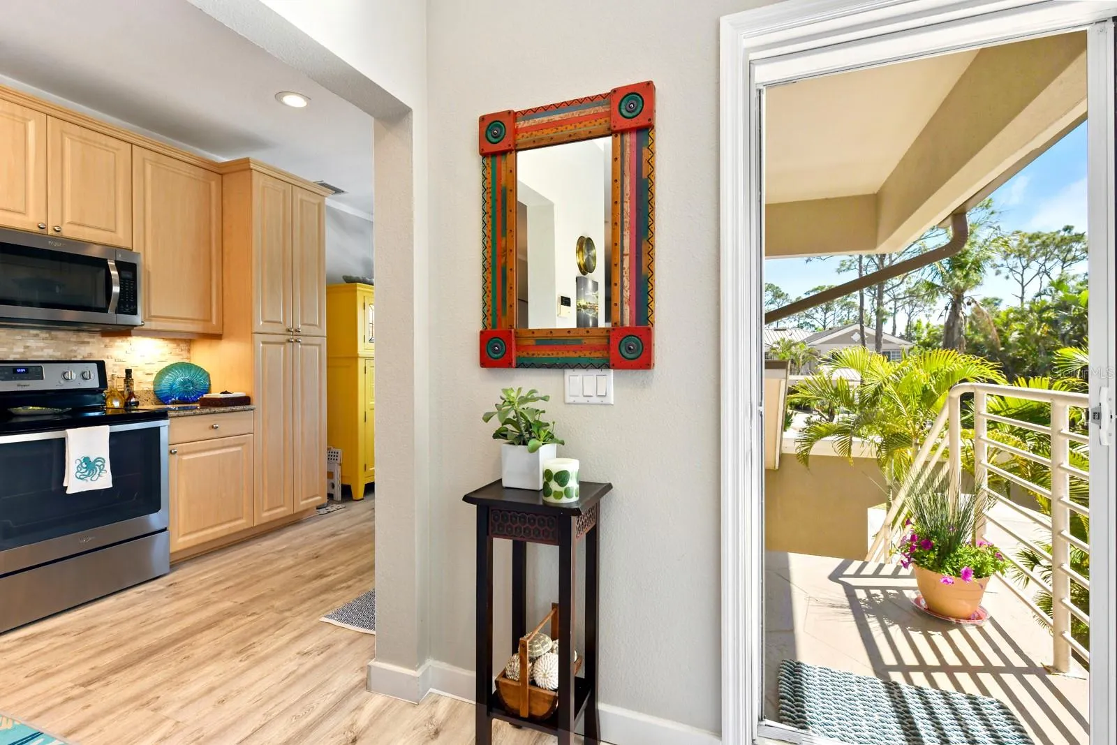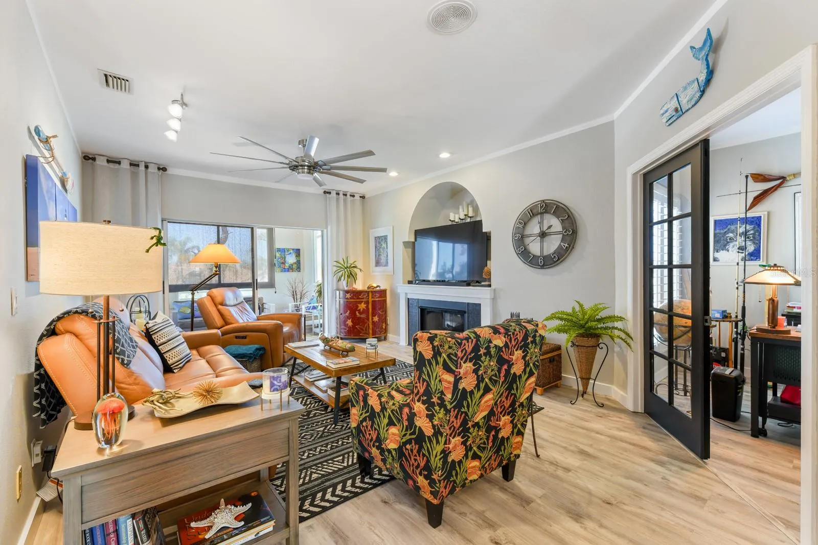 Surrounded by tropical trees within a beautiful 8-unit community in Burnt Store Marina you’ll find this gorgeous 1,585sf second floor condo featuring 3 bedrooms, 2 baths and private single car garage. Light and bright, this spacious and open floor plan with windows on all four sides is offered TURNKEY FURNISHED with distinctive touches you won’t find anywhere else! Inside, you’ll be greeted by tasteful neutral paint, stylish finishes, crisp plantation shutters over all windows and a beautifully furnished interior! This interesting layout provides a dining area with a comfortable living area that showcases easy-care wood plank luxury vinyl flooring. On cooler evenings enjoy the inviting fireplace that adds both charm and warmth. The adjacent enclosed lanai allows an extended living space to enjoy year-round with long views of the golf course and sunsets in the evening. An open and spacious kitchen features light granite countertops with attractive backsplashes, and tall 42-inch cabinets with crown molding. WIth a delightful dinette area, newer stainless appliances and a breakfast bar open to the living area, you’ll enjoy entertaining with friends. The split bedroom layout gives you and guests privacy and both bedrooms have designer updates with board and batten walls and crown molding. The two bathrooms were also artfully updated. The guest bath features new a vanity and shower with custom beadboard ceilings and board and batten side walls, and the owner’s bath has a complete redesign with new shower, extra storage closet, dual vanity with granite counter, storage tower and two vessel sinks. Additional details include stylish ceiling fans, new dishwasher and a newer full-size washer and dryer. The community is wonderfully maintained and the buildings were upgraded with newer metal roofs, ensuring long-term durability. This condo combines comfort, style, and thoughtfully smart features – come take a look! And be sure to explore the amenity-rich Marina community featuring a 27 hole public golf course, tennis, pickleball and active fitness center, 3 onsite restaurants, Freedom Boat Club, wet and dry boat storage and the fastest access to open water in the area. Enjoy our active, friendly lifestyle and find out why people love to call this home!