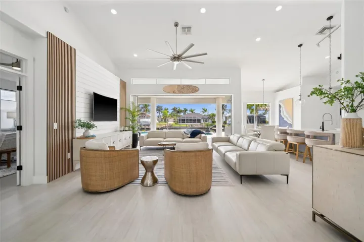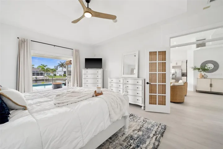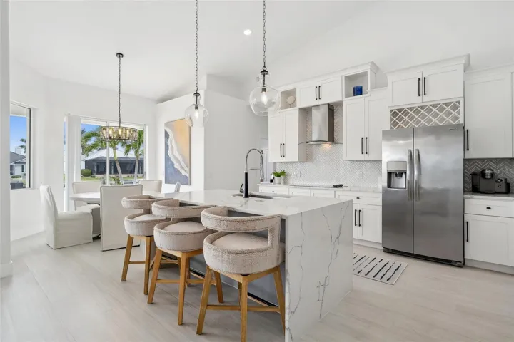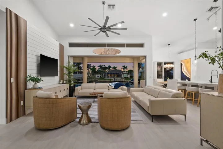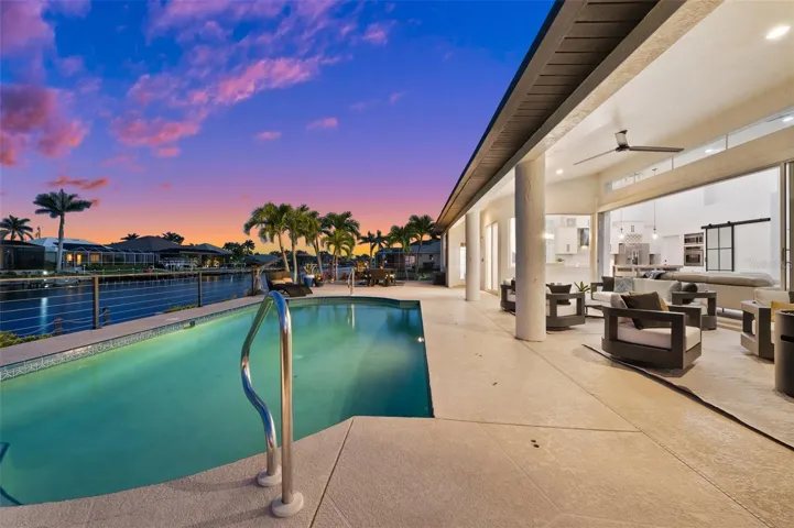 Live the ultimate Southwest Florida lifestyle in this beautifully updated FURNISHED Gulf-access pool home located just minutes from Cape Harbour’s shops, restaurants, and marina. Situated on an oversized, fenced triple lot with 120 FEET OF GULF ACCESS WATERFRONT, this 3-bedroom, 3-bath home with a private OFICE offers wide canal views and plenty of room to relax and entertain. The open-concept layout features high ceilings, new porcelain tile flooring throughout, and pocketing sliders in the great room for seamless indoor-outdoor living. The island kitchen is updated, modern and coastal, with quartz countertops, stainless appliances, a breakfast bar, upgraded lighting, and a new tile backsplash. The spacious primary suite includes French doors to the lanai, a walk-in closet, and a fully remodeled en suite bath with dual sinks, a freestanding soaking tub, and a glass-enclosed shower. Two guest bedrooms, a dedicated office, a full guest bath, and a pool bath provide comfort and flexibility for family or visitors. Outside, enjoy a large covered lanai, brand-new outdoor kitchen with built-in grill and beverage fridge, and an expansive pool deck surrounding the sparkling pool. Recent upgrades include whole-house re-piping, a new electrical panel, new water heater, new dishwasher, remodeled bathrooms, updated lighting and fixtures, fresh interior and garage paint, and new landscaping. A circular driveway and lush tropical setting enhance the curb appeal. With quick access to open water and NO FLOODING during Ian, Helene, or Milton, this is a true Cape Coral waterfront retreat. ROOF 2023 AC 2025