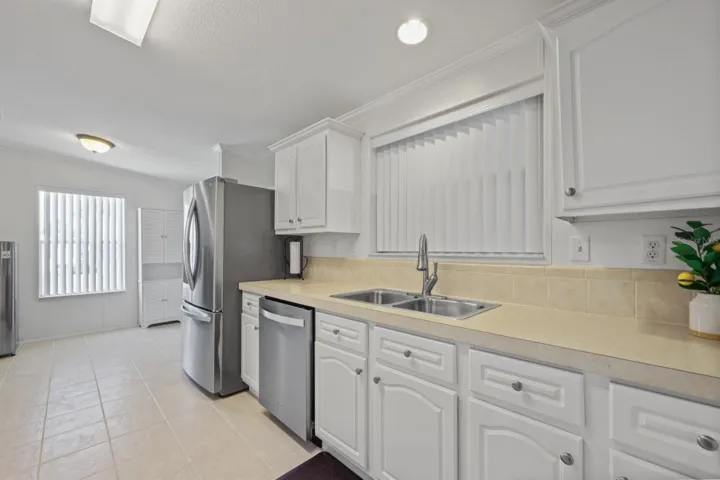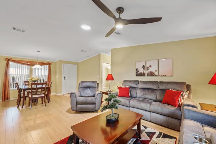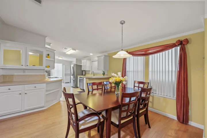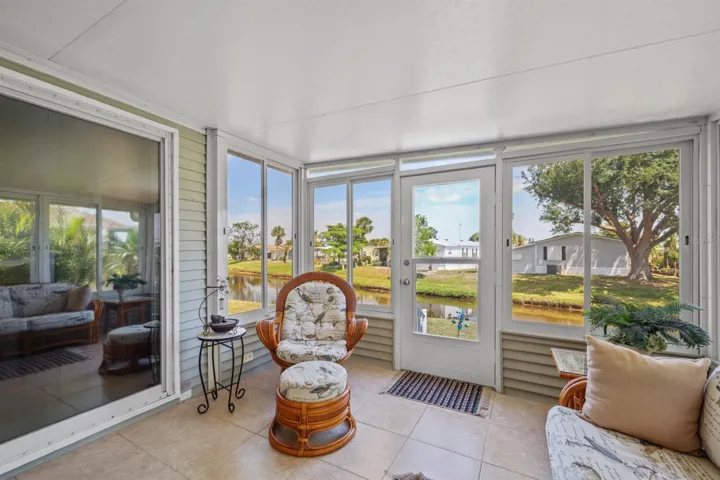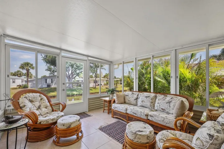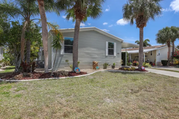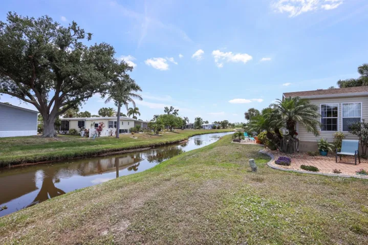 Beautiful and spacious THREE bedroom Palm Harbor built home situated on a premium interior lot with a water view. The split bedroom floorplan with the primary bedroom suite on one end, two guest rooms on the other, is perfect for entertaining your overnight guests. Third bedroom could be the perfect home office or craft room. Primary bedroom suite features two walk-in closets and en-suite bathroom with double sinks and walk-in shower. The living room, dining room combination offers plenty of space to entertain. Breakfast nook off kitchen with sliding glass doors exiting out to the spacious 13×12 lanai with upgraded windows and doors. The lanai will be your favorite place to watch the sunrise and bird watching. Interior laundry closet off breakfast nook with upgraded front load washer/dryer. No carpet, laminate and tiled floors for easy maintenance. Guest bathroom features tub/shower combination. Spacious 8×10 storage shed for your golf clubs, tools and more. This home is being sold furnished with non-warranted golf cart. AC replaced in 2022. Water Heater replaced 2020. AMS Weather-Lok Roof-over installed 2017. Electric vertical platform lift at entrance can be removed prior to closing if desired. Whether you’re a snowbird or a year rounder, this property checks all the boxes. Schedule your private showing today and start living the Maple Leaf lifestyle. **Be sure to check out the 3-D virtual tour and walk through video links** Located in award winning Maple Leaf Golf & Country Club, a popular 55+ gated golf course community with an active resort lifestyle. Features a Par 62, 18 hole golf course, 5 tennis courts, bocce ball, lawn bowling, 2 shuffleboard courts, 4 heated swimming pools, 2 hot tubs, fitness facility, woodworking facility, 75+ clubs/activities, 4 pickleball courts, restaurant with full service bar, tiki hut/bar and more. Don’t miss out on this opportunity to live in a thriving community where every day feels like a vacation.