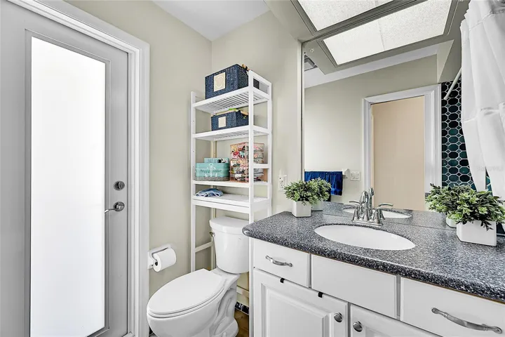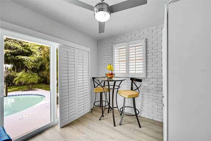 The kitchen, which has been thoughtfully designed with custom wood cabinetry, granite countertops, and stainless steel appliances. A breakfast bar offers casual seating.. One of the most charming features is the impact-rated pass-through slider to the poolside bar—ideal for effortless entertaining. Step outside and discover your own private tropical oasis. The open patio and pool are perfect for relaxing or entertaining guests. Surrounded by swaying palms, a concrete pool deck, and a vinyl privacy fence with a double gate, the backyard offers beauty and function. Whether you’re lounging in the sun, hosting a barbecue, or enjoying a quiet evening under the stars, the space delivers true resort-style living. The primary suite is a serene retreat, featuring sliding impact glass doors that open directly to the pool area, walk-in closet, and an ensuite bath with a single vanity and walk-in shower. Two additional guest bedrooms are comfortably sized and share a full bathroom with a tub/shower combo—and direct access to the pool for added convenience.