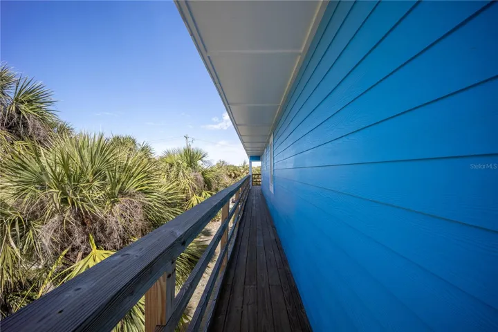 The home’s coastal charm starts at its striking blue exterior, elevated on stilts. The full wrap-around deck provides breathtaking views of the lush landscape and easy access to the natural beauty surrounding you. With a ceiling design that artfully combines style and function, the back porch is equipped with two ceiling fans, ensuring your comfort while you soak in the stunning views.