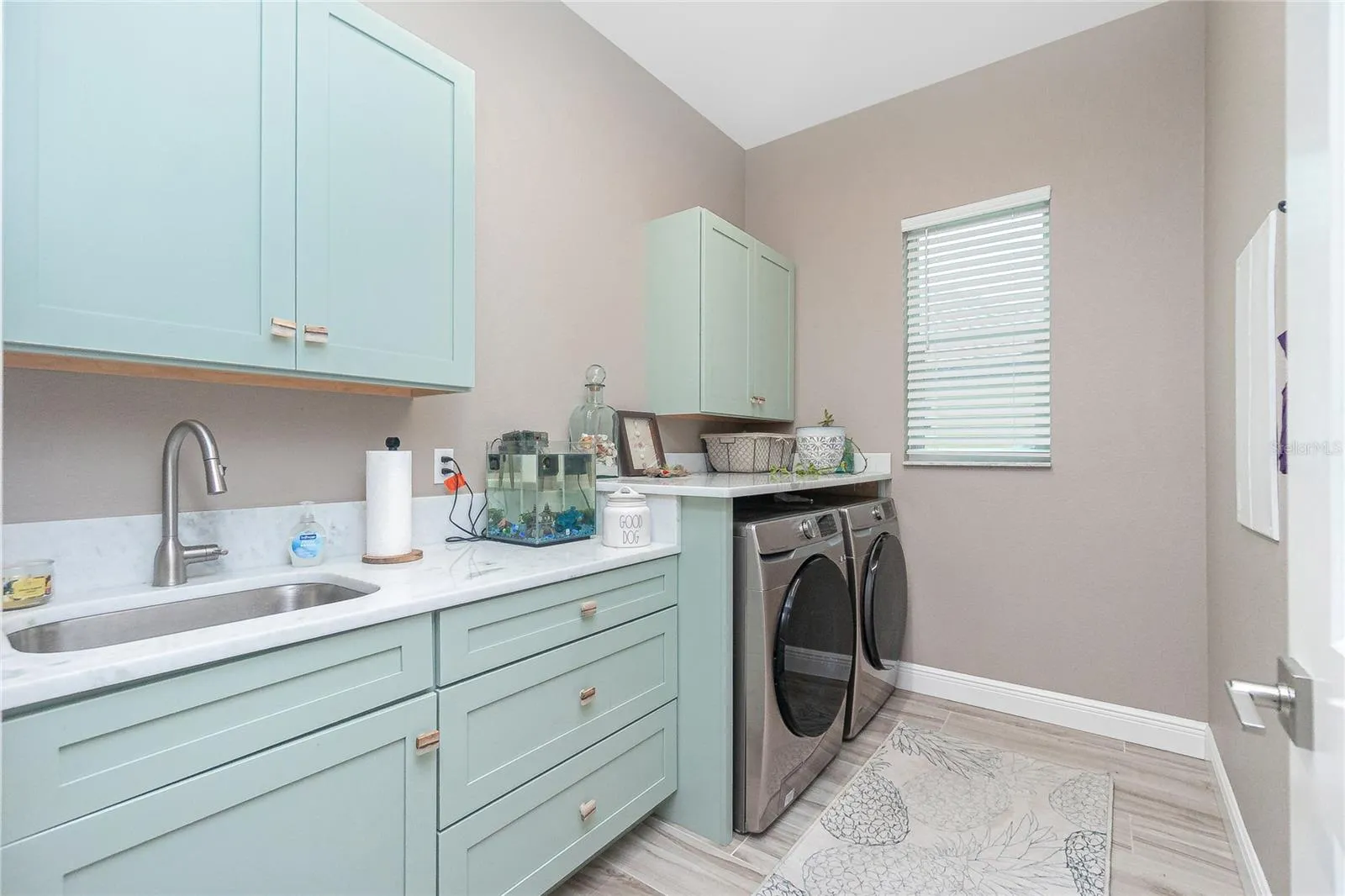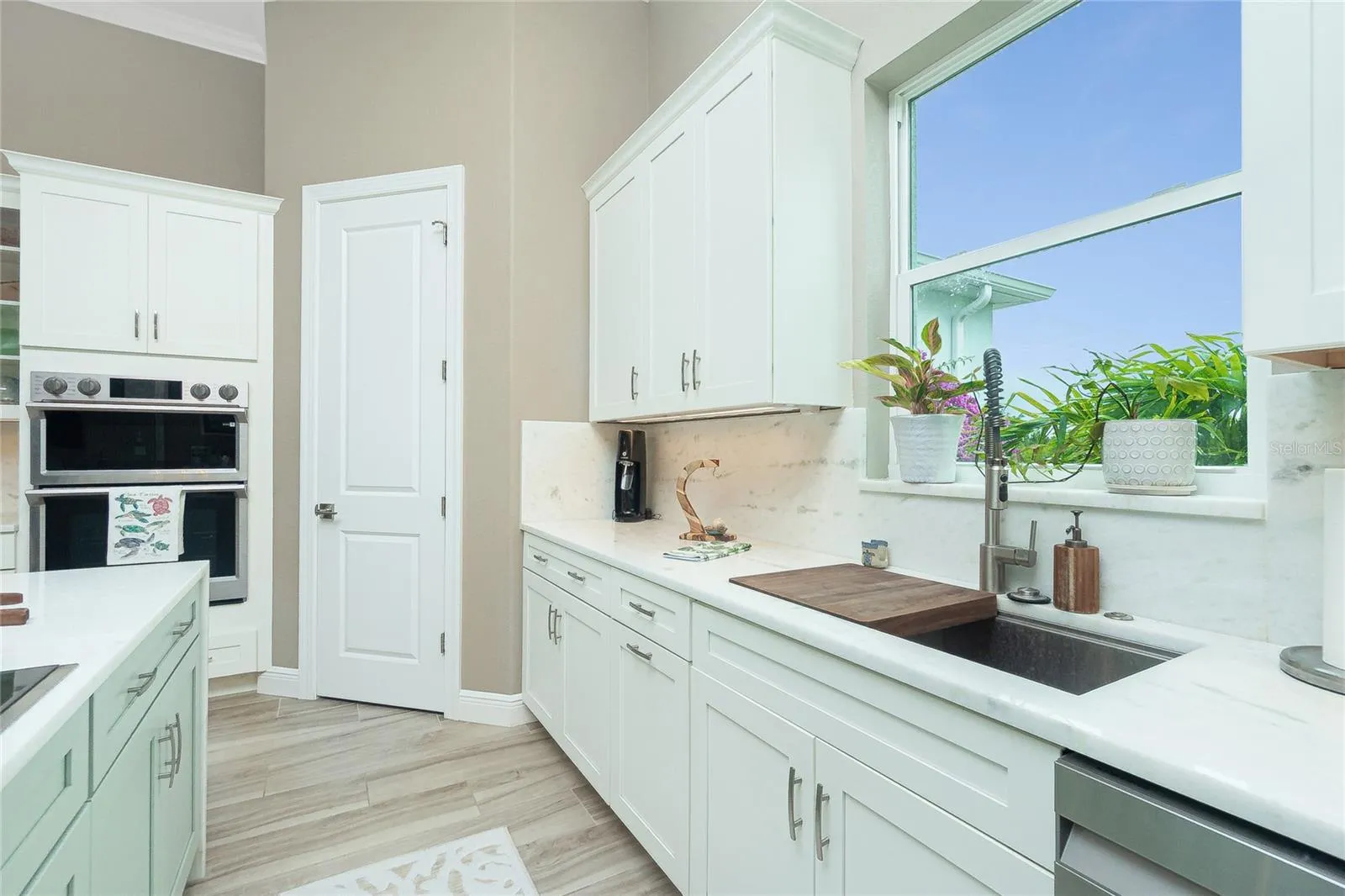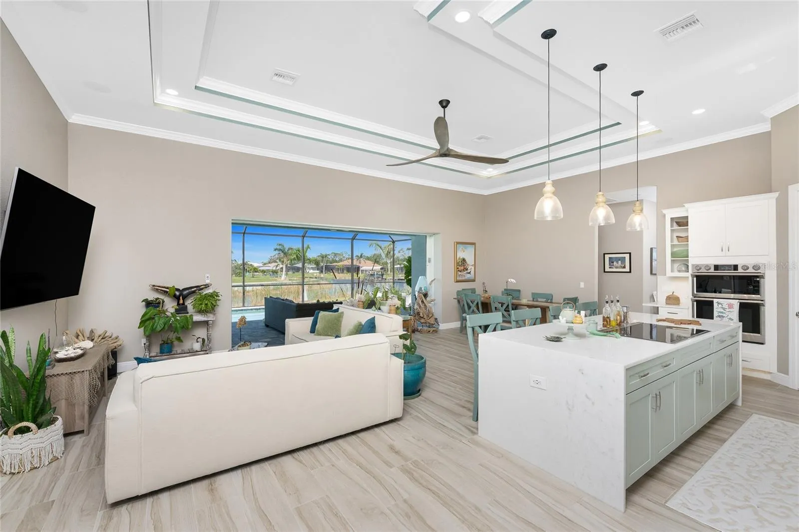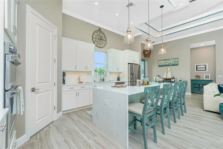 Enjoy beautiful water views throughout this thoughtfully designed open-concept home, featuring extra attic insulation and impact-rated windows and doors for storm protection and energy efficiency. The spacious chef’s kitchen is fully upgraded with a high-end cooktop, custom cabinetry, solid surface waterfall-edge countertops, premium built-in appliances, and a deep stainless-steel sink with designer fixtures.