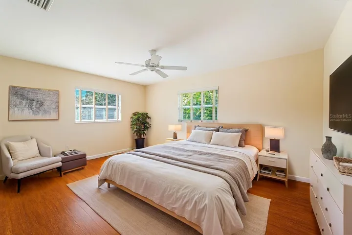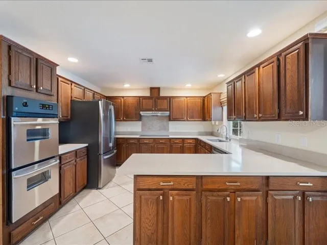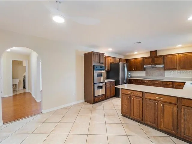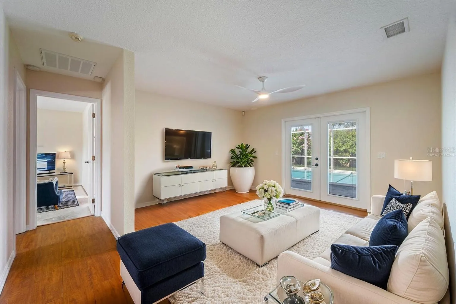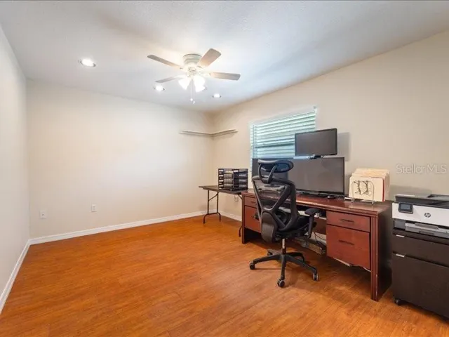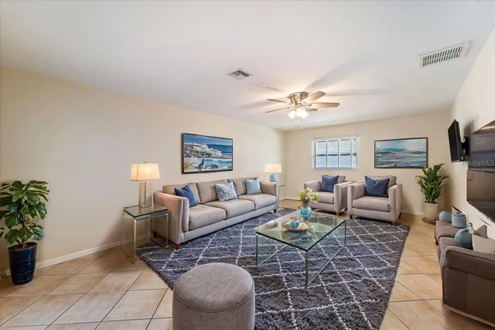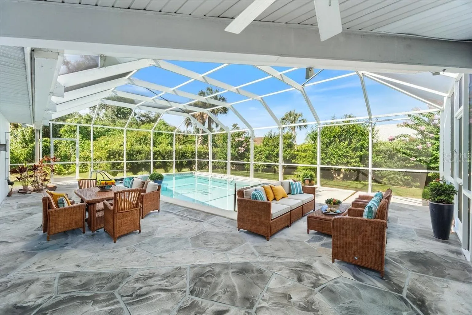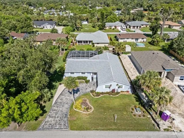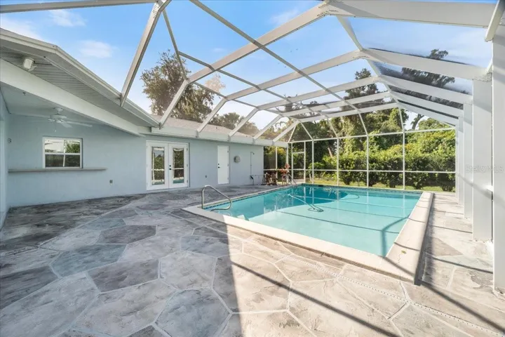 One or more photo(s) has been virtually staged. Just a 2-owner house and this owner has taken meticulous care of it for 38 years. 2025 complete interior painting, 2025 driveway coating, 2023 exterior painting, 2024 impact resistant Thermopane windows (except picture window which has shutters), pool resurfaced and pool deck decorative coating in 2024, 2022 roof, 2025 SS kitchen appliances (double wall oven), Updated electric panel with generator interface, and the house has been re-piped. This property comes with a ONE YEAR HOME WARRANTY for the buyer. The spacious kitchen contains 30 running feet of brand-new quartz countertops, 32 feet of wood cabinets, and an 8’6” X 12’ table area. The 22’ X 14’ family room is adjacent to the kitchen and can be closed off when desired (great for a mother-in-law room). The primary bedroom’s size will accommodate a variety of furniture arrangements. The Seller is giving the Buyer a $1,500.00 cash credit at closing for new flooring in the primary bedroom. The hallway to the primary bathroom has a walk-in closet on one side and an 8’ built-in closet on the other. That updated bathroom features two comfort-height vanities, a shower with a seat, lots of mirrors, and a door to the pool deck. 3 more bedrooms offer a great amount of closet space (double shelving). This home can be converted to FIVE BEDROOMS, easily. The 17,000-gallon pool offers plenty of room for exercise, games, parties. The 24’ deep garage has a workbench (the seller will remove it if the buyer so desires) with drawers and 55’ of storage shelving, and it is air-conditioned. Above the garage is built a real attic (open) trusses, plywood flooring and 2 lights. There are 2 storage sheds, also. Wow, lots of storage everywhere. Click the Tour 1 icon above for the NARRATED VIDEO VIRTUAL TOUR, not just the same still photos! MUCH MORE INFO is attached – ask your agent for copies, especially the FEATURES LIST AND WARRANTY OUTLINE.