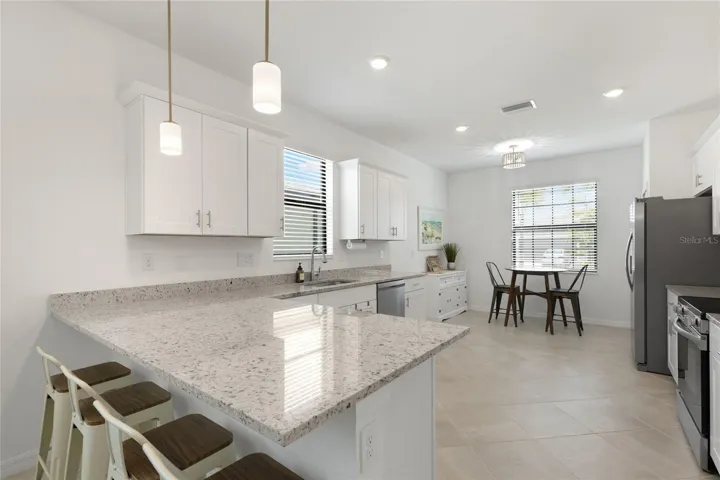 Welcome to 1734 Saddlewood Circle—a fully furnished, move-in-ready 3-bedroom, 2-bathroom home built in 2023, located in the exclusive gated community of Biscayne Landing. This modern residence features an open-concept floorplan with sleek ceramic tile throughout, granite countertops, custom lighting, and a stylish kitchen that flows into the main living space. The split-bedroom layout offers privacy, while the fenced backyard provides room for pets or entertaining. The epoxied garage floor, elegant finishes, and professionally selected furnishings make this a true turnkey opportunity.