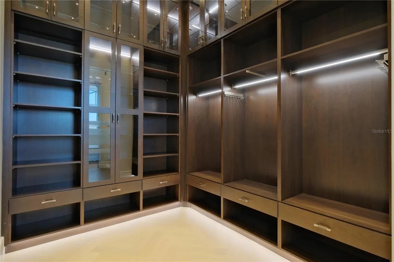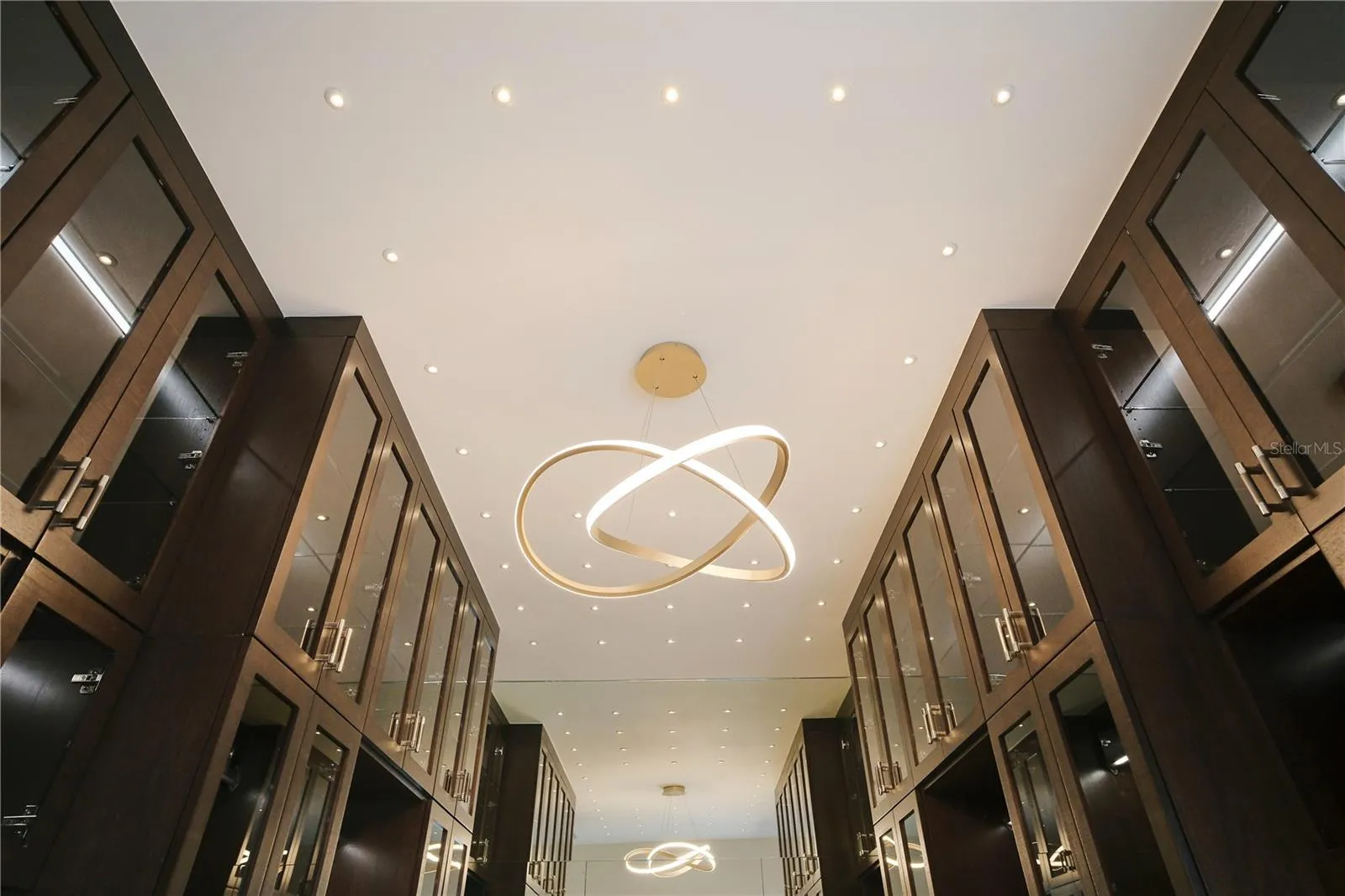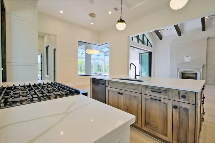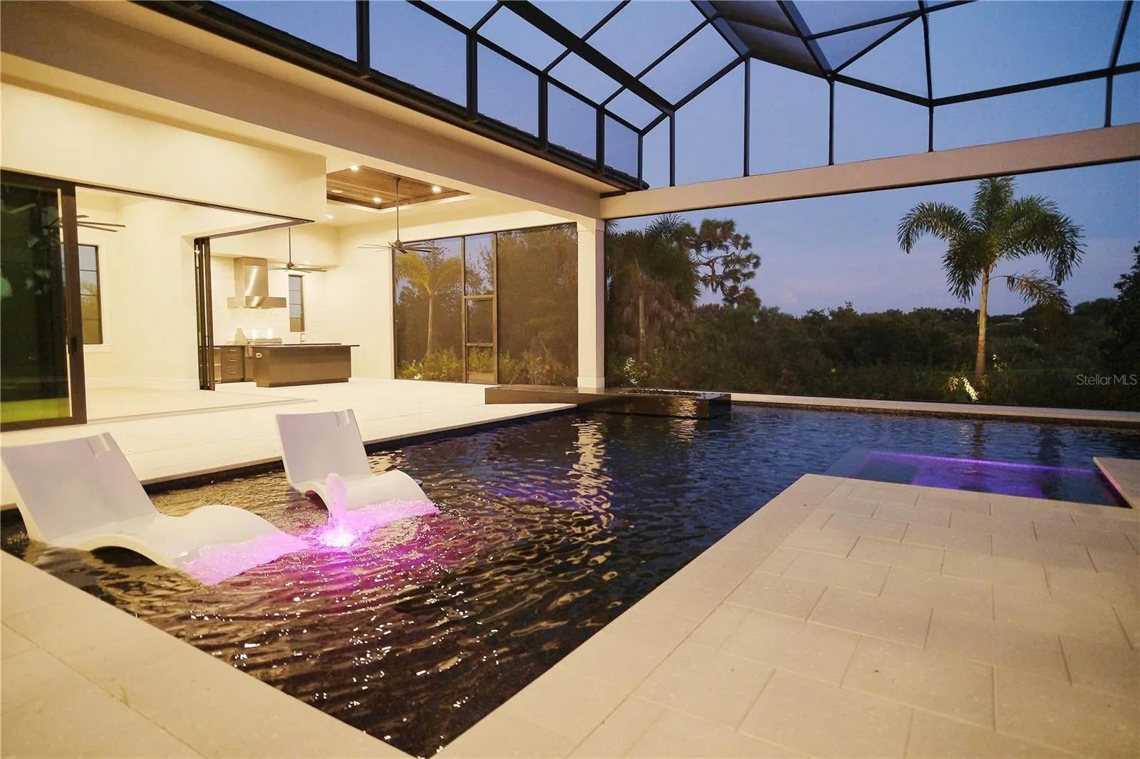 The rear lanai is fully equipped with an outdoor kitchen and island, overlooking the stunning pool area enclosed by a clear-view screen and colonnade. The pool features shellock pavers, a large sun shelf with cascade bubbler, in-pool lounge chairs, and a floating fire pit with mirrored granite edges. The negative-edge spa with glass waterline tile completes the scene. This smart home comes pre-wired for electric window treatments, and includes an integrated camera system, home music, and more—delivering luxury, comfort, and technology in one extraordinary package.