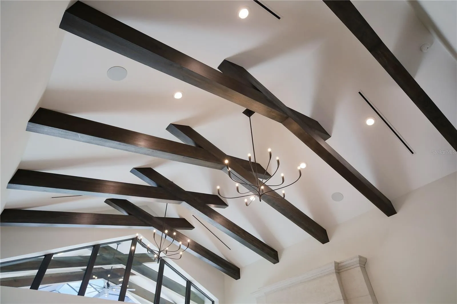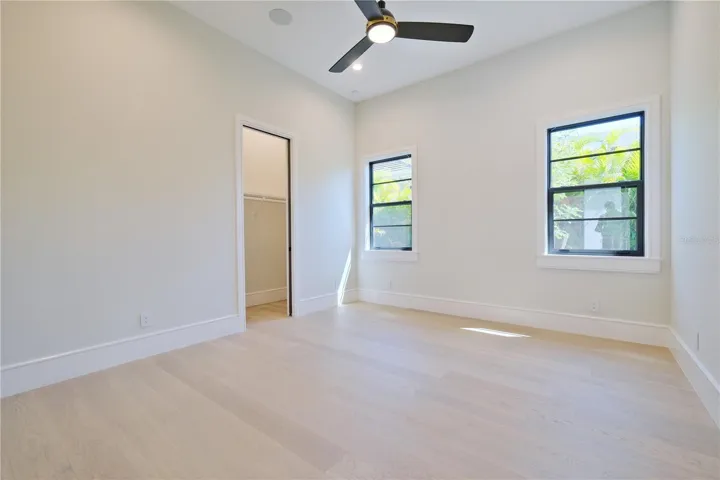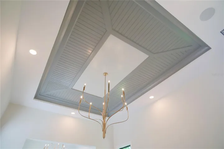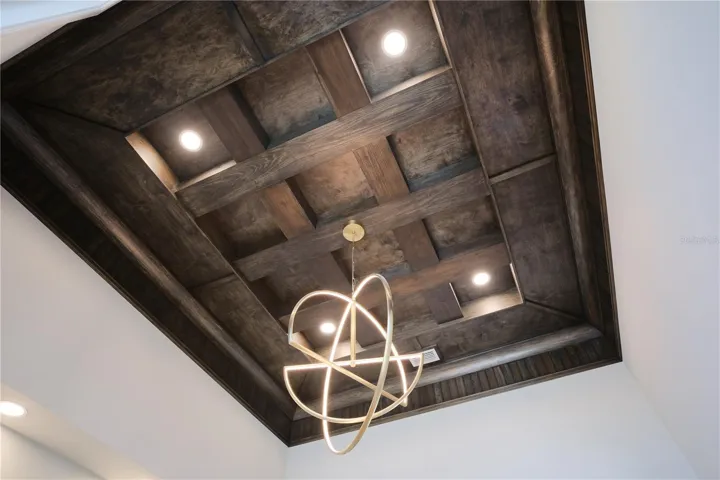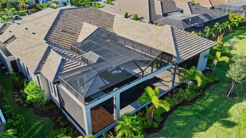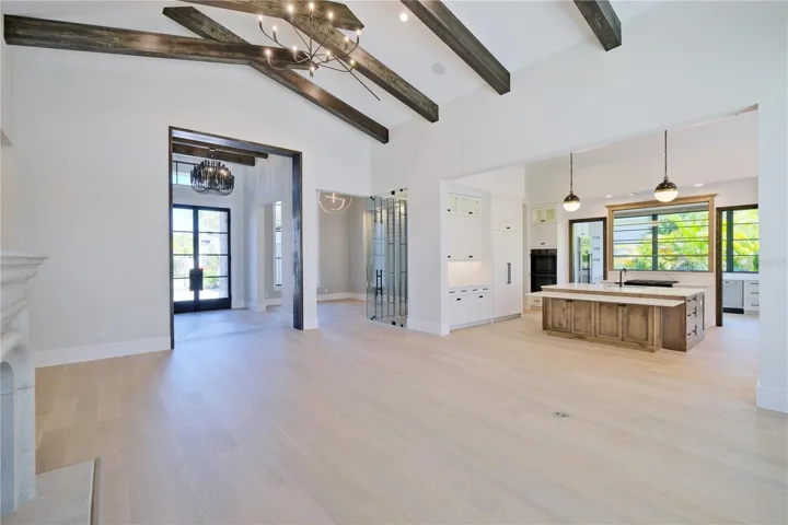 Experience the perfect blend of West Indies architecture with contemporary influences in this brand-new, never occupied custom residence. From the moment you arrive, huge tandem windows, a striking 10-foot custom iron entry door and a symmetrical façade draw your eyes straight through to the breathtaking rear views. Inside, the cathedral ceilings with scissor beams in the great room flow seamlessly to the main lanai and through the expansive pool enclosure. 10-foot accordion stacking doors topped with transom windows open the home to true indoor–outdoor living. A gas fireplace with cultured stone surround and mantle creates a warm focal point, while a climate-controlled wine room with illuminated agate stone panels adds an element of artistry. The home offers both a primary kitchen and a chef’s prep kitchen, each outfitted with high-end appliances. Natural light floods the space through an interior/exterior window and skylights. Two secondary bedrooms each feature en suite baths and walk-in closets. A versatile bonus room includes a disappearing corner door to extend entertaining space to the outdoors. In the owner’s wing, you’ll find dual owner’s baths and closets—each closet with LED pin lighting and custom built-in cabinetry. A private owner’s courtyard with outdoor shower and composite decking creates a resort-like retreat.