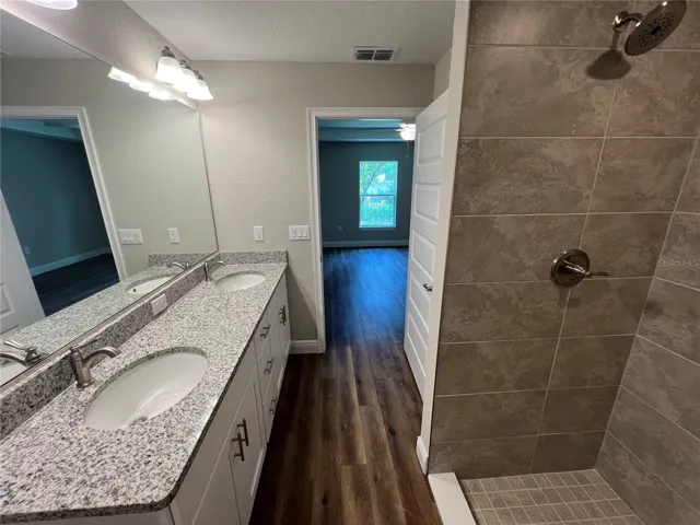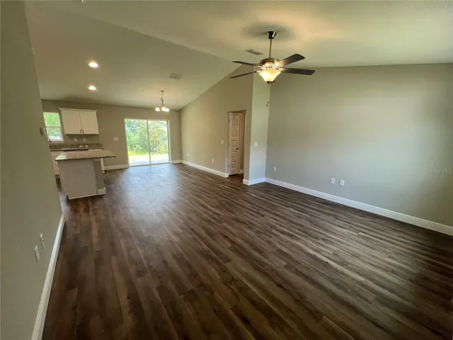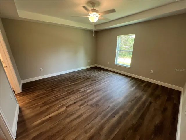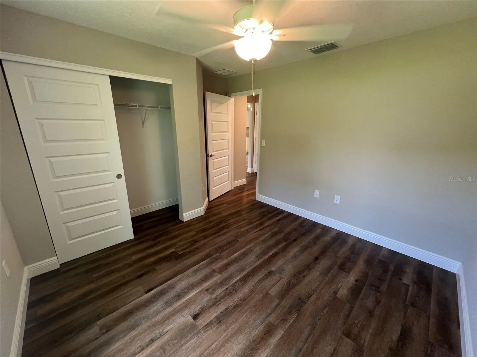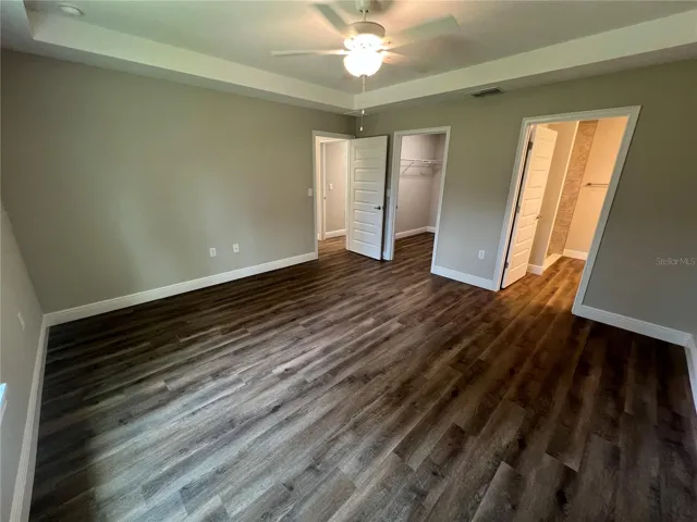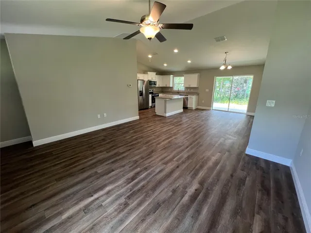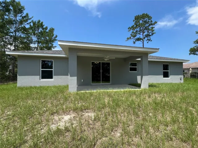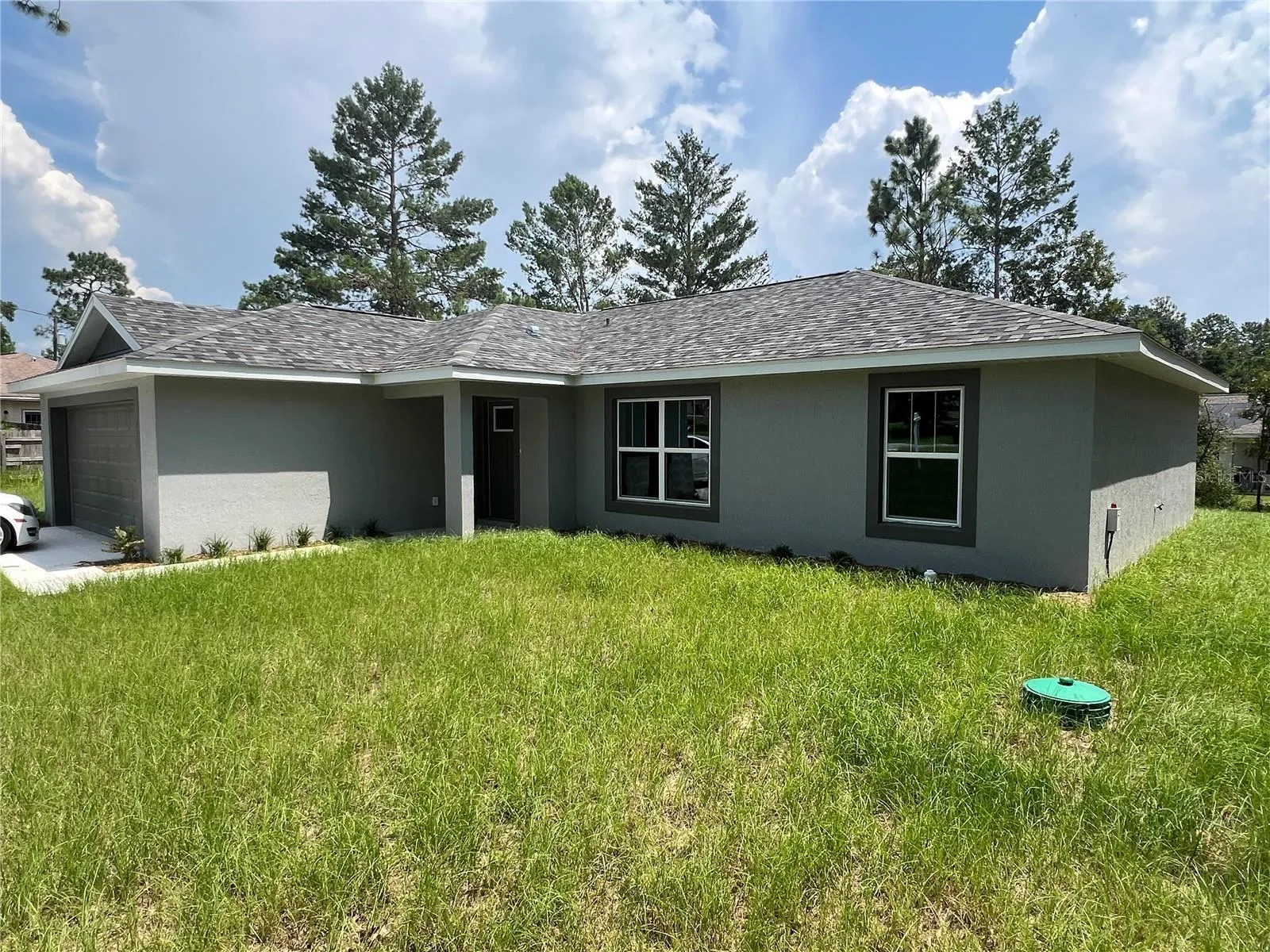 the right. The master suite includes a large walk-in closet and an ensuite bath with a walk-in shower and double vanity. The two additional well-sized bedrooms provide comfort and flexibility for any situation. Step outside to a covered lanai, perfect for outdoor dining or relaxation, right off the kitchen and dining area. This home is perfect for those seeking style and convenience in a desirable Ocala location.