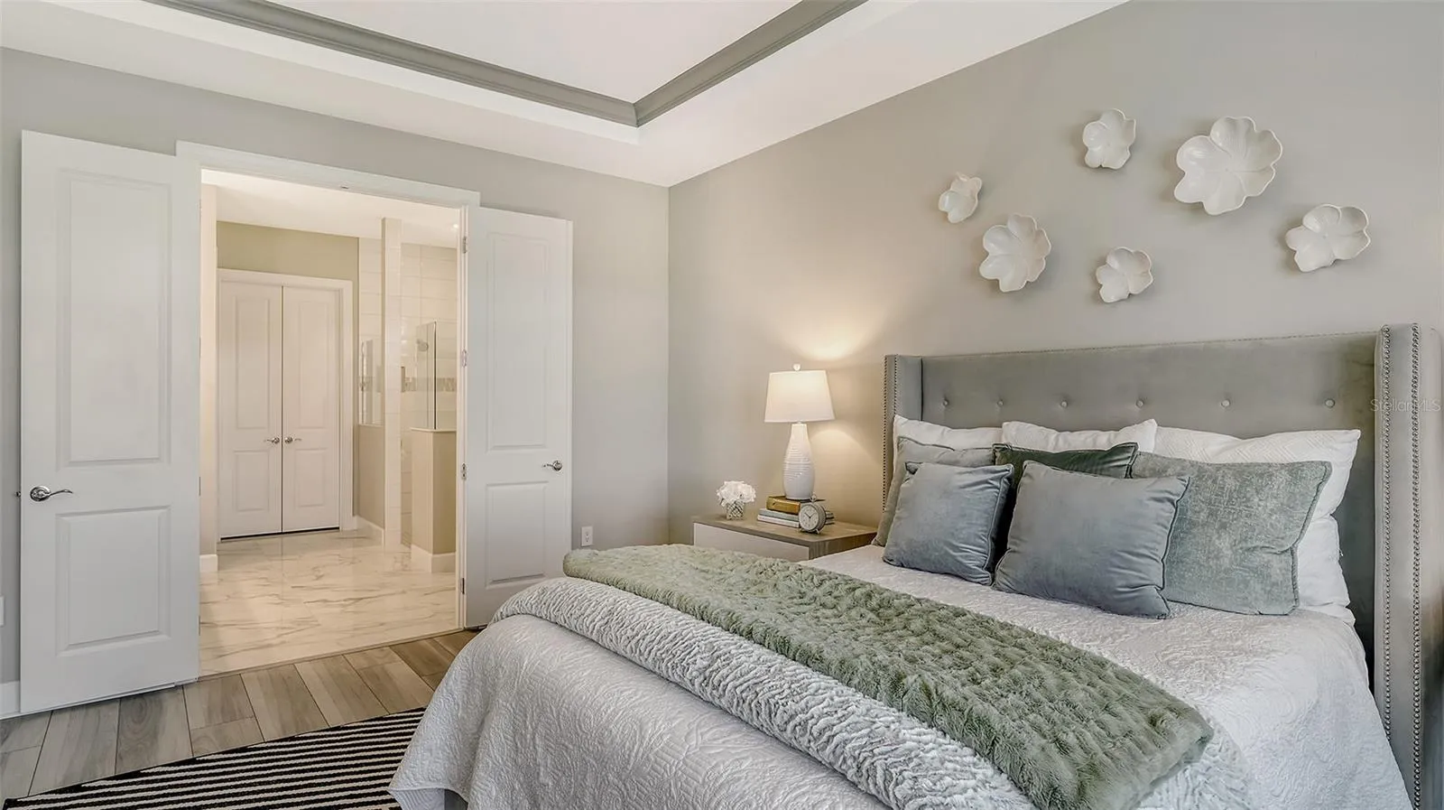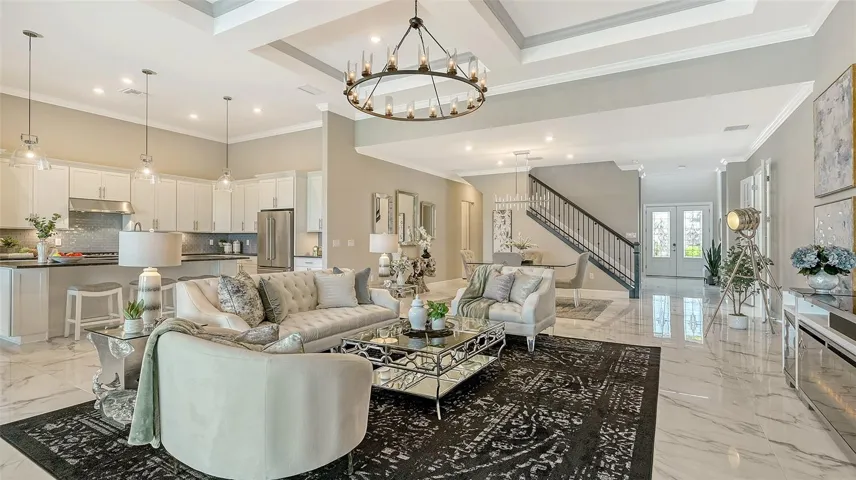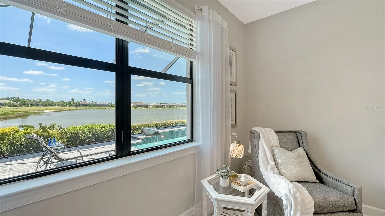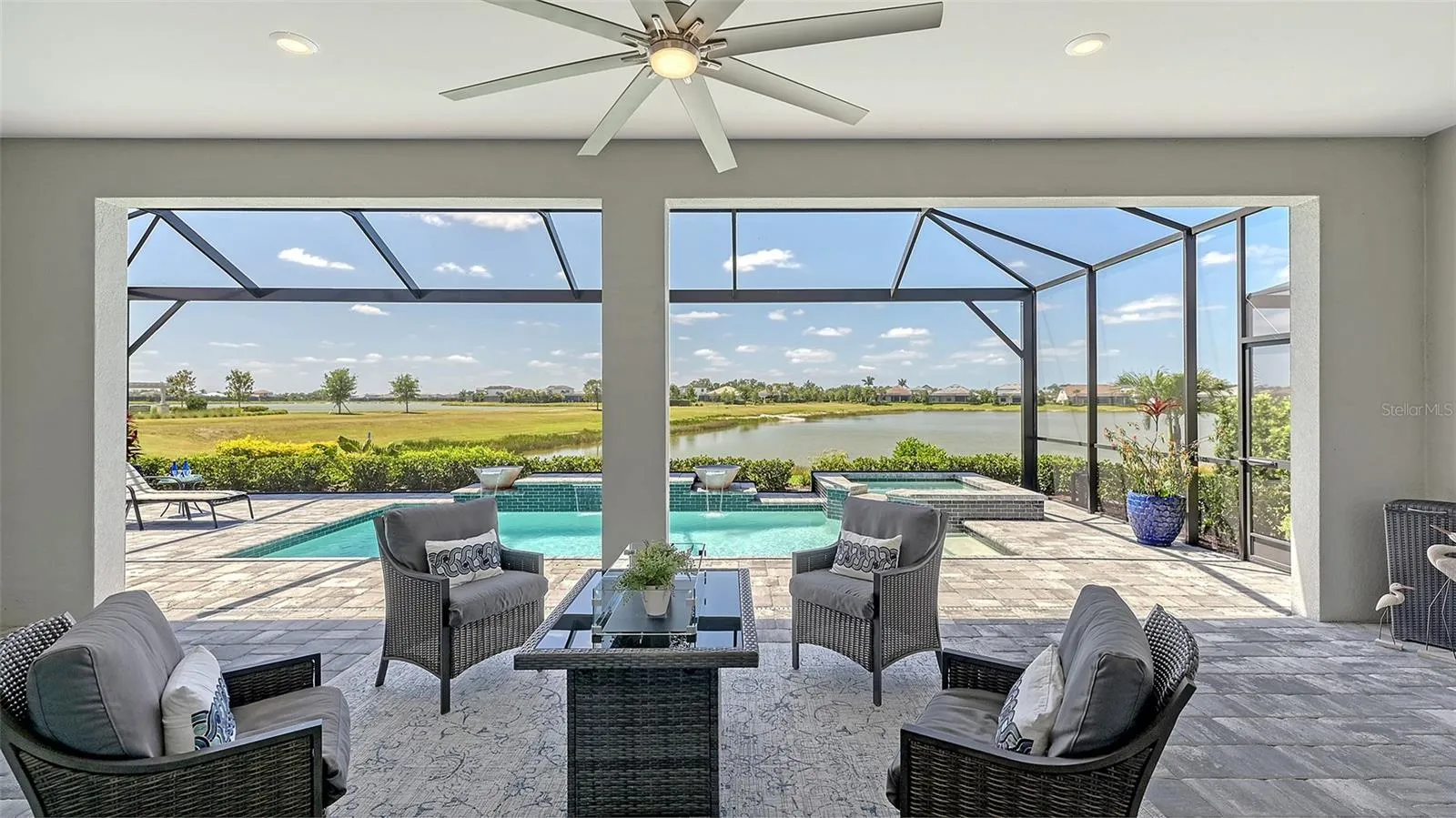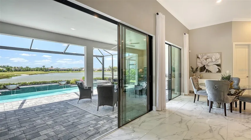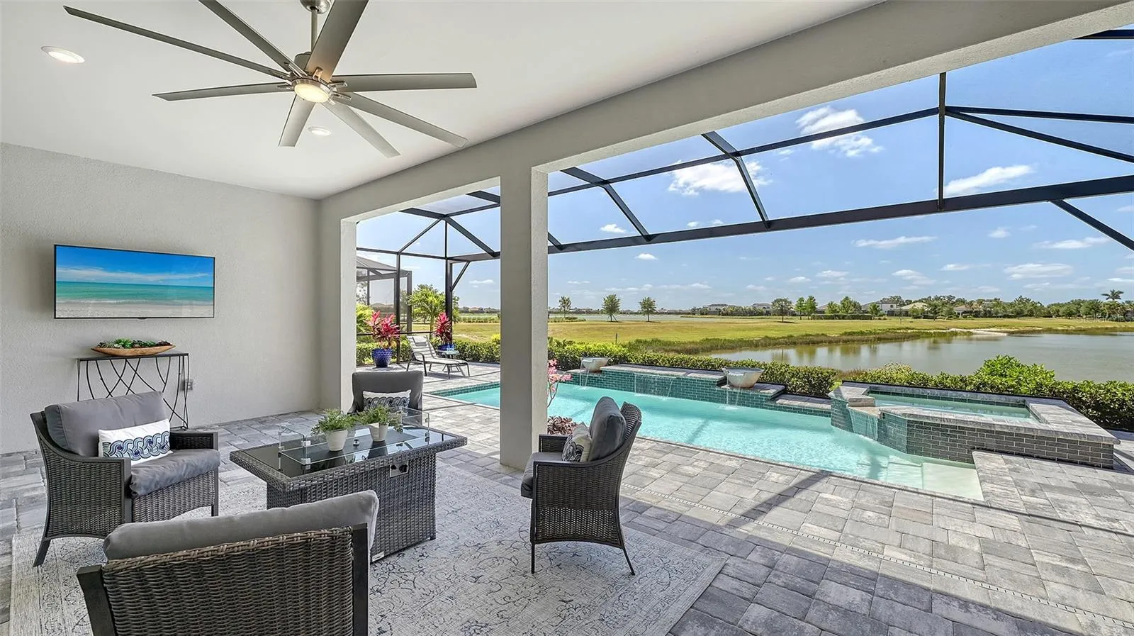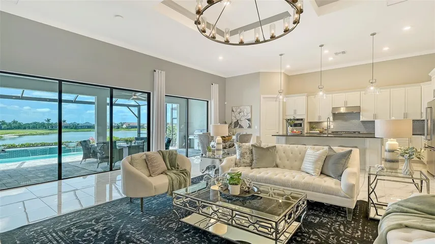 Positioned on a premium south-facing lakefront homesite with tranquil water views, this exceptional residence in Lakewood Ranch Waterside combines luxury, comfort, and versatility in one of the area’s most desirable settings. The main level showcases a thoughtfully designed great room floor plan with soaring volume ceilings, crown molding, and custom coffered detailing, creating an open and inviting atmosphere. The kitchen serves as the heart of the home, featuring a large leathered quartz island with seating, a gas cooktop, stainless steel appliances, and an expansive walk-in pantry. Step outside to an impressive outdoor living space, where a saltwater pool and spa are perfectly screened with clear-view panels, maximizing the expansive lake views. The covered lanai offers generous space for both dining and lounging, creating an ideal environment for relaxation and entertaining. Inside, the primary suite offers a peaceful retreat with a walk-in shower, private water closet, and an oversized dressing room with custom organization. Two additional bedrooms and bathrooms on the main floor provide comfortable accommodations for family or guests, while the second level offers a spacious bonus room, fourth bedroom, and full bath—perfect for visitors, working from home, or recreation. Shoreview residents enjoy resort-style amenities including a clubhouse with pool, spa, indoor and outdoor bar, lakeside dock with kayak launch, tennis, pickleball, bocce, fitness center, fire pit, event lawn, and dog parks. Easy access to Water Taxi to Waterside Place where you can enjoy vibrant shops, restaurants, and events. This residence is also just minutes to Lakewood Ranch Main Street, University Town Center, I-75, highly-ranked schools, premier healthcare facilities, and the pristine white-sand beaches of the Gulf Coast.