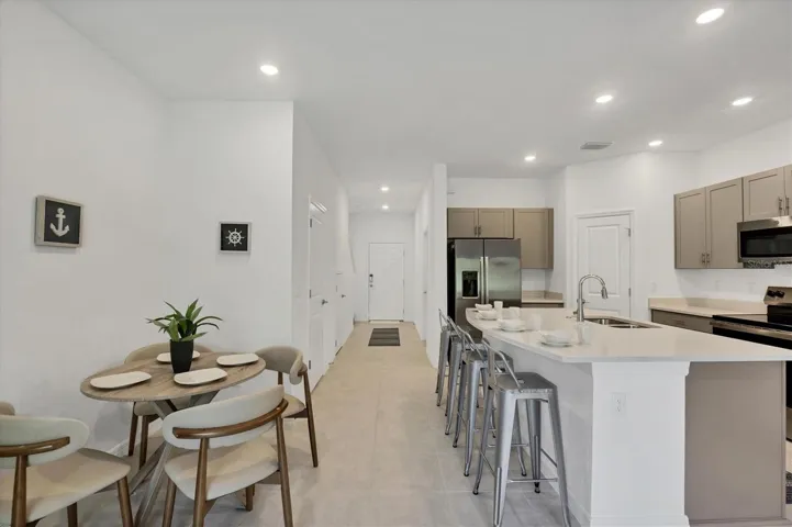 Modern Kitchen – Full-size island, stainless appliances, and open concept design with eat in dinning space.