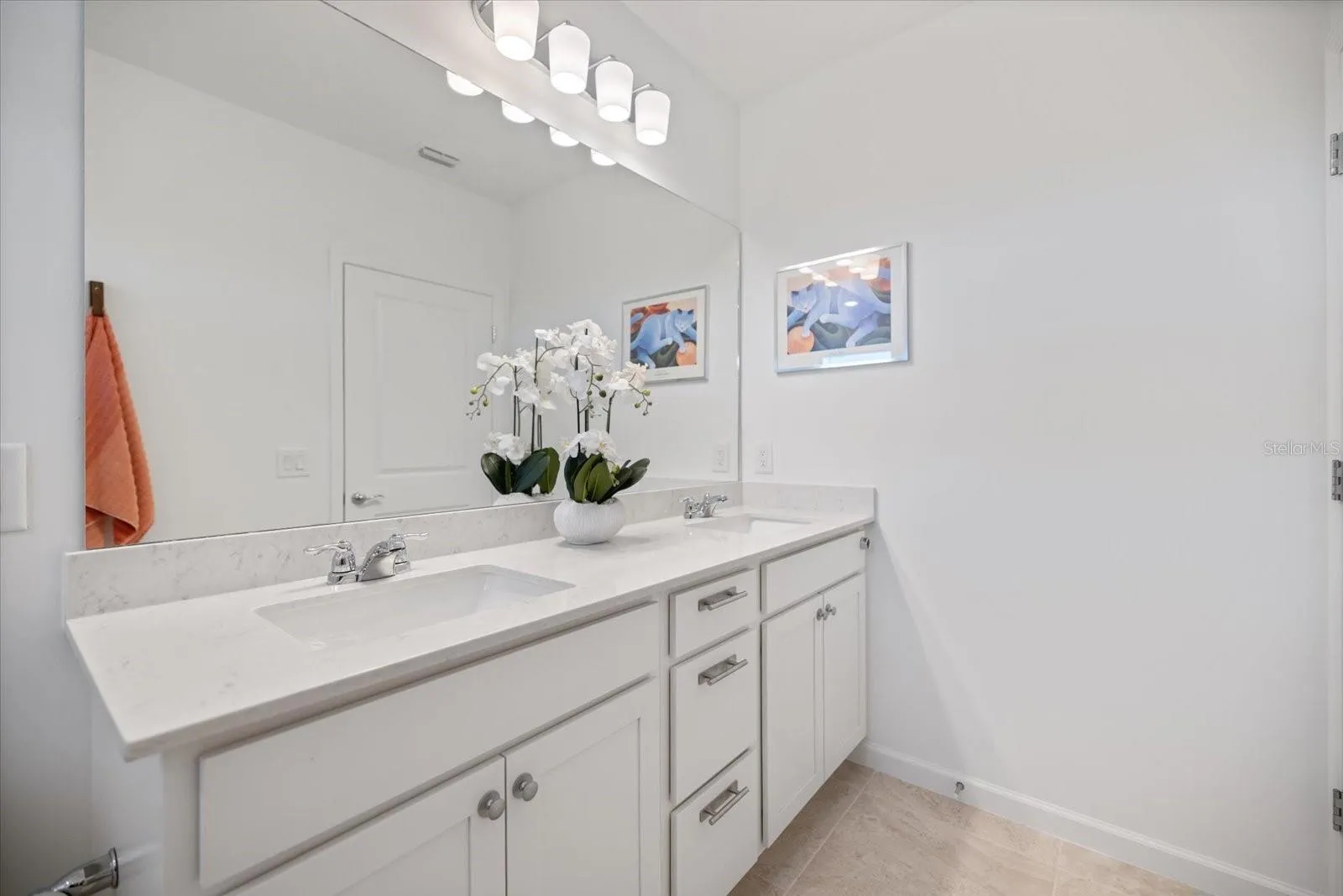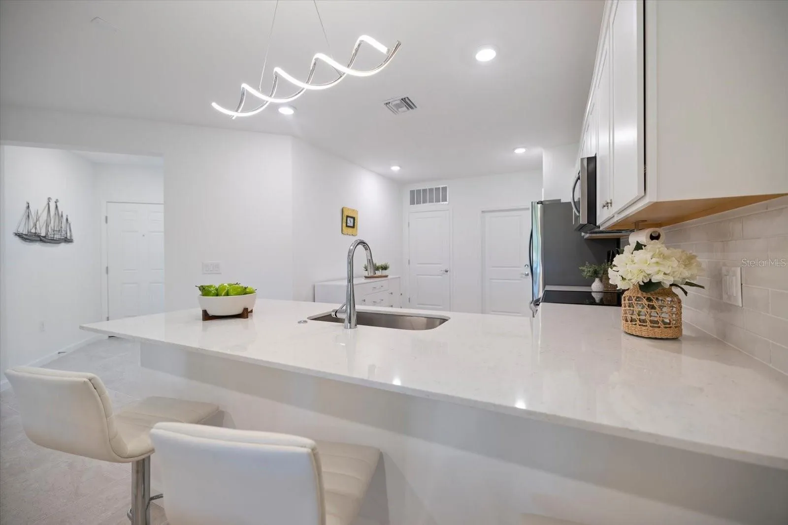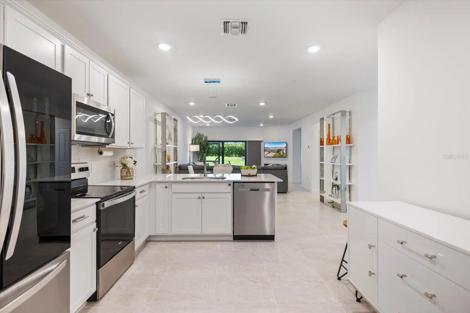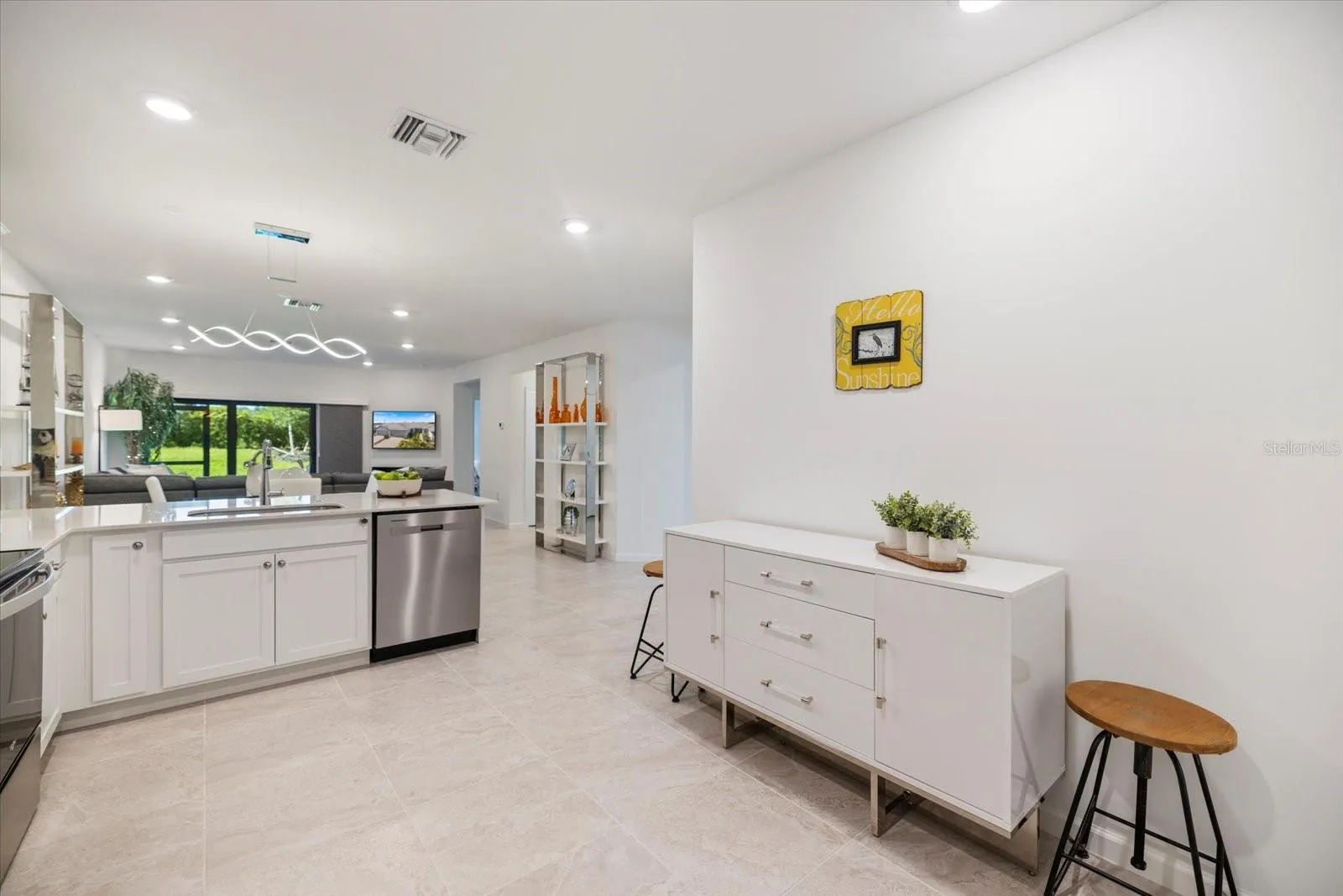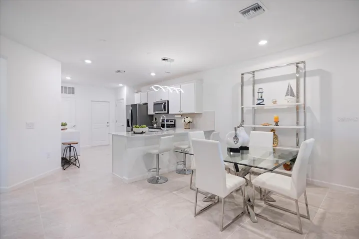 Upon entering, you’ll be welcomed by a spacious foyer that leads to a light and bright, open floor plan adorned with crisp tiled floors. The kitchen serves as the heart of the home, boasting quartz counters, stainless steel appliances, and recessed lighting that adds a well finished touch to your daily routines. Additionally, the home is fortified with hurricane windows and doors, ensuring peace of mind during Florida’s stormy seasons.