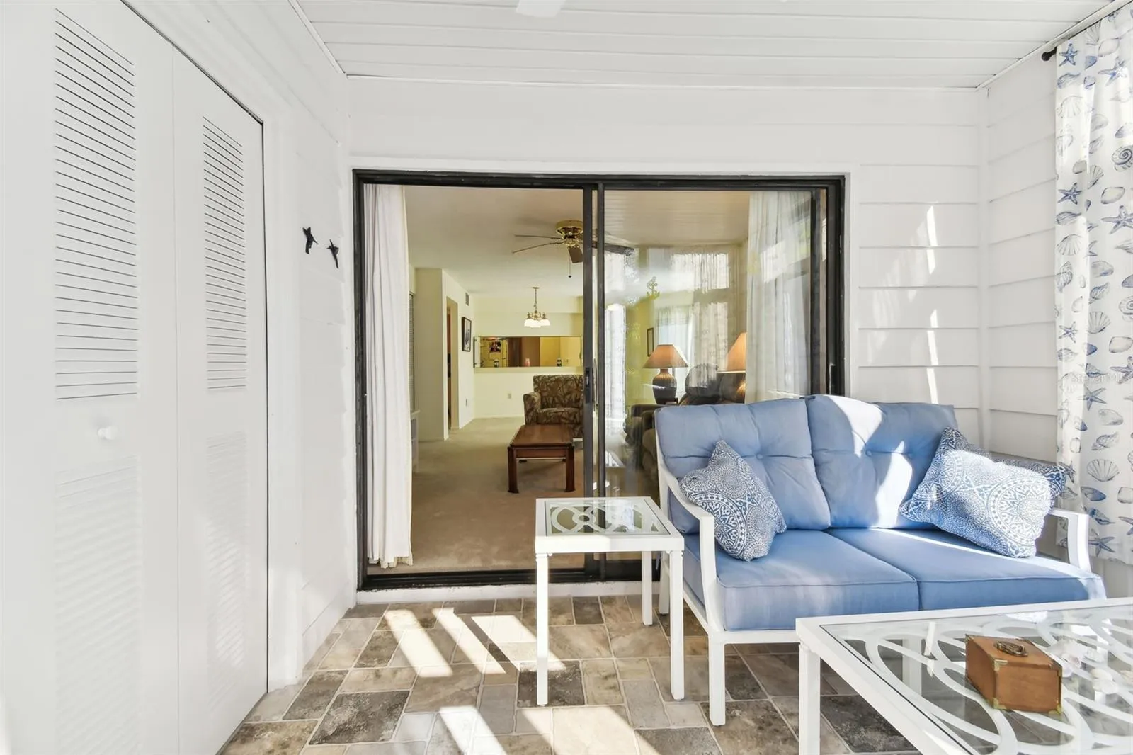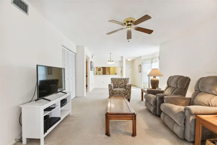 RARELY AVAILABLE FIRST-FLOOR END UNIT with a single-car garage in the highly desirable 55+ community of Country Village! This light-filled 2-bedroom, 2-bath condo offers the perfect blend of comfort, convenience, and peace of mind with thoughtful updates throughout. A charming bay window creates a cozy, welcoming atmosphere, while neutral finishes make it easy to move right in and add your own personal touch. The spacious primary suite features a beautifully updated bathroom with a walk-in shower—perfect for easy living. Guests will also feel right at home with their own tastefully refreshed bathroom. The kitchen includes newer appliances (refrigerator 2022, dishwasher 2024) and a cheerful breakfast nook where you can enjoy morning coffee or casual meals. Major updates already completed include impact windows and front door (2018), A/C (2022), and electrical panel (2022)—giving you peace of mind for years to come. Best of all, the enclosed lanai with its tranquil, park-like views is sure to become your favorite retreat—whether you’re starting the day with a quiet coffee or winding down in the evening with friends.