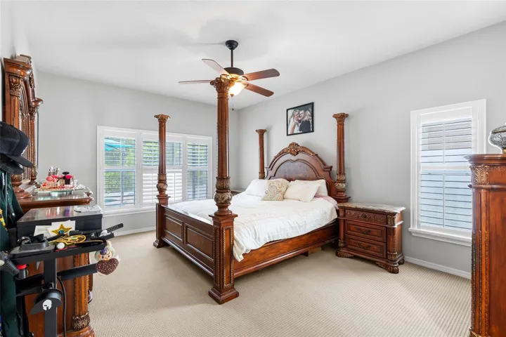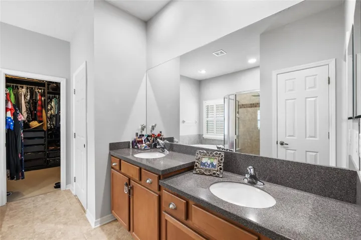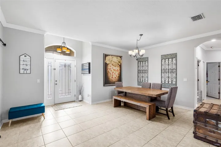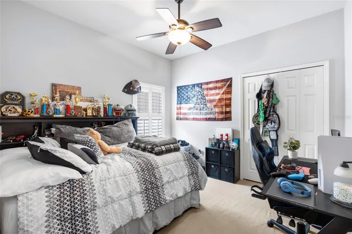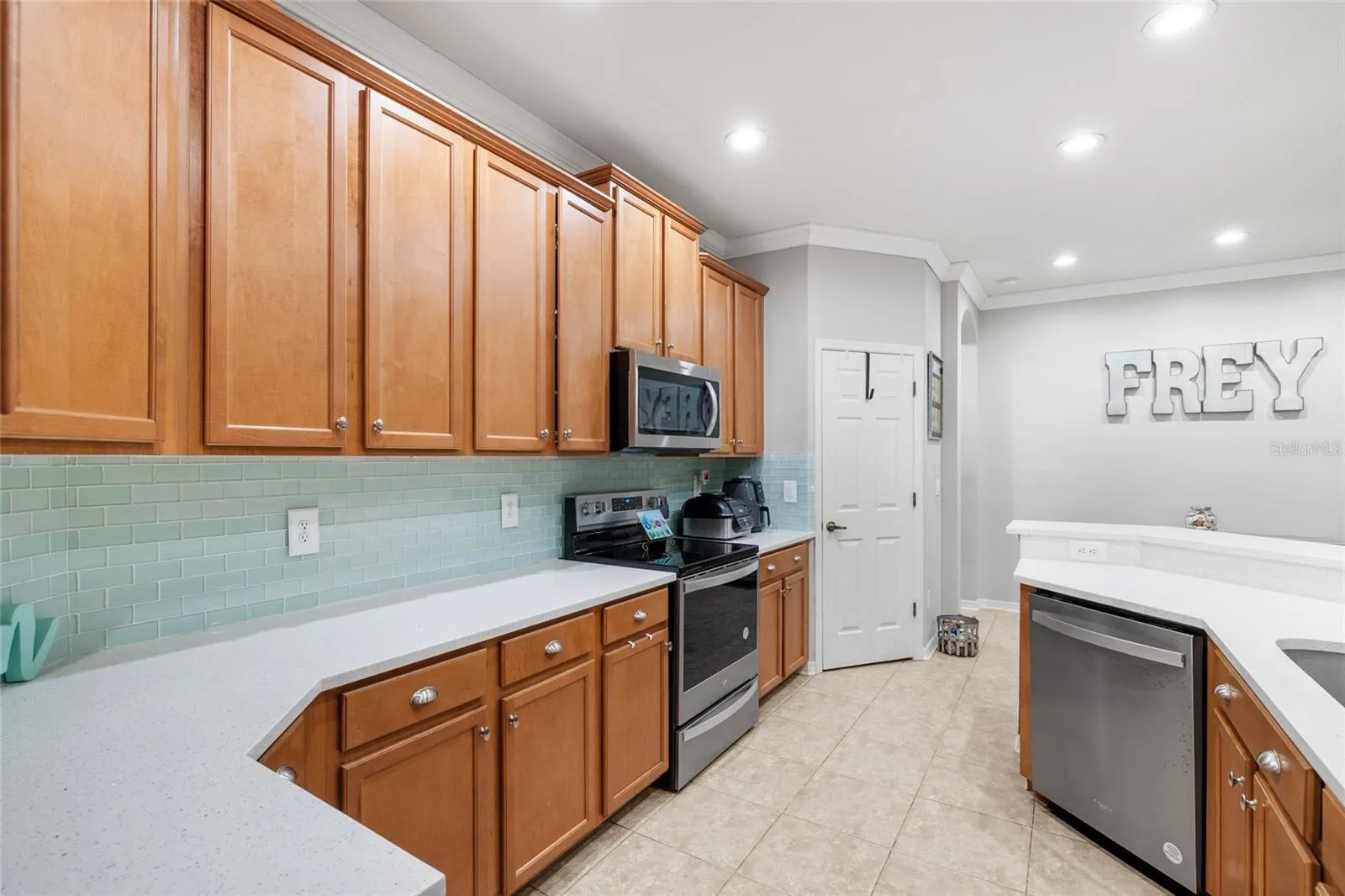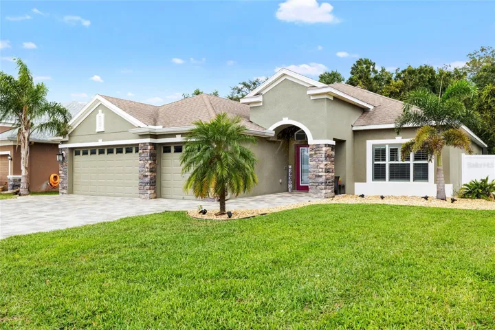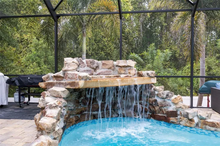 STUNNING HOME WITH STUNNING CURB APPEAL!! This home is a looker and truly looks brand new! Immaculate 4 BEDROOM, 3 bath + OFFICE, 3 car GARAGE home nestled on a gorgeous FENCED CONSERVATION. It is located in a GATED community of Waters Edge. The schools are HIGHLY RATED. Exterior stone has gorgeous accents “country rubble coastal brown” Open floor plan ~ family room, kitchen and breakfast area with views to the screened patio overlooking an enclosed CUSTOM pool with a rock grotto waterfall and hot tub with a serene conservation area. Relax and enjoy the wildlife while grilling in your own cooking area. Kitchen 42″ Maple stagger wall cabinets accented with CROWN MOLDING. Counter tops and newer sink with NEW quarts countertops in kitchen and NEW subway tile backsplash. NEWER STAINLESS-STEEL appliances 2024. Refrigerator 2021. Inside laundry with laundry sink and built in cabinets. Master suite features private bathroom, garden tub, walk in shower, deco tile in all bathrooms, CUSTOM BUILT IN’S – walk in closet and newly added closet. DOUBLE PANE windows. PLANTATION SHUTTERS THROUGHOUT. Ready to move in. NEWER INTERIOR AND EXTERIOR PAINT including new glass door and baseboards. NEW SOD in front yard 2025. Approx 2023 NEW A/C. Security System. Newer smart water heater 2023, owned Water Softener. SCREENED PORCH with slide screening and remote-controlled fan/light. Open patio with PAVERS. 3 CAR GARAGE. Preferred flood zone “X”. NO FLOOD INSURANCE REQUIRED. Resort style 9,000 sq. ft. clubhouse: fitness center; media, game, & large entertaining room; Grand swimming pool at the base of the Lake. Basketball court. Two fishing piers overlooking exquisite spring-fed lake. Reclaimed water 2 x a week, cable and garbage pick-up included. Security. A must to see!
