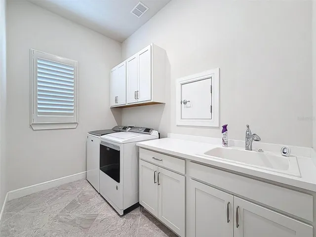 One or more photo(s) has been virtually staged. WELCOME TO THIS STUNNING HOME NESTLED ALONG THE LAKEFRONT IN A RESORT COMMUNITY WITH ENDLESS ACTIVE LIFESTYLE AMENITIES. Built in 2021 by Pulte Homes in a highly desired 55+ community, Marina Isles of Bexley. Perfectly positioned on a peaceful lakefront lot, this home showcases beautiful curb appeal with updated seasonal landscaping, vibrant flowers, and freshly sealed pavers leading to the entrance. Inside, you’ll find an open floor plan with gorgeous sealed tile flooring throughout the main living areas, soft carpet in the bedrooms, and crown molding enhancing both the main living space and the luxurious master suite. The chef’s kitchen is a showstopper featuring a large island, walk-in pantry, recessed can lighting, under-cabinet lighting, soft-close drawers, a gas stove, built-in oven and microwave, and an upgraded mirrored and glass tile backsplash that adds a touch of sophistication. The spacious master suite offers a tranquil retreat with his-and-her closets, dual sinks, a large walk-in shower with a flush floor, and thoughtfully installed grab bars for added safety. Sunburst shutters grace every window and the French doors, enhancing both style and privacy. This home is filled with practical upgrades including Shelf Jennie installations throughout the baths, laundry room, and kitchen, as well as a Blair water softener (leased monthly). Enjoy the beauty of Florida living on the brand-new screened patio (2025), overlooking the serene lake, where you can relax or entertain with ease. The 4-foot oversized 2-car garage with epoxy-finished flooring provides exceptional storage and durability, making it both functional and attractive. With every detail carefully selected, from the recessed lighting to the crown molding, from the thoughtfully designed master bath to the inviting outdoor living space, this home exemplifies comfort, safety, and elegance in equal measure. THE PHOTOS ILLUSTRATE, HOWEVER SEEING THIS PRECIOUS HOME IN PERSON MAY CAUSE YOU TO INSTANTLY FALL IN LOVE. Do not miss an opportunity, schedule your private tour today.