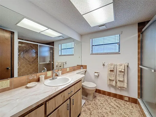 The primary suite boasts a private en-suite bath and a generous walk-in closet, while the guest bedroom and second full bathroom are positioned on the opposite side of the home, providing ideal privacy for family or visitors.