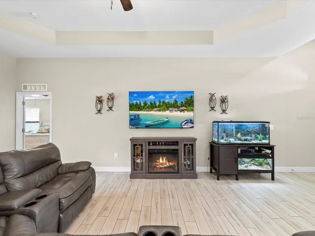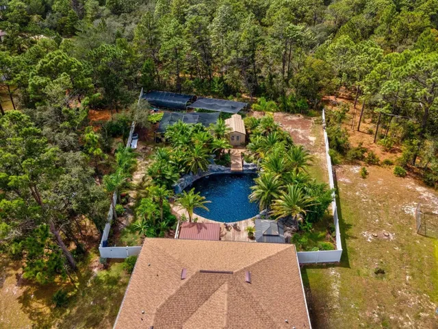 This RESORT STYLE pool makes you feel like you are living everyday on vacation! The beautiful 2021 built home sits on a .55 acre lot with no HOA! 3-bedroom, 2-bathroom home with a den/office, combines luxury living with ultimate outdoor experience! Step inside to find a bright, open floor plan featuring a beautiful kitchen with upgraded cabinets, sleek granite countertops, stainless steel appliances, and plenty of space for cooking and gathering. The home offers a split-bedroom layout, a cozy den or office, and a 2-car garage. But the backyard? That’s where the magic happens. Step outside to your tropical paradise a tropical resort-style oasis designed for serenity and relaxation. Dive into a lagoon-style pool surrounded by lush landscaping, complete with six cascading waterfalls and a tranquil back pond that flows into the main pool. Entertain in style on the huge deck with a gazebo and a full tiki bar featuring two mini fridges, a kegerator, ice maker, and sink, the ultimate setup for parties or peaceful evenings under the stars.