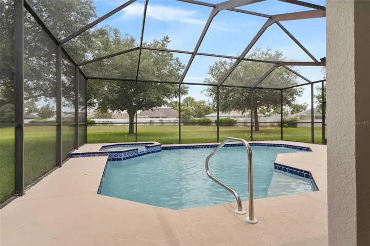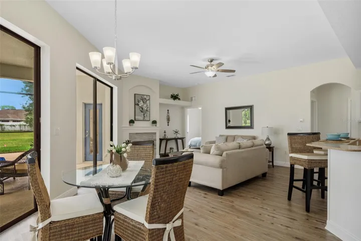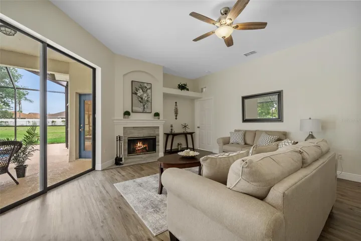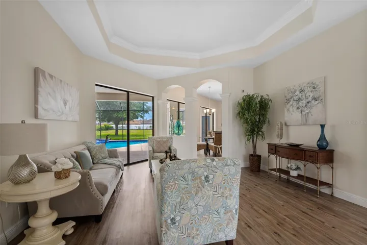 Nestled within the sought-after, gated community of Pristine Place, this stunning residence offers the perfect blend of elegance, comfort, and functionality. Featuring 4 spacious bedrooms (including two master suites), 3 full bathrooms, and a 3-car garage, this home was thoughtfully designed for modern living—and is fully wheelchair accessible for ultimate convenience. Major updates completed in 2022 include a new roof, A/C system, hot water heater, and pool equipment—ensuring long-term comfort and efficiency. Step inside and be immediately captivated by the panoramic pool views framed by 8-foot sliding glass doors. Every corner of this home reflects refined craftsmanship—luxury vinyl plank flooring, oversized baseboards, arched entryways, and tray ceilings create a timeless, elegant atmosphere.The chef-inspired kitchen is a true centerpiece, beautifully remodeled with white solid-wood cabinetry, granite countertops, tile backsplash, and a spacious island with breakfast bar. Stainless steel appliances and a new home warranty offer peace of mind, while the open layout seamlessly connects to the family room—complete with a custom fireplace mantle and more views of the sparkling pool.The primary master suite provides a serene retreat with private lanai access, vaulted ceilings, and dual closets, including a generous walk-in. Its spa-style ensuite features a garden tub, separate shower, and modern finishes. The second master suite is equally impressive, offering privacy for guests or extended family.A versatile flex room adds even more flexibility—perfect as a fifth bedroom, home office, gym, or playroom, depending on your lifestyle needs. Step outside to your private resort-style oasis—a sprawling screened lanai showcasing a sparkling pool with an integrated spa, a built-in outdoor grill, and lush landscaping that creates a tranquil escape for entertaining or unwinding. Welcome home to Pristine Place—where comfort, elegance, and accessibility come together beautifully.