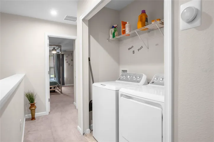The kitchen is the heart of the home, showcasing granite countertops, rich wood cabinetry, stainless steel appliances, and a breakfast bar ideal for casual dining. Upstairs, you’ll find two generous en-suite bedrooms, each with a private bath and ample closet space. The primary suite includes a walk-in closet and dual sinks for added convenience. A laundry area is located upstairs for easy access.