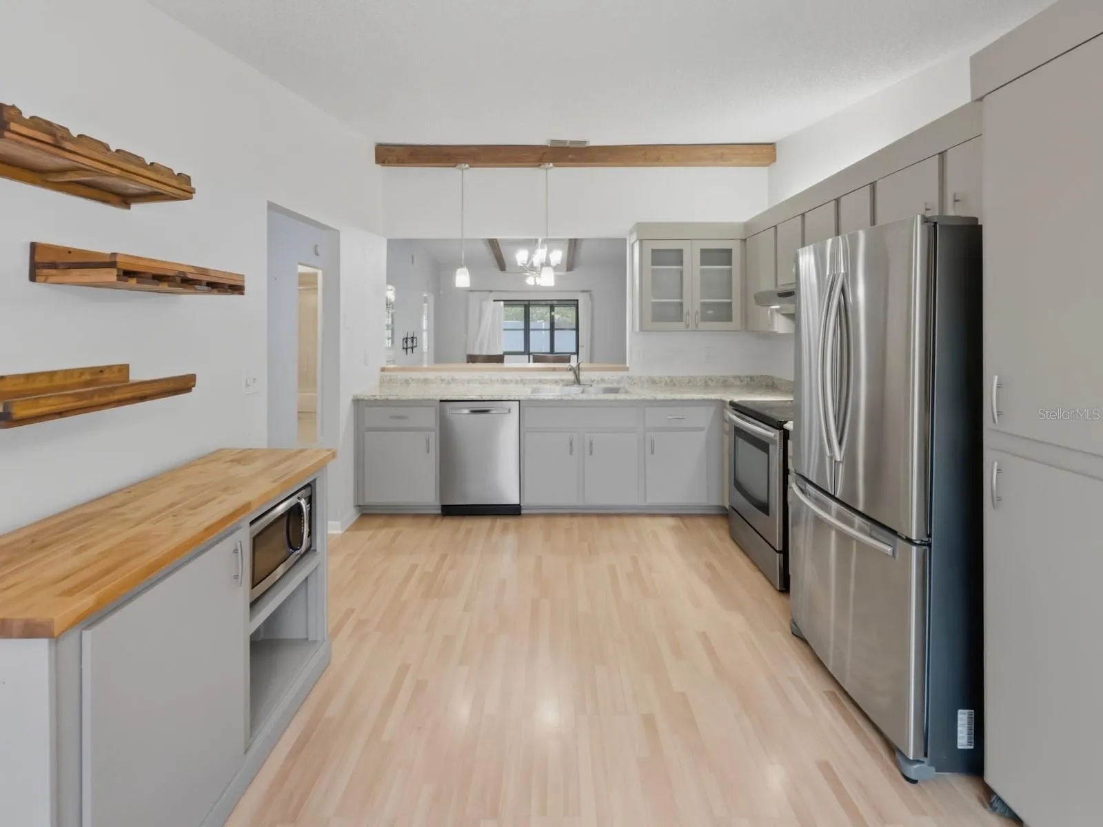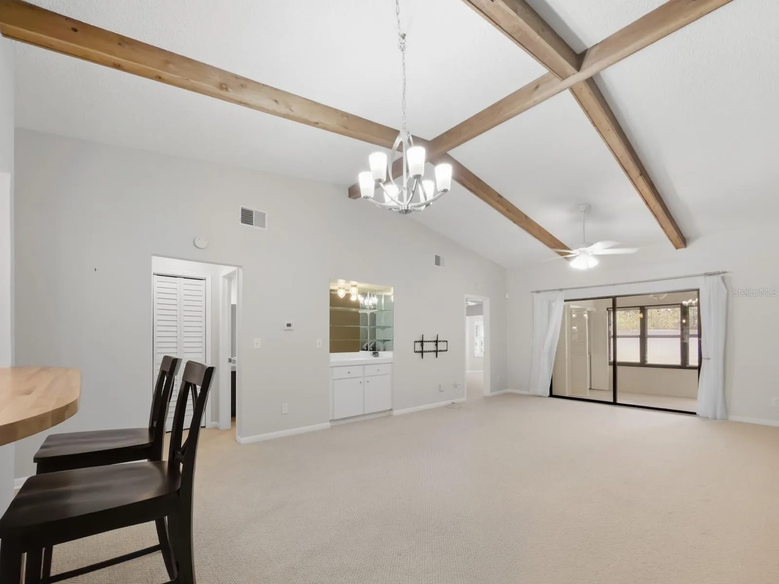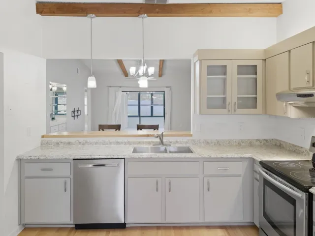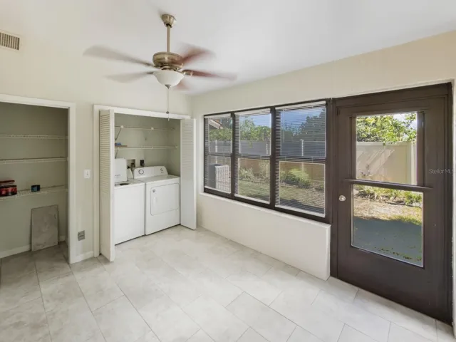 Discover this 2 bedroom/ 2 bathroom single-story villa located in the desirable Forest Lake Condo and Villas—a no age-restriction community where the villas rarely come available. Upon arrival you see the charming front patio with storage closet. Step inside to find a spacious open layout with cathedral ceilings that has wooden cross beams and modern light fixtures. The refreshed kitchen features stainless steel appliances, new cabinet hardware, updated lighting, backsplash, and a cozy dinette area. The breakfast bar overlooks the large dining and living room combo with built-in dry bar adding an extra touch of functionality and charm. Both bedrooms offer walk-in closets and plantation shutters, with the primary suite featuring a private ensuite bathroom complete with a new vanity, upgraded lighting, and a tiled walk-in shower. Through sliding glass doors, you’ll find the fully enclosed Florida room, complete with heating and cooling, expanding your living area to 1,390 square feet. This room also includes both a utility closet and laundry closet with an included washer and dryer. For added peace of mind, the seller is including a 1-year home warranty that covers the recently serviced AC, and all other appliances. The HOA fee covers exterior and grounds maintenance, roof, water, sewer, trash, cable, internet, and access to the community clubhouse, pool, and other amenities—perfect for a low-maintenance lifestyle. One pet up to 25lbs is welcome, and there are no age restrictions. Don’t miss this opportunity—walk the home virtually with the 3D tour and schedule your private showing today and experience carefree living in Forest Lake Condos!