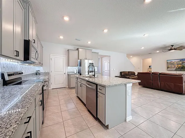 Welcome to this beautifully appointed two-story home in the highly sought-after Barrington neighborhood of Sterling Hill, a resort-style gated community offering amenities for every lifestyle. Perfectly located and thoughtfully designed, this spacious home combines comfort, functionality, and elegance. As you enter the welcoming foyer, you’re immediately met with warmth and a sense of belonging — the perfect place to hang your hat. To the right, a versatile flex room currently serves as a home office, but the possibilities are endless: playroom, formal dining, hobby space, or even a fifth bedroom. The heart of the home is the expansive, open living area, where the gourmet kitchen steals the show. Featuring gleaming granite countertops, a full suite of stainless steel appliances, a large pantry with ample shelving, and abundant cabinet space to tuck away small appliances, this kitchen is a chef’s dream with an oversized pantry. The adjacent dining area comfortably accommodates a six-to-eight-seat high-top pub table, perfect for casual dining or family gatherings. Flowing into the spacious great room, you’ll love entertaining or relaxing here — whether it’s after Thanksgiving dinner, game day, or a cozy movie night. Open the sliding glass doors and let the Florida breeze in for true indoor-outdoor living. Also on the main level is a private bedroom with an en suite full bathroom, perfect for guests or in-laws who prefer to avoid stairs. Head upstairs to a bright and airy family room — a great second living area, playroom, or teen hangout. The oversized main bedroom offers a peaceful retreat, large enough for a king-size bed and still offering plenty of room to spare. It features two walk-in closet and a luxurious en-suite bathroom with double sinks, soaking tub, a walk-in, upgraded tiled shower with glass doors. You also have two other oversized bedrooms on this level. Your laundry room is oversized and upstairs. Outdoor Living at Its Best! Step through the sliding doors to your covered lanai — the perfect place to sip morning coffee, read a book, or fire up the smoker or Blackstone grill. Enjoy sunrise views from the east and sunset skies to the west, all from your backyard. For added convenience, the home includes a three-car garage with openers and plenty of parking, ceiling fans and many other features that your tour will allow you to discover. These thoughtful details are best appreciated in person, so come see all this home has to present. The Sterling Hill community offers unparalleled amenities. Barrington neighborhood is one of the most sought-after places to live. This awesome gated community is the right size to build lasting friendships and small neighborhood events. Affordable HOA & CDD Fees. Barrington offers exceptional value with low fees for a gated community packed with amenities. Schedule Your Tour Today! This move-in ready home is better than new construction and available for quick closing before the holidays. Qualifies for first-time buyer programs, special financing, and grants (to eligible buyers). Open daily until SOLD – Don’t miss out! Call now to book your private showing.