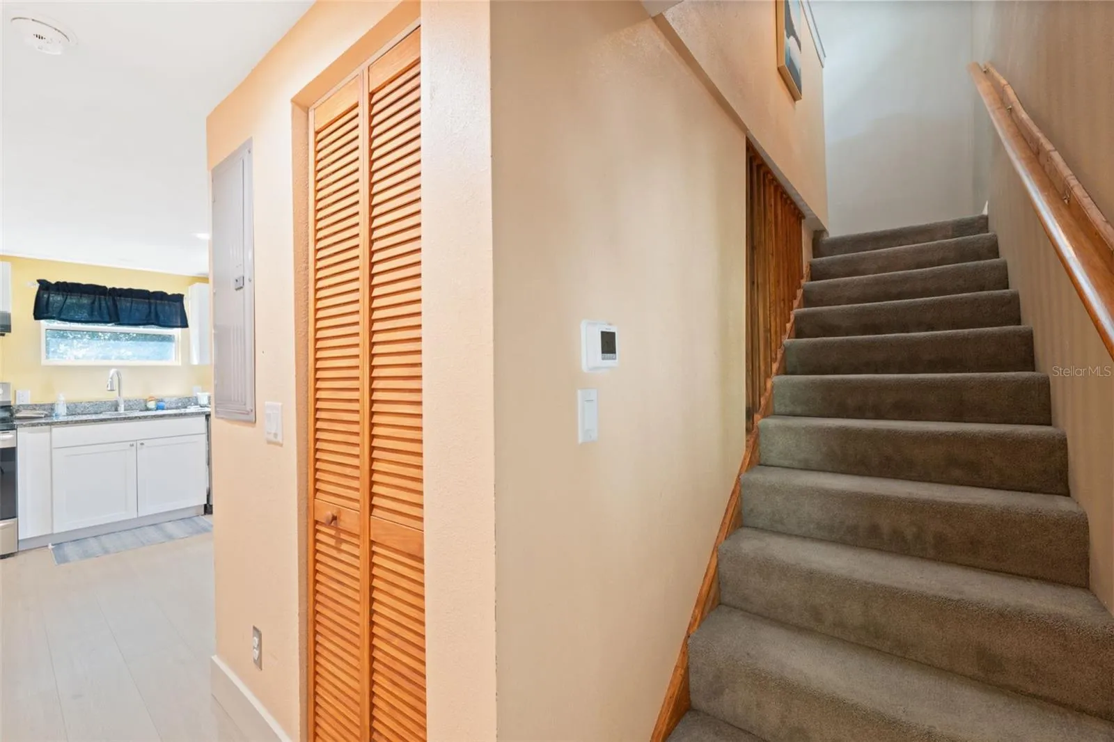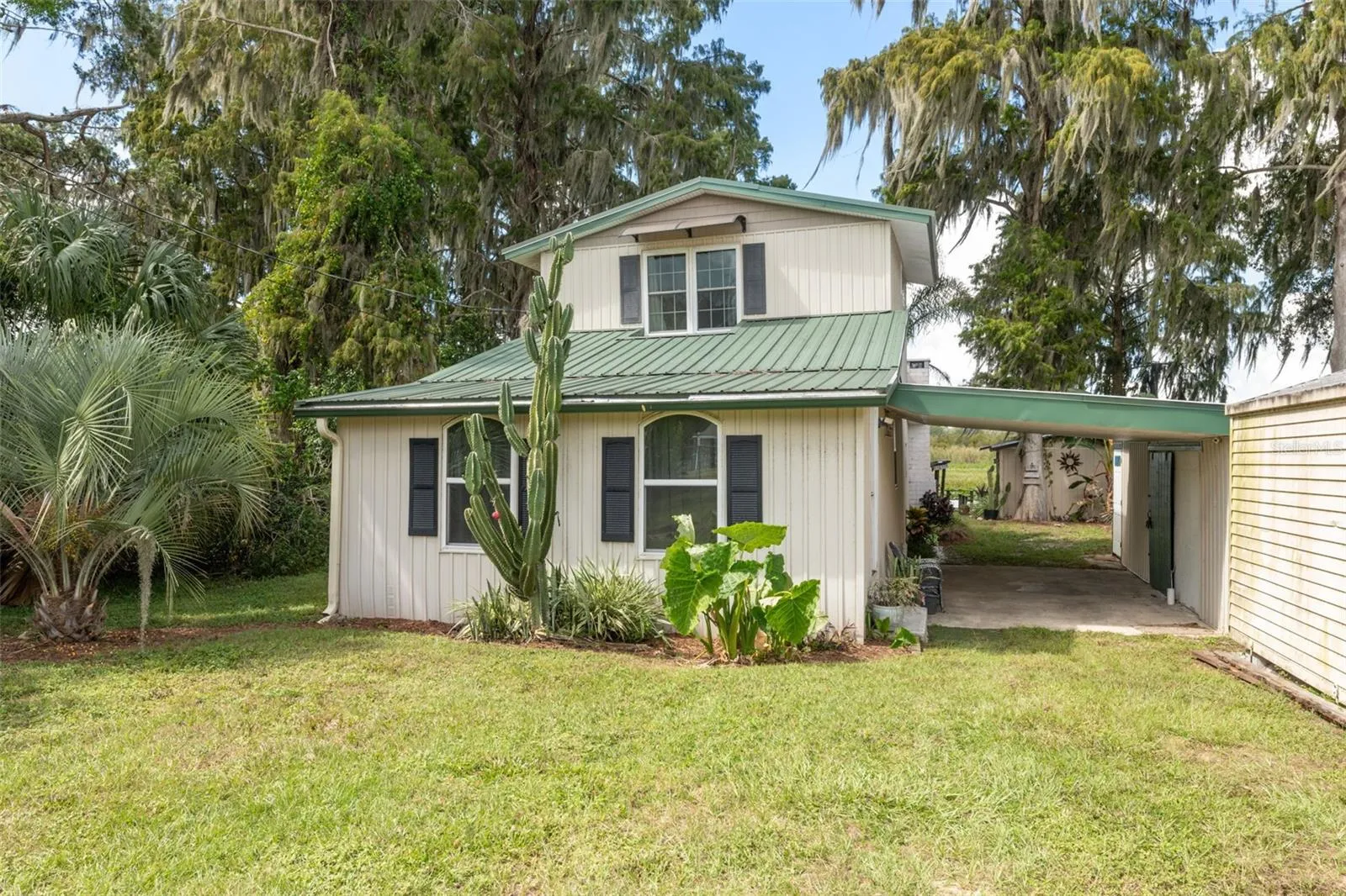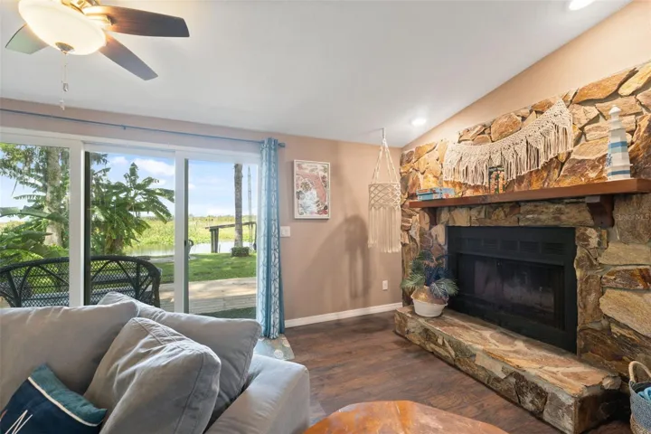 Nestled along the tranquil waters of Lake Rousseau, this inviting two-story home offers a perfect blend of comfort, functionality, and waterfront serenity. The charming white exterior with green accents and a durable metal roof is framed by a fully fenced yard, opening to breathtaking water views. Step inside to a spacious foyer that can easily adapt as a flex space, leading into a beautifully updated kitchen with white cabinetry, granite counters, stainless steel appliances, and a generous pantry. The open dining area flows seamlessly into a warm living room featuring a stunning stone wood-burning fireplace and sliding glass doors that fill the room with natural light and lead to a partially covered patio overlooking the water. Upstairs, the primary suite provides a private retreat with a walk-in closet and a covered balcony where you can take in peaceful views of the lake. Outdoors, enjoy a large wooden patio, stone seating area, covered boat slip and dock with electricity—perfect for boating and sunset relaxation. A detached guest suite with its own full bathroom offers privacy and versatility for visitors or potential rental use, while the carport and shed provide practical convenience. Nearby attractions include the crystal-clear waters of Three Sisters Springs, a haven for manatee viewing and kayaking; Hunter Springs Park, ideal for swimming and picnics; and downtown Crystal River, known for its quaint shops, local dining, and vibrant waterfront lifestyle.
