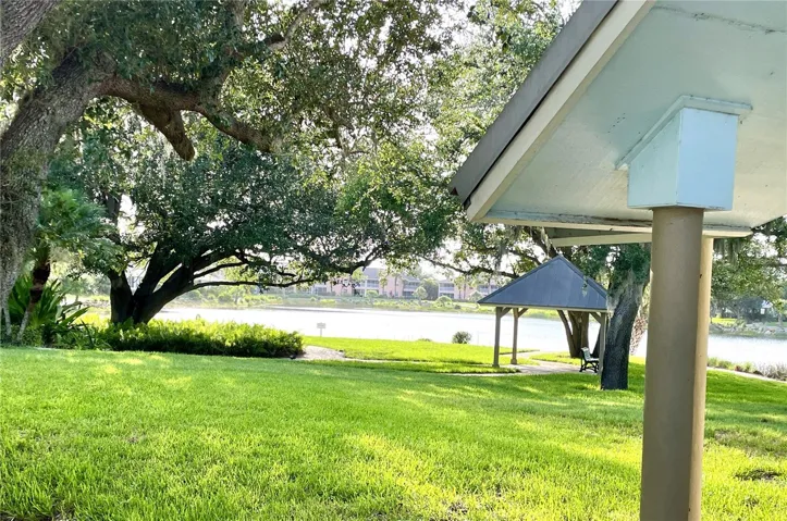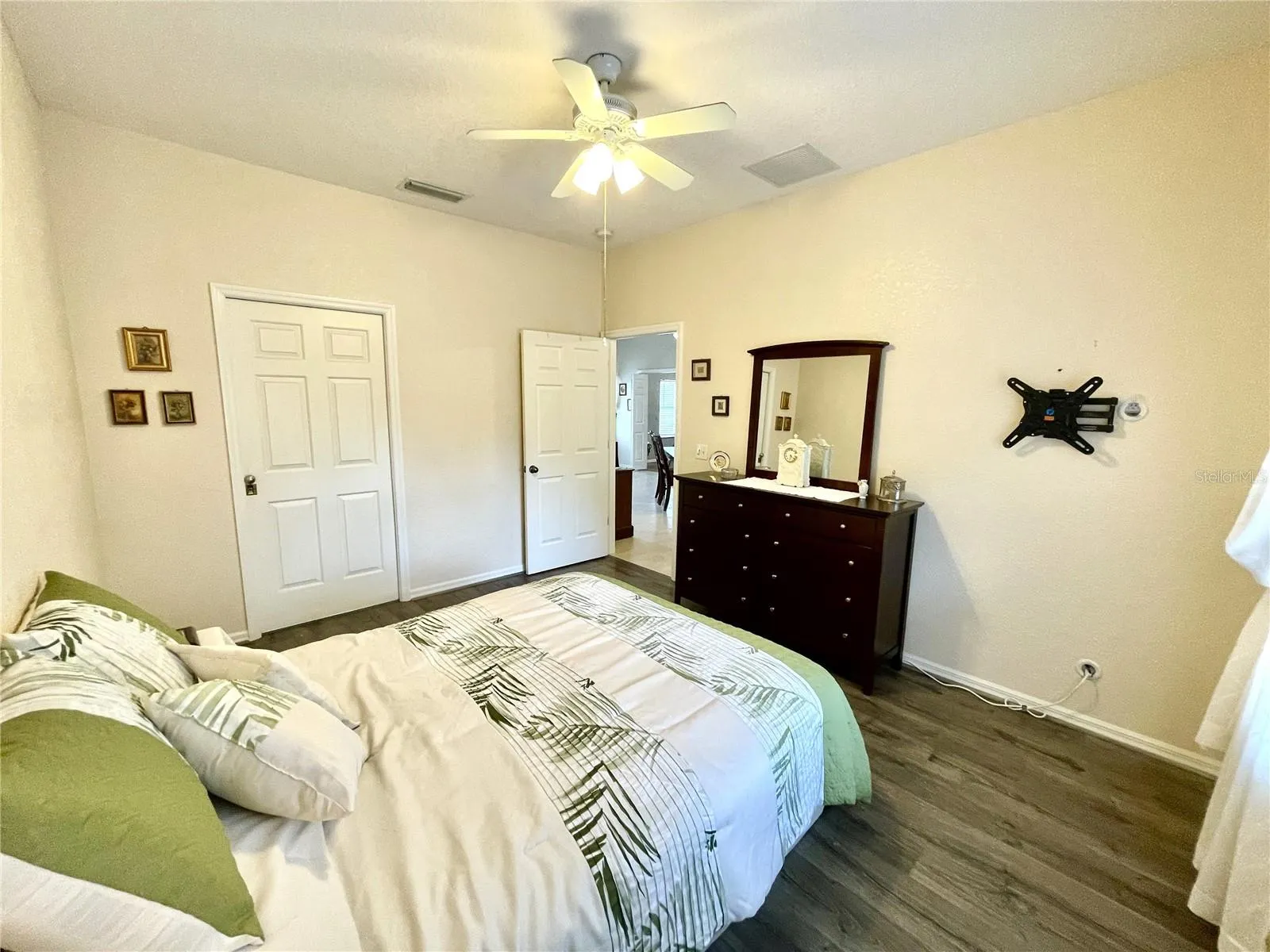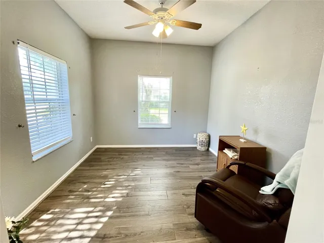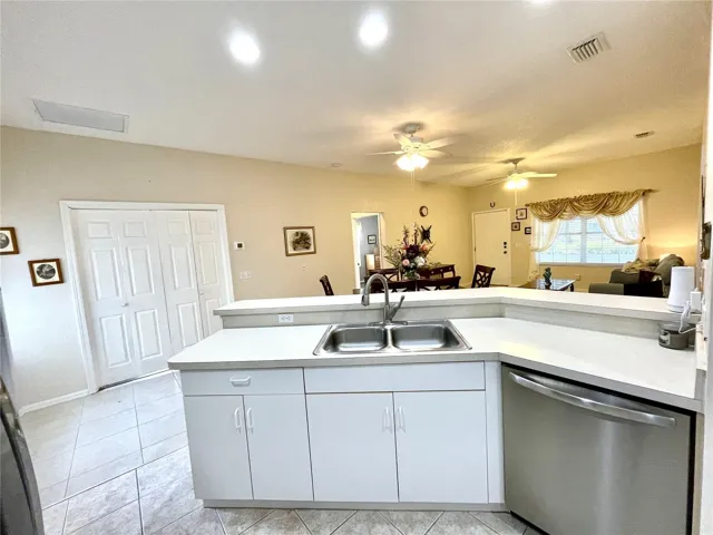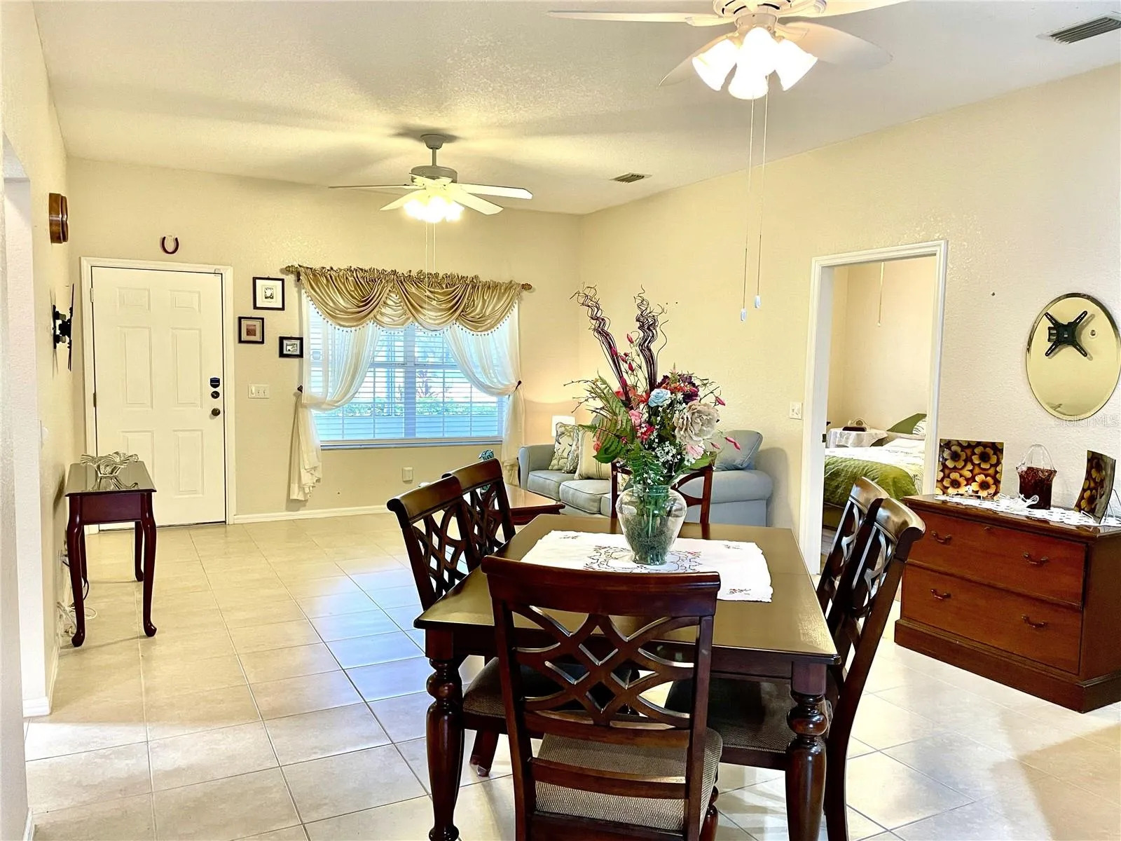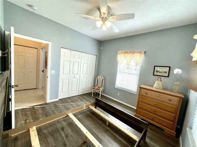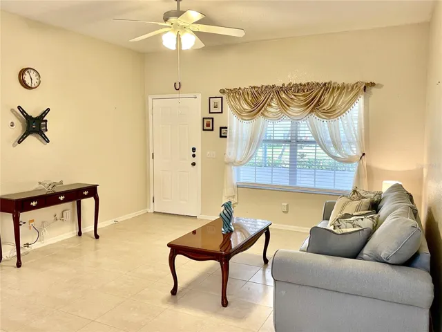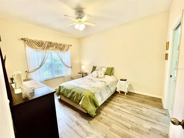 Beautiful 1190sf 2/2/2 split floorplan villa in the lovely gated community of Heritage Oak Park. This community is designed around the Heritage Oak trees. The unit lives light, bright and comfortable with the open floorplan and many windows. Being sold TURNKEY FURNISHED, minus the mattress in the 2nd bedroom. Entering at the front of the home through the spacious lanai that overlooks the front yard, you see the open shared living space of the Great room/Dining space, and Kitchen. There are high ceilings and nice updates throughout, including ceiling fans, tile and LVP flooring, blinds and a privacy screen added to the large garage door. The dishwasher, disposal, and stove replaced 2022, interior painted 2023, A/c system 2025, thermostat 2023, lanai screens and tile flooring 2023. lanai posts 2016. The roof was replaced in 2017. The bedroom furniture for both rooms was purchased in 2023. The Kitchen has light cabinetry and counters with a foil backsplash, stainless appliances, closet pantry, and overlooks the Dining area into the Great room past the breakfast bar. The Primary bedroom is off the Great room. It overlooks the front yard and has a large walk-in closet. The bathroom has a large vanity with 2 sinks. The toilet and walk-in shower are in a separate part of the bathroom. The guest bedroom and bathroom are on the other side of the home. The guest bedroom also overlooks the front yard. There is a tub/shower in the Guest bathroom and a large linen closet in the hallway. The Bonus room/Den is off the Kitchen. Double doors were added offering privacy. The Laundry is located in the garage. The laundry sink was installed in 2023. The garage has a ceiling fan and windows in the large garage door allowing in natural light.