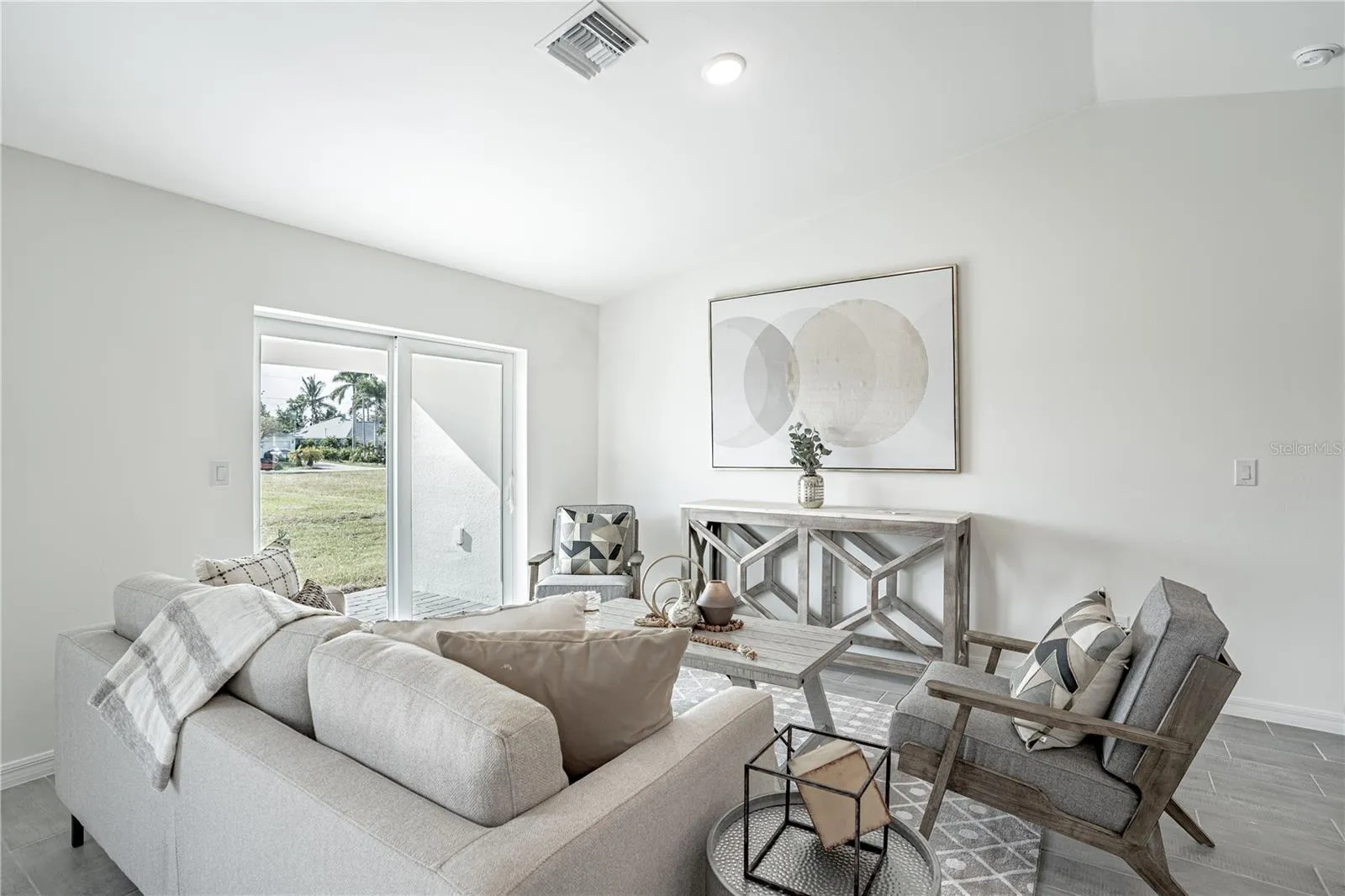 NEW BUILD – MOVE IN READY. SPECIAL INCENTIVES: Up to $20K Towards Closing Cost/Prepaids*; OR Huge Rate Buy Down* 2.99% Year 1, 3.99% Year 2 & 4.99% Years 3-30 FHA/VA Loan + Up to 7K in Closing Cost Prepaids when using Preferred Lender. The 1,426 -square-foot (air-conditioned) Windsor plan boasts a well-designed open floor plan that includes four bedrooms, two bathrooms, and a two-car garage. The kitchen boasts upgraded 30” contemporary shaker-style cabinets, a spacious kitchen island with upgraded quartz countertops, Whirlpool dishwasher, microwave, and range, refrigerator, washer & dryer. The Kitchen overlooks a spacious great room that features beautiful tile-plank flooring and vaulted ceilings. The expansive owner’s suite features a private bathroom, with a separate linen closet, and large walk-in closet. The three guest bedrooms share a guest bathroom and are located opposite the owner’s suite. The Windsor also features a decorative brick paver driveway, a professionally designed landscaping package, and designer-selected paint colors, light, and plumbing fixtures, impact resistant window and doors.